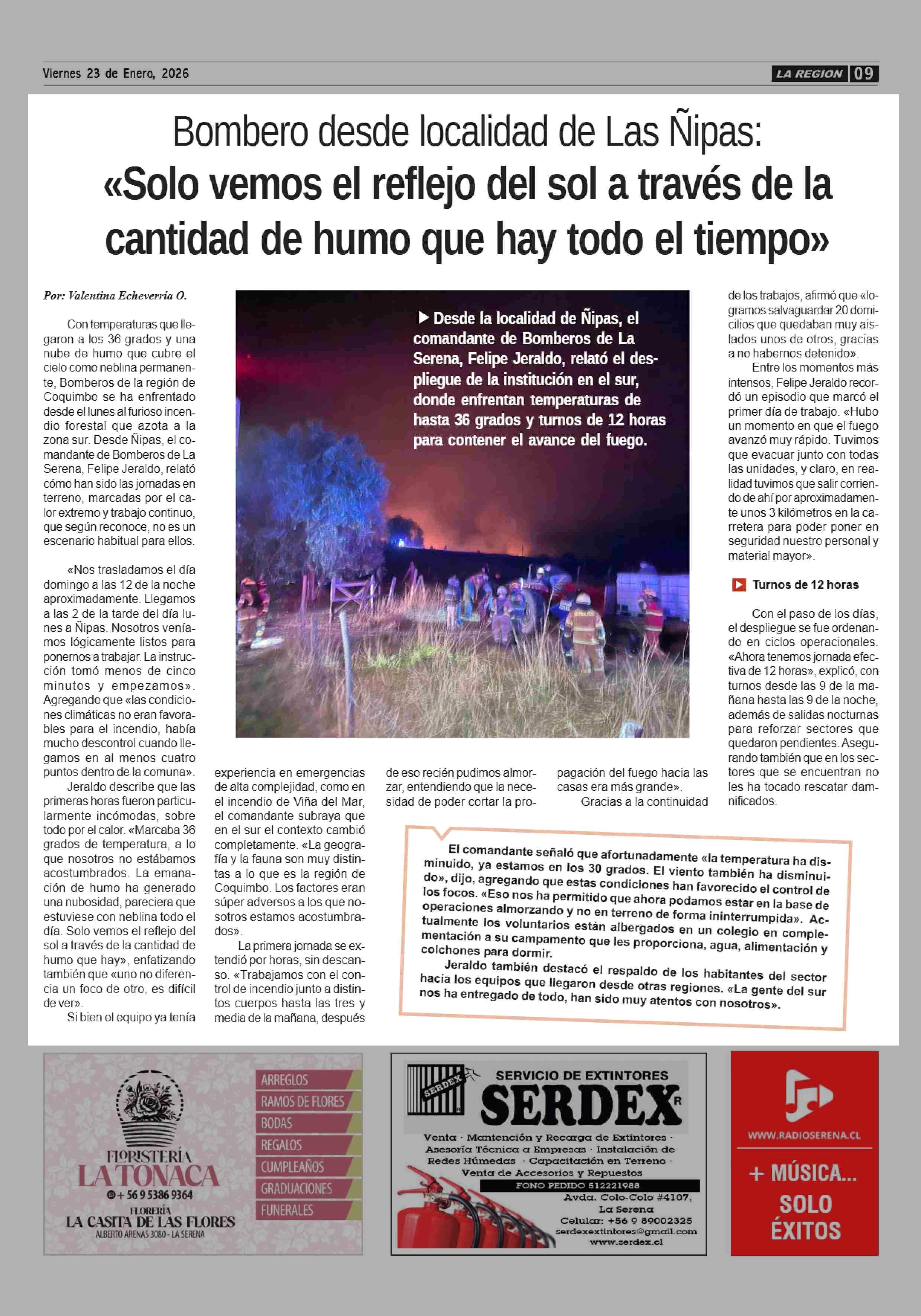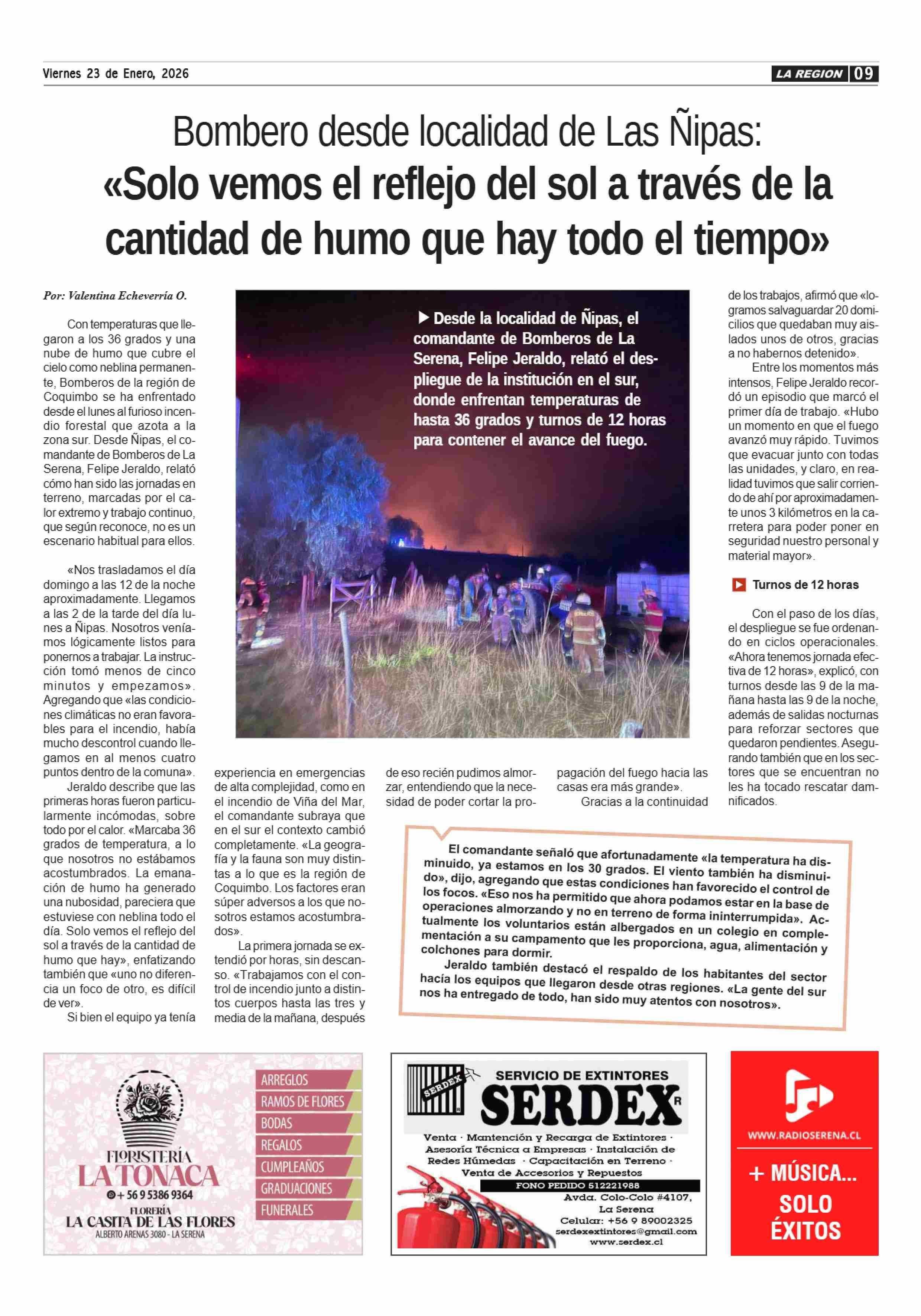 Bombero desde localidad de Las Nipas: «Solo vemos el reflejo del sol a través de la cantidad de humo que hay todo el tiempo» 23-01-2026 Diario la Región |