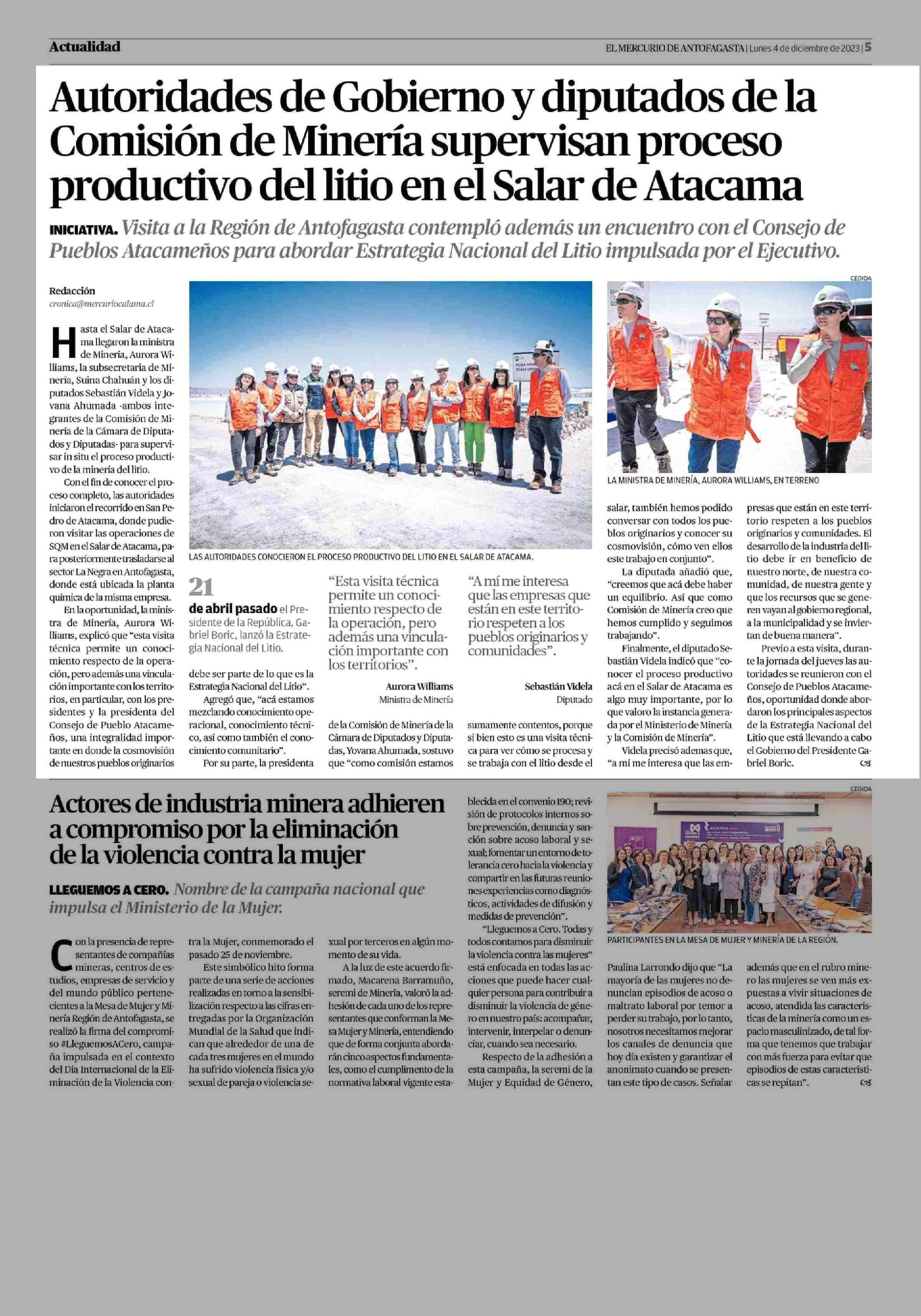 Autoridades de Gobierno y diputados de la Comisión de Minería supervisan proceso productivo del litio en el Salar de Atacama 04-12-2023 El Mercurio de Antofagasta |
