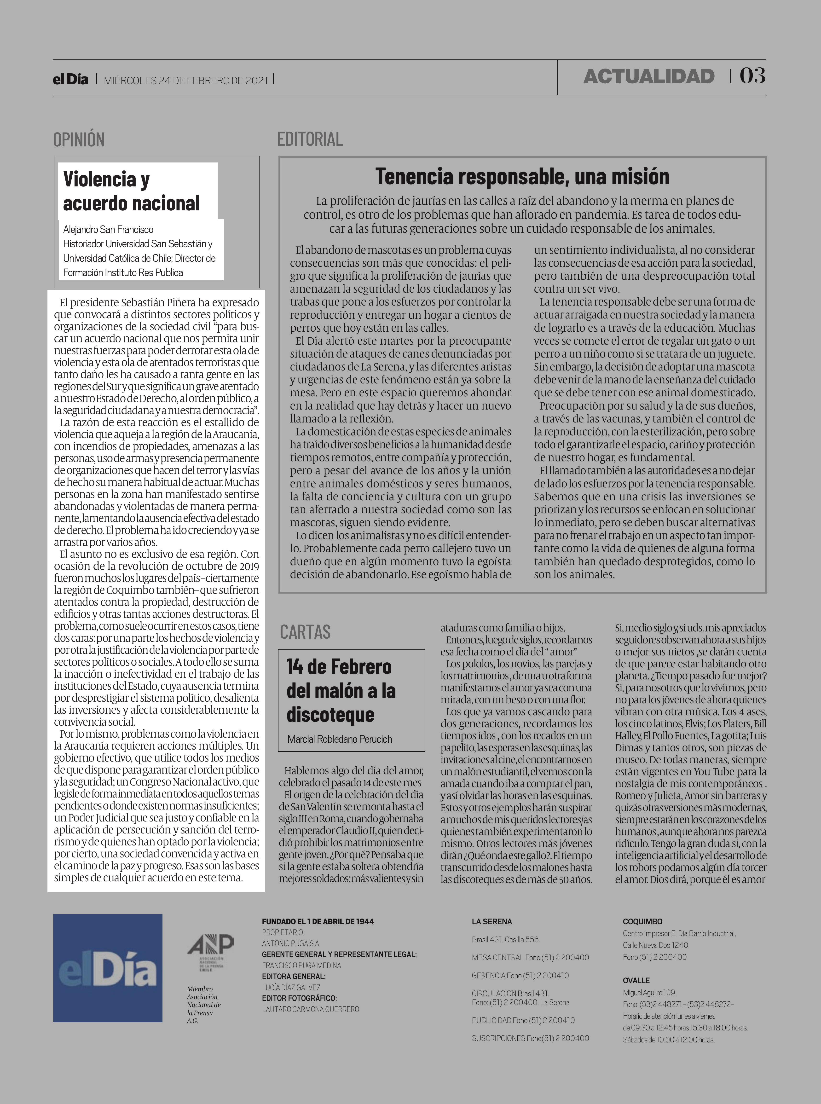 Violencia y acuerdo nacional 24-02-2021 El Día |