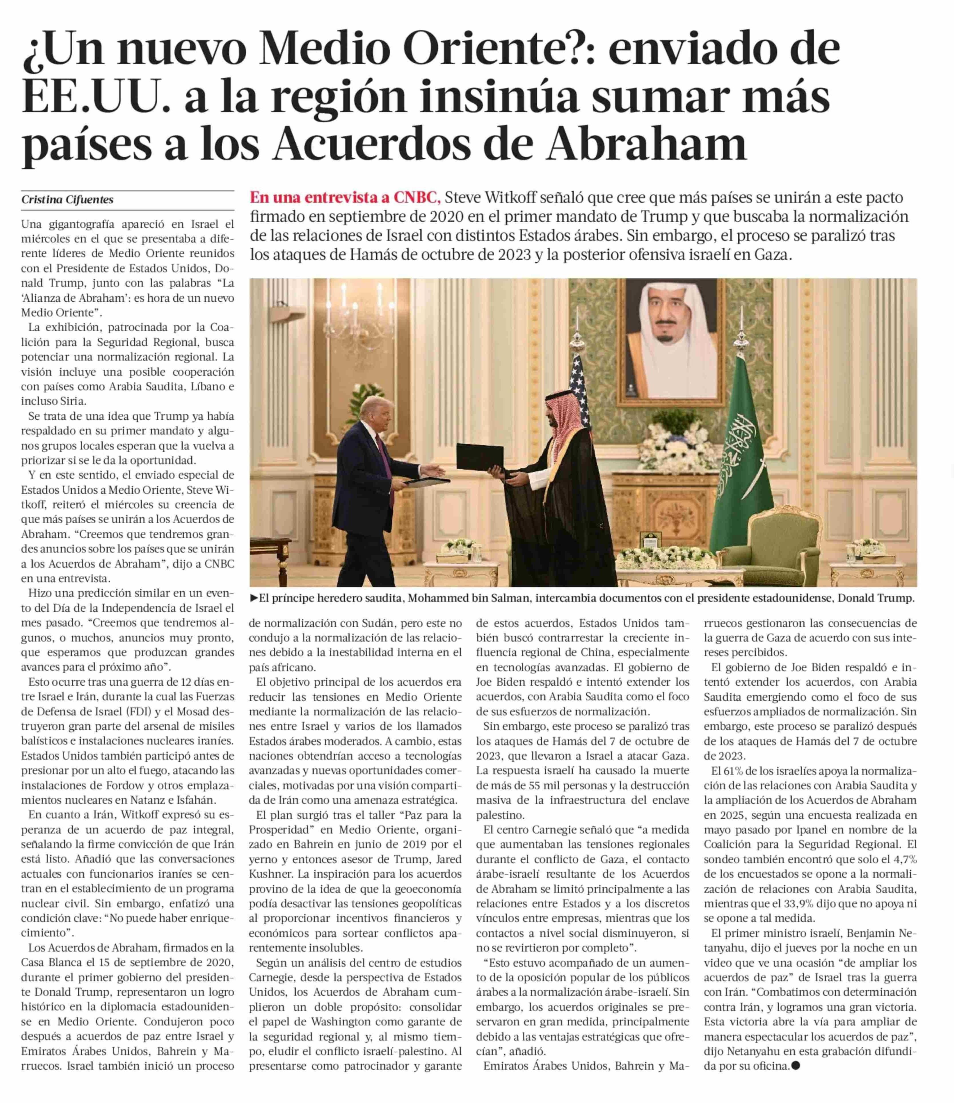 ¿Un nuevo Medio Oriente?: enviado de EE.UU. a la región insinúa sumar más países a los Acuerdos de Abraham 27-06-2025 La Tercera |