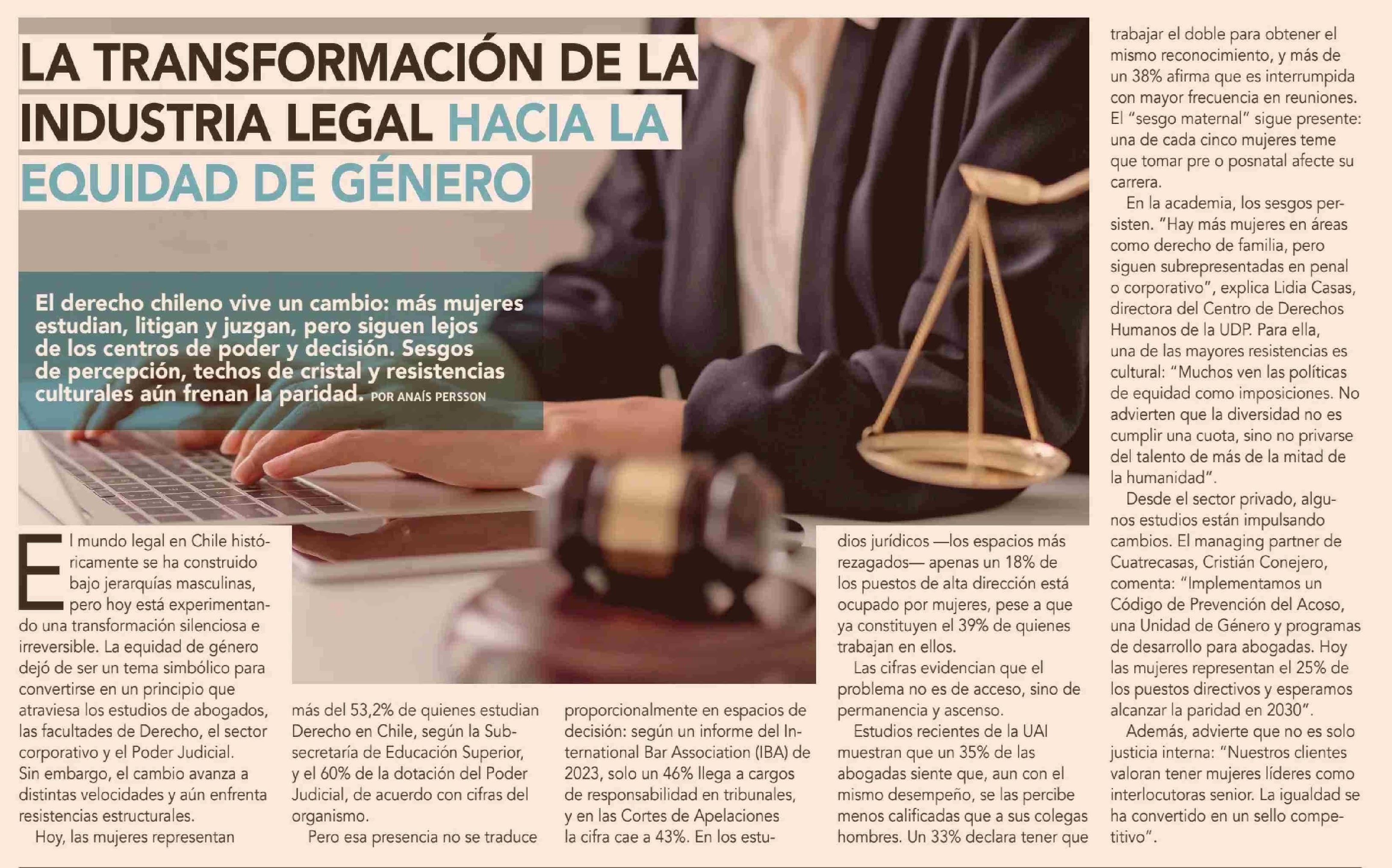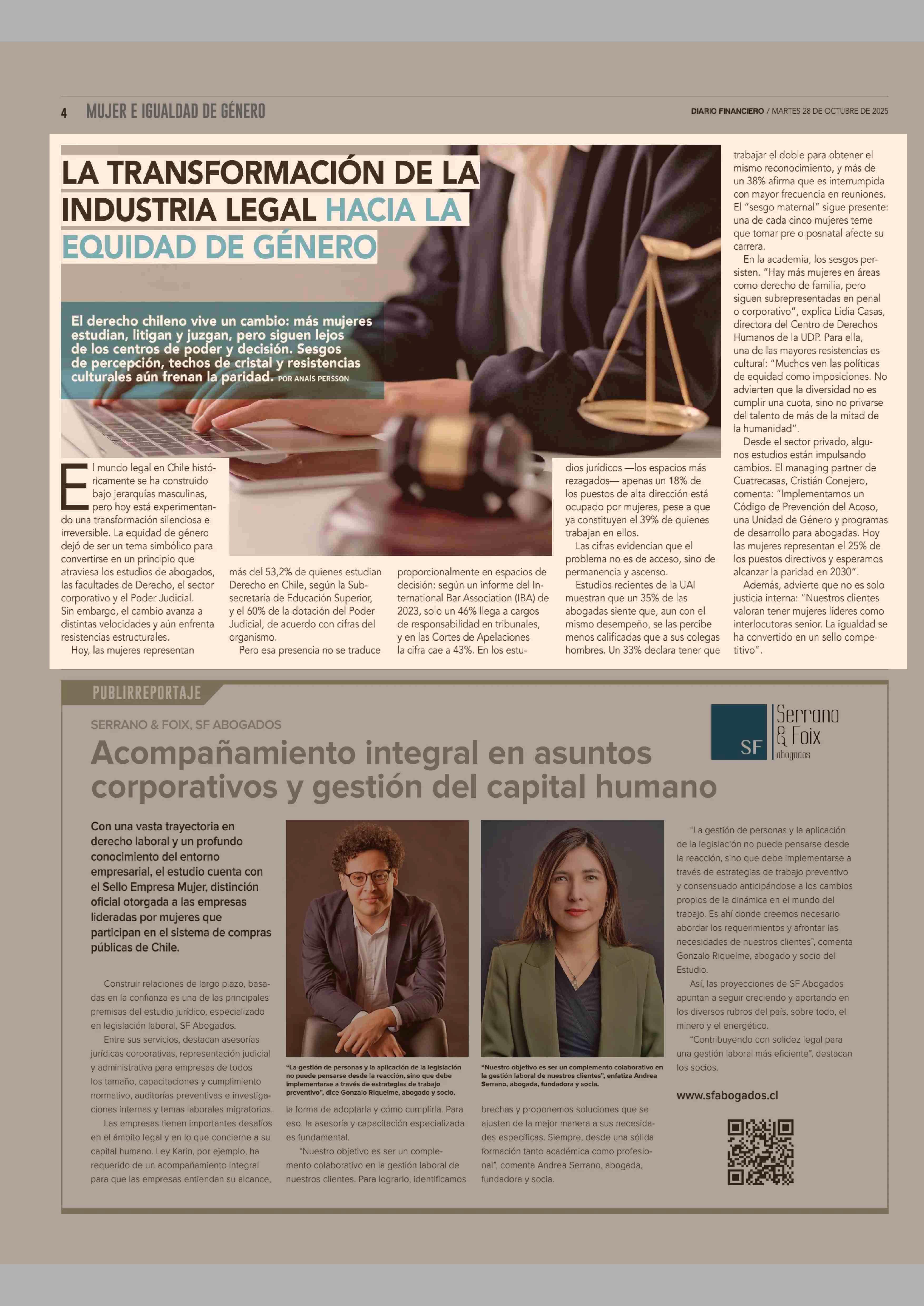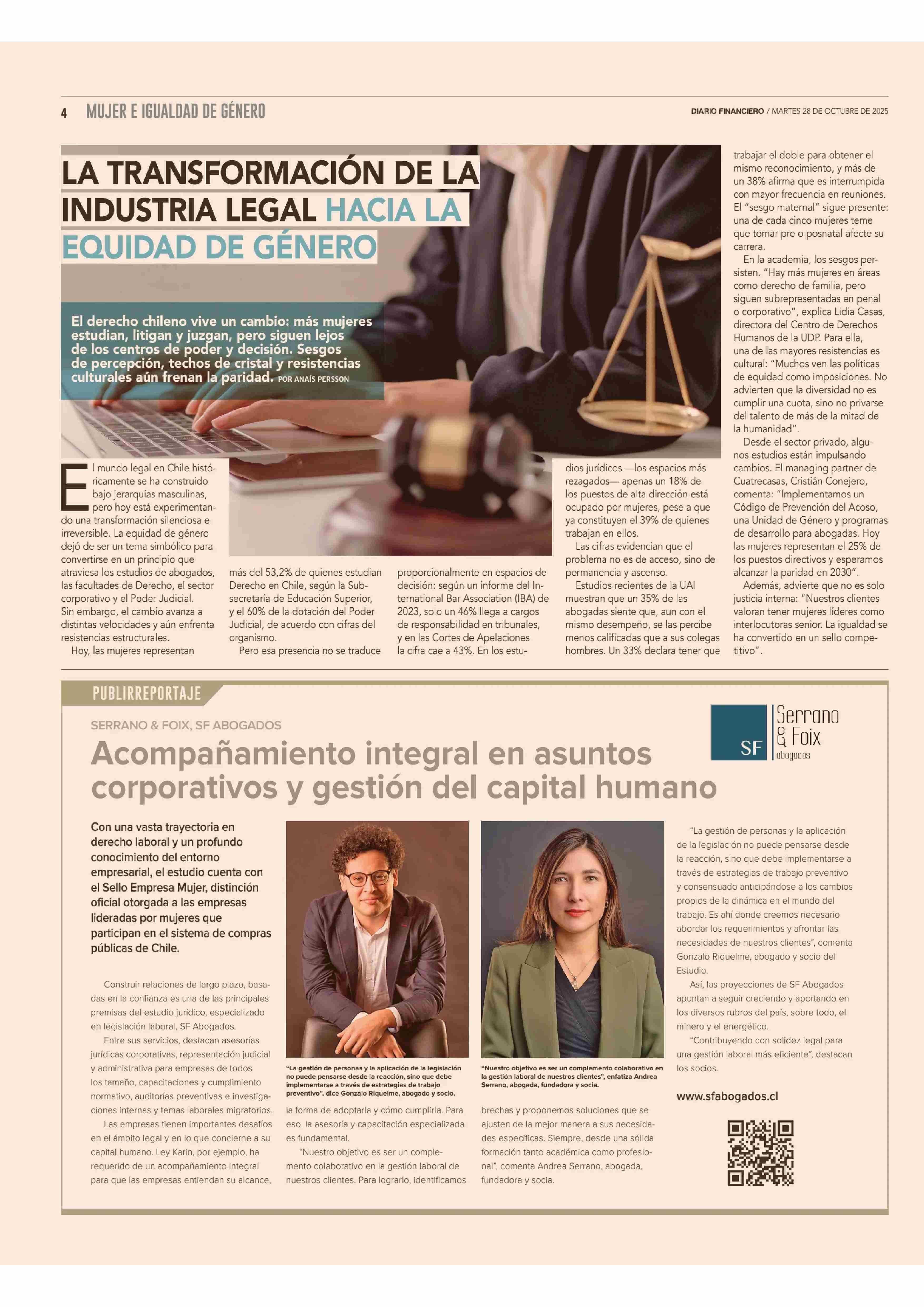 LA TRANSFORMACIÓN DE LA INDUSTRIA LEGAL HACIA LA EQUIDAD DE GÉNERO 28-10-2025 Diario Financiero |