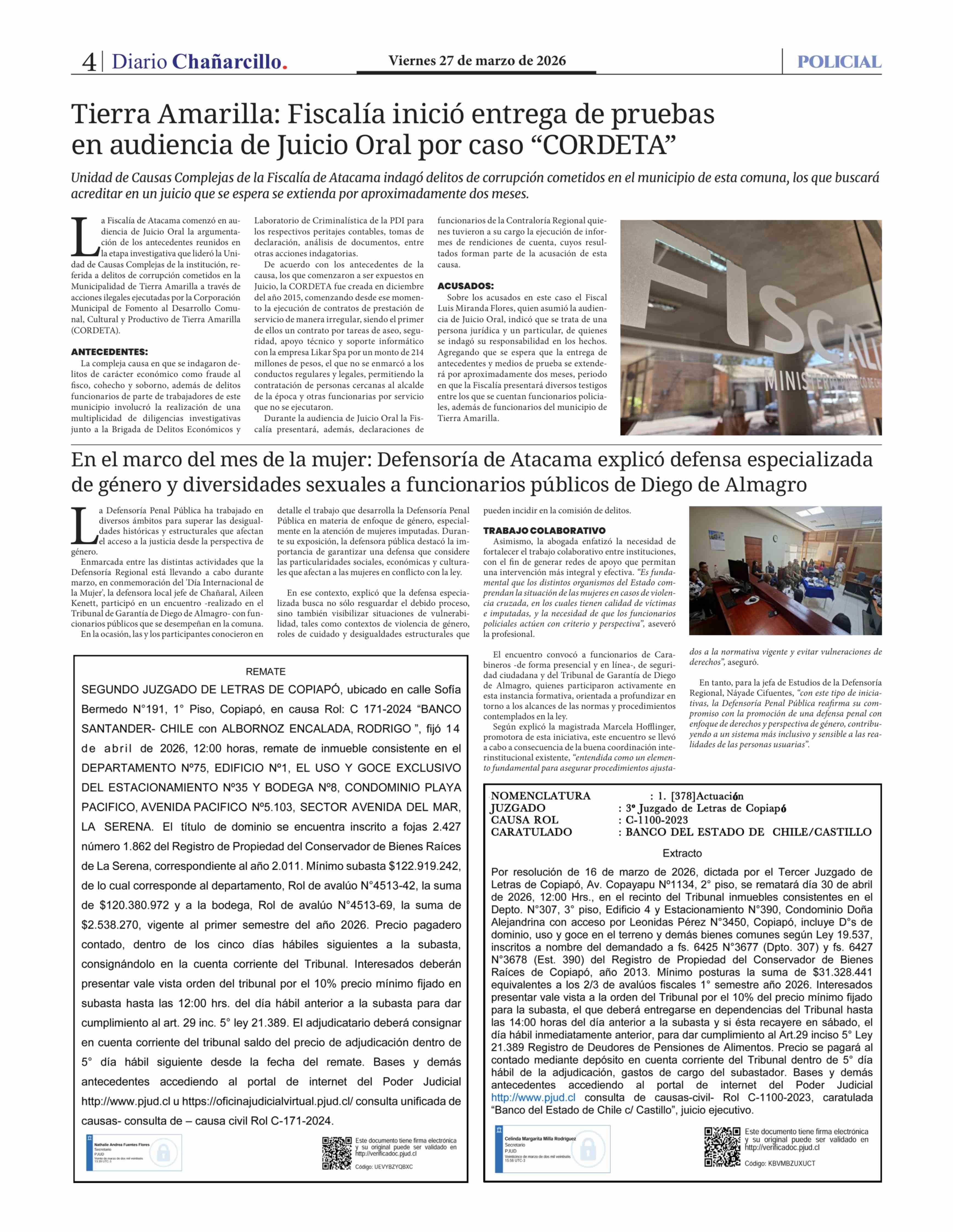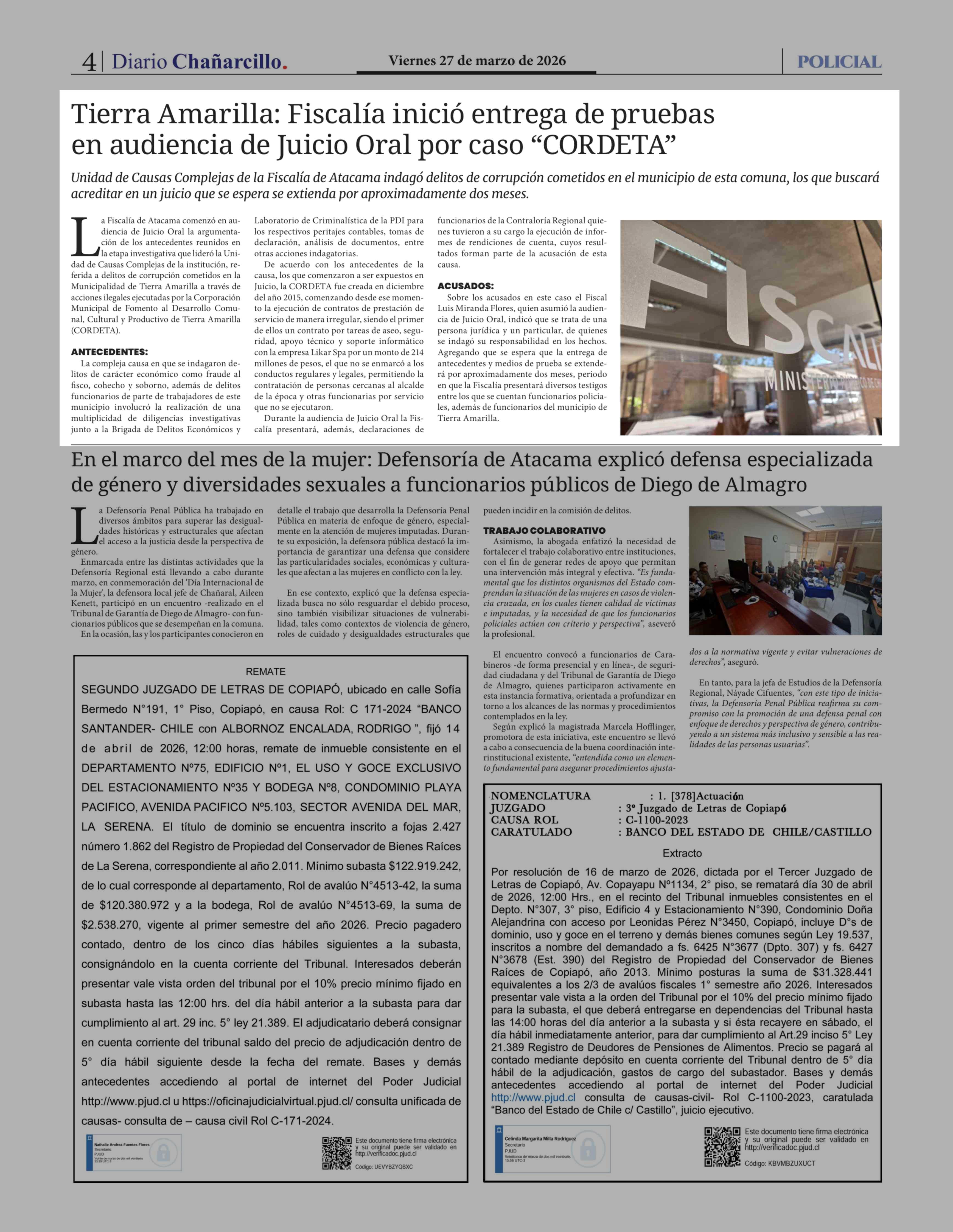 Tierra Amarilla: Fiscalía inició entrega de pruebas en audiencia de Juicio Oral por caso "CORDETA" 27-03-2026 Diario Chañarcillo |