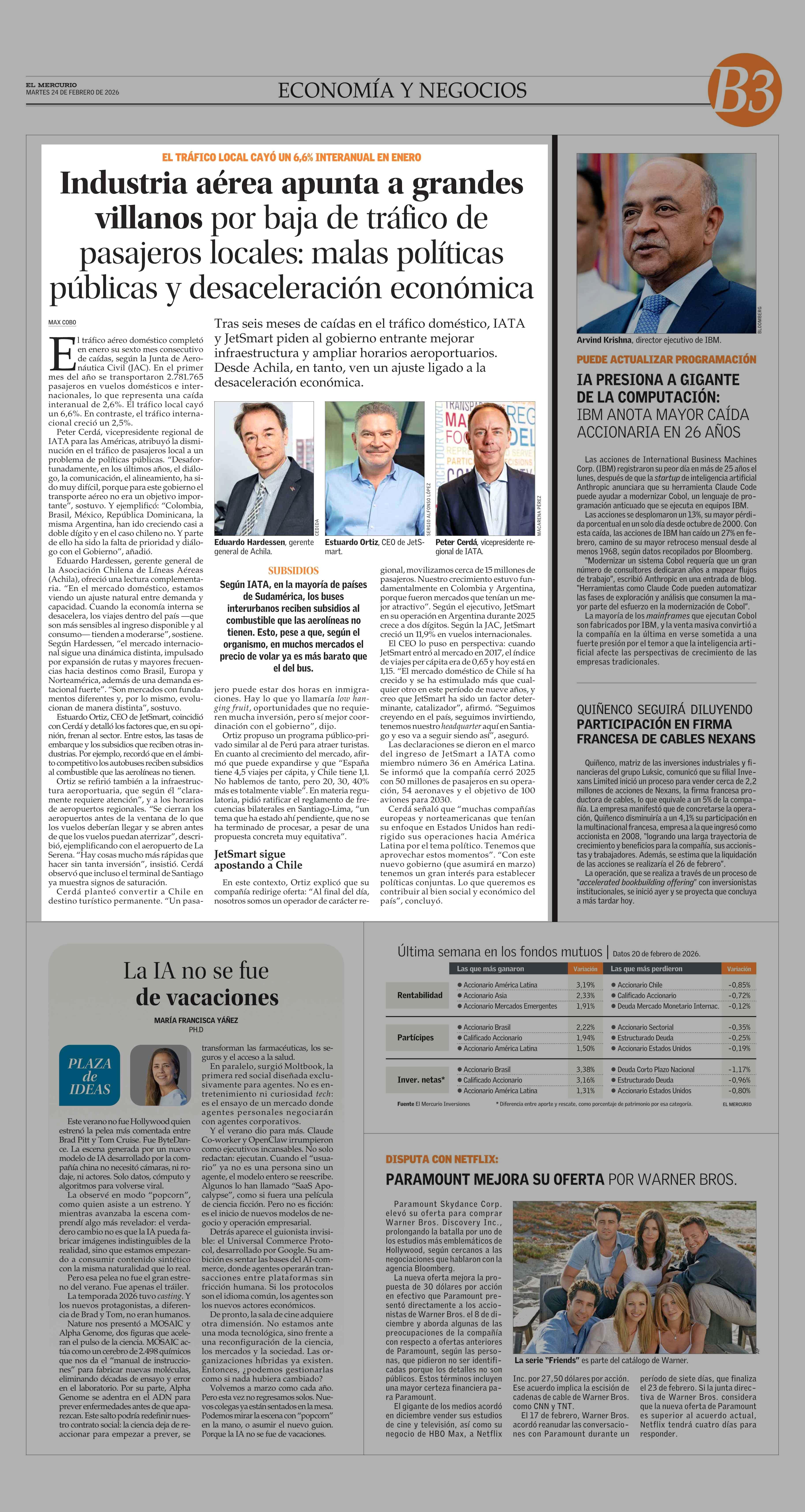 Industria aérea apunta a grandes villanos por baja de tráfico de pasajeros locales: malas políticas públicas y desaceleración económica 24-02-2026 El Mercurio |
