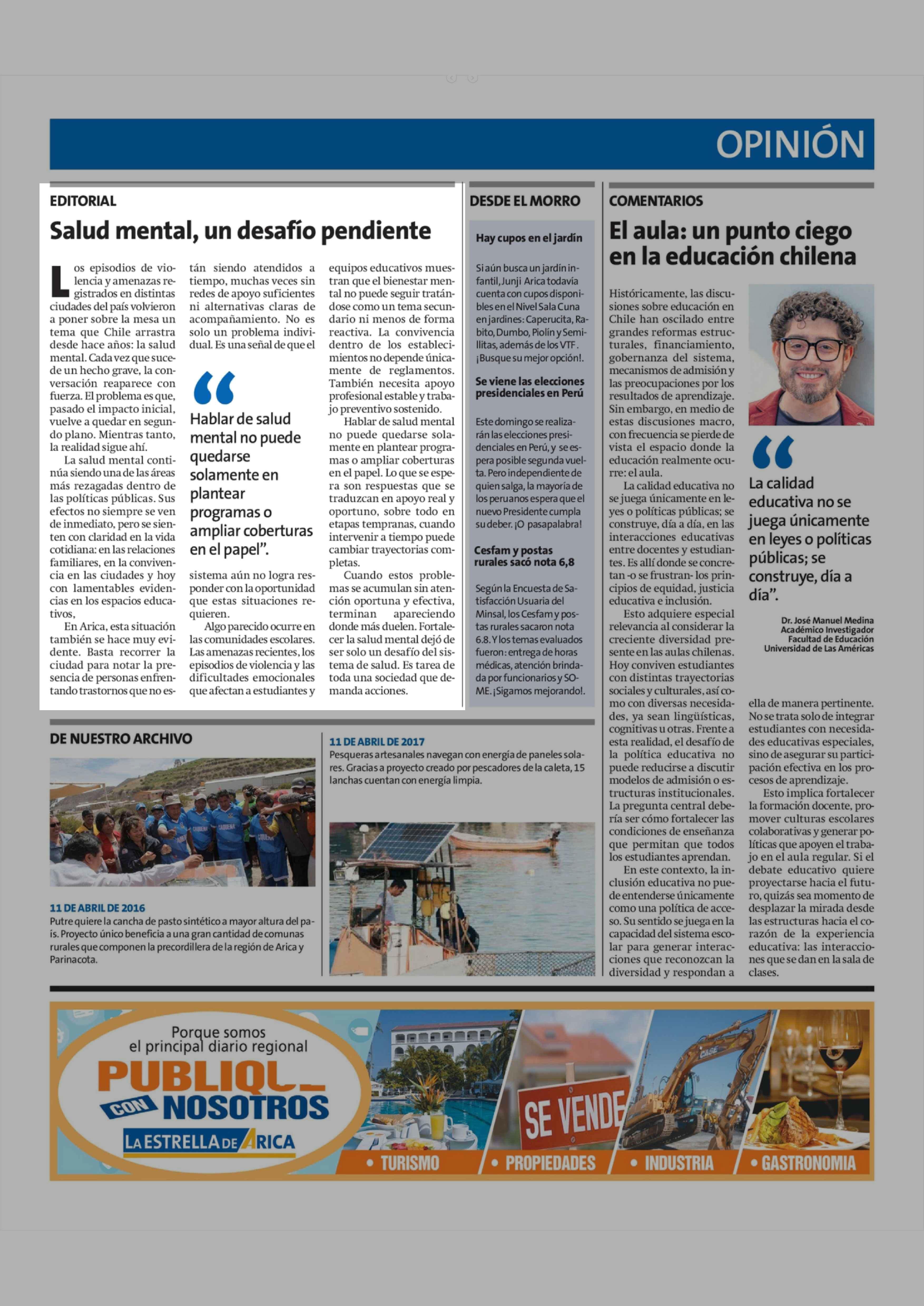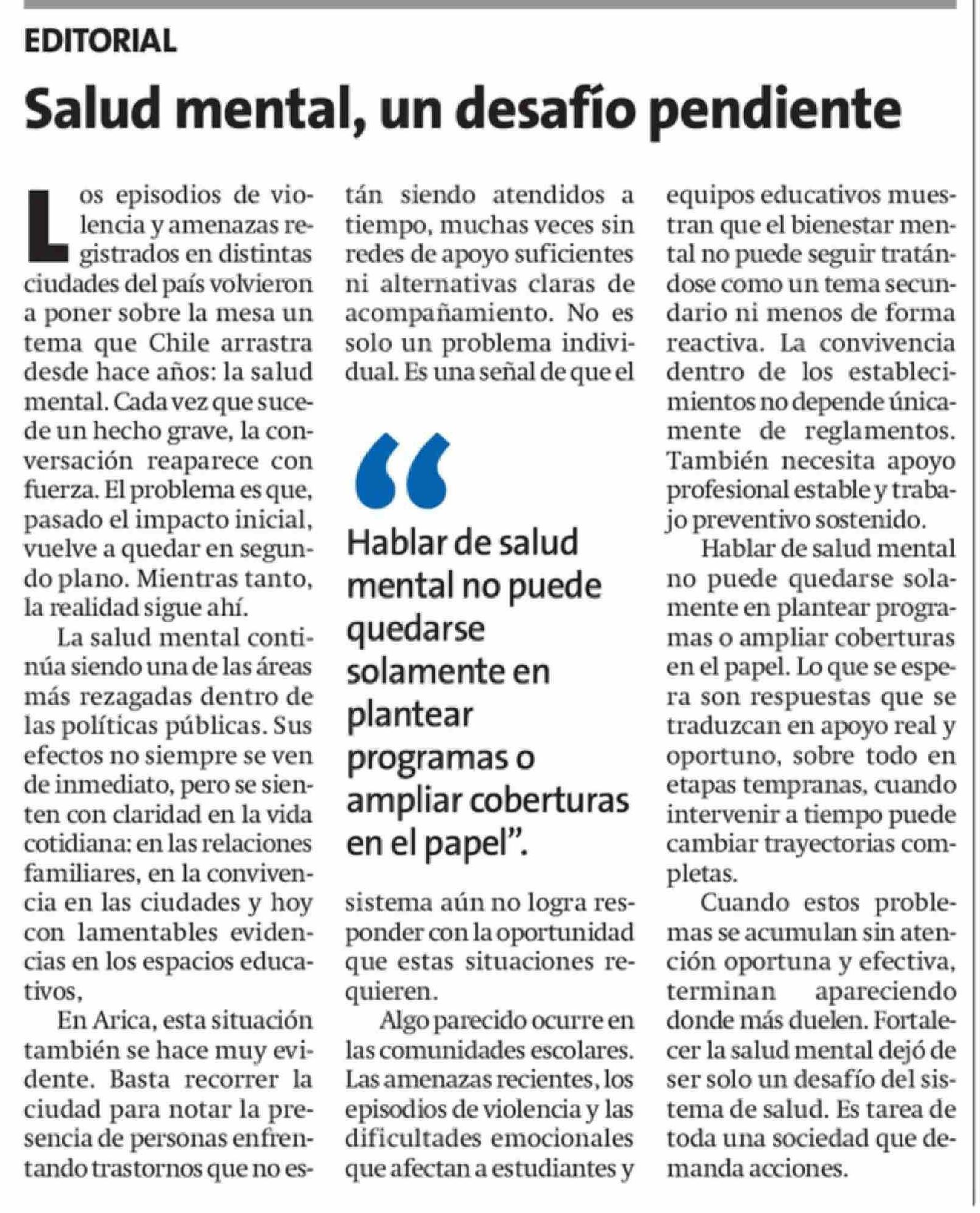 Editorial: Salud mental, un desafío pendiente 11-04-2026 La Estrella de Arica |