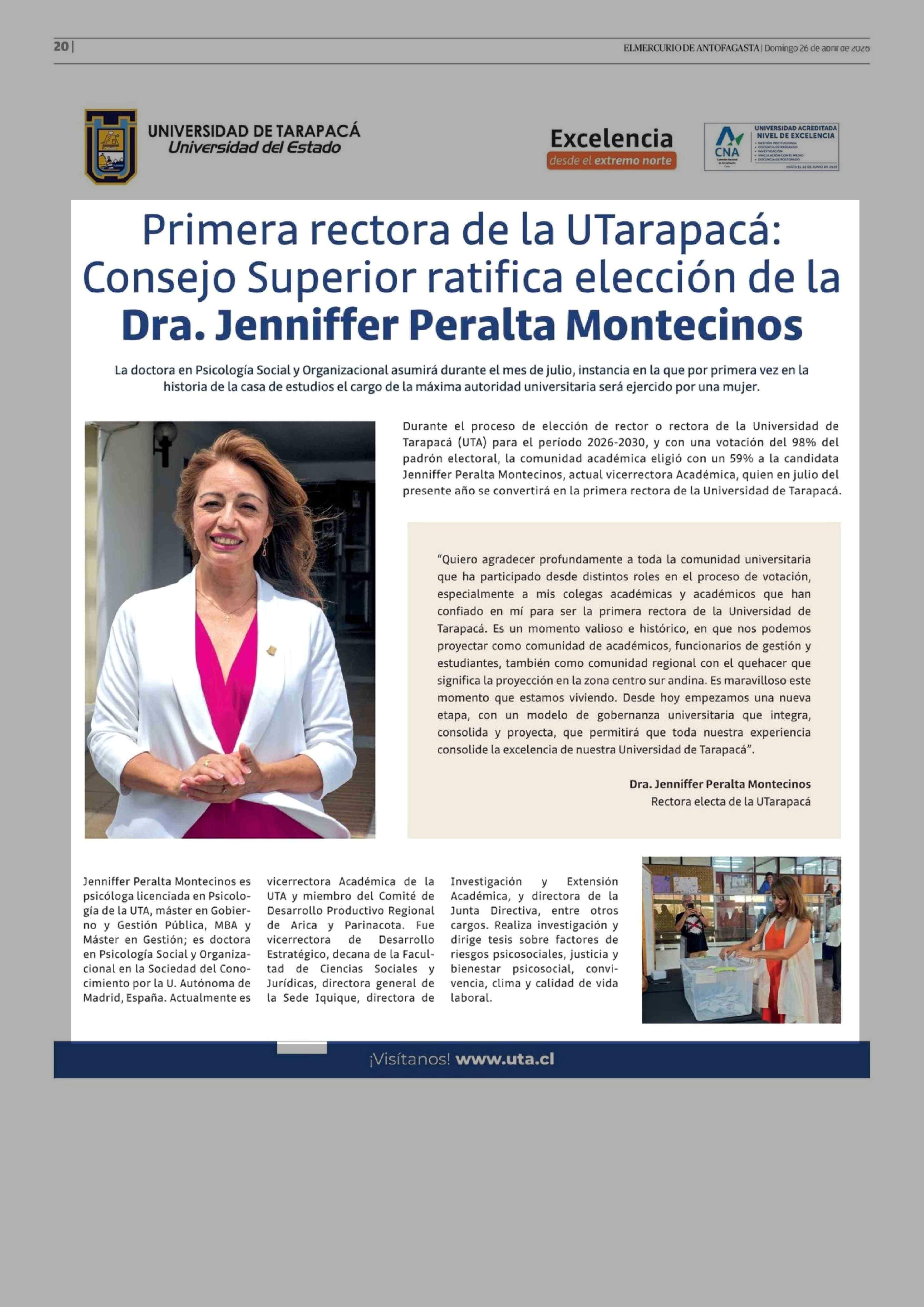 Primera rectora de la UTarapacá: Consejo Superior ratifica elección de la Dra. Jenniffer Peralta Montecinos 26-04-2026 El Mercurio de Antofagasta |