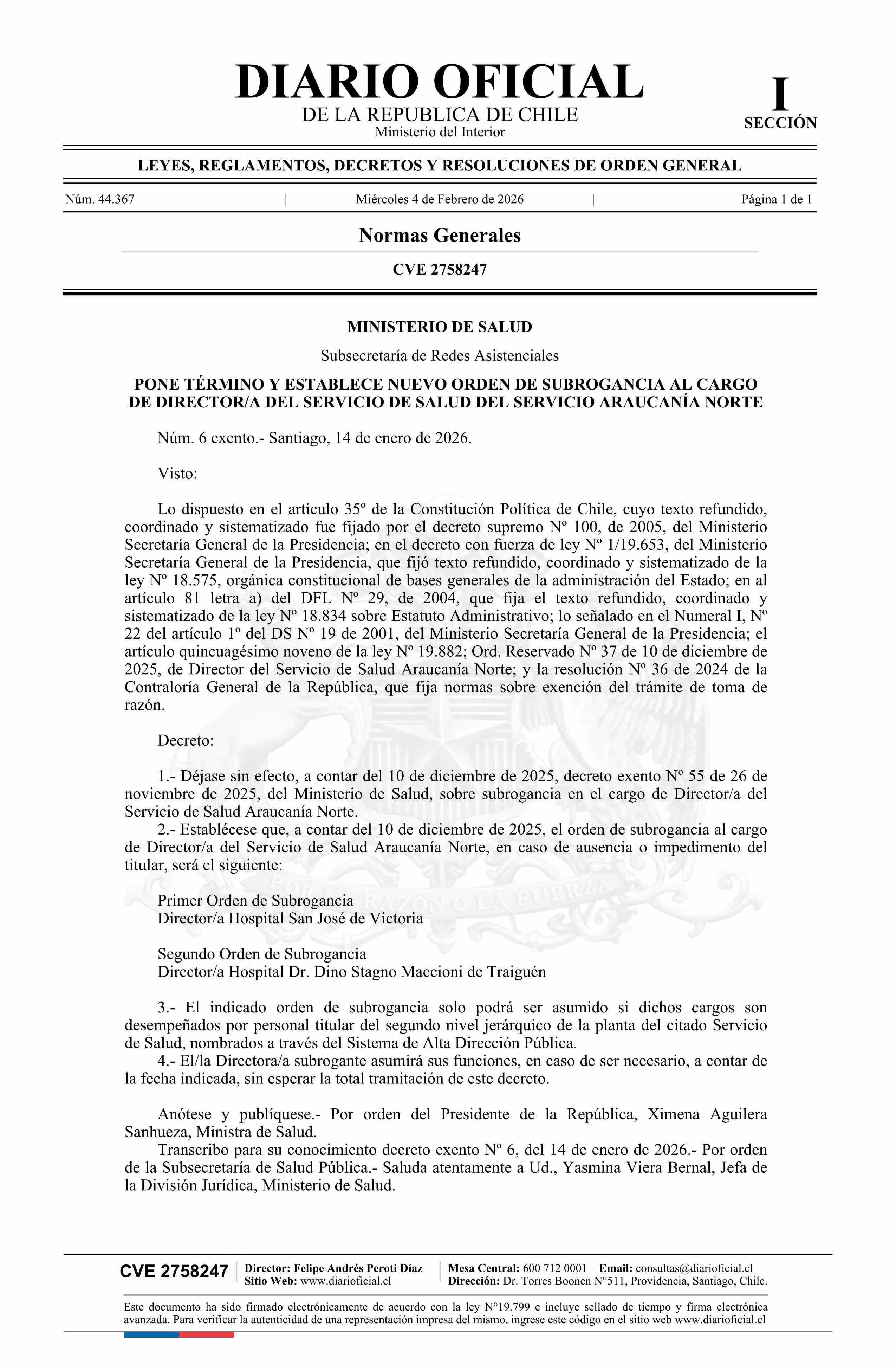 | Título: | Decreto exento número 6, de 2026.- Pone término y establece nuevo orden de subrogancia al cargo de Director/a del Servicio de Salud del Servicio Araucanía Norte |