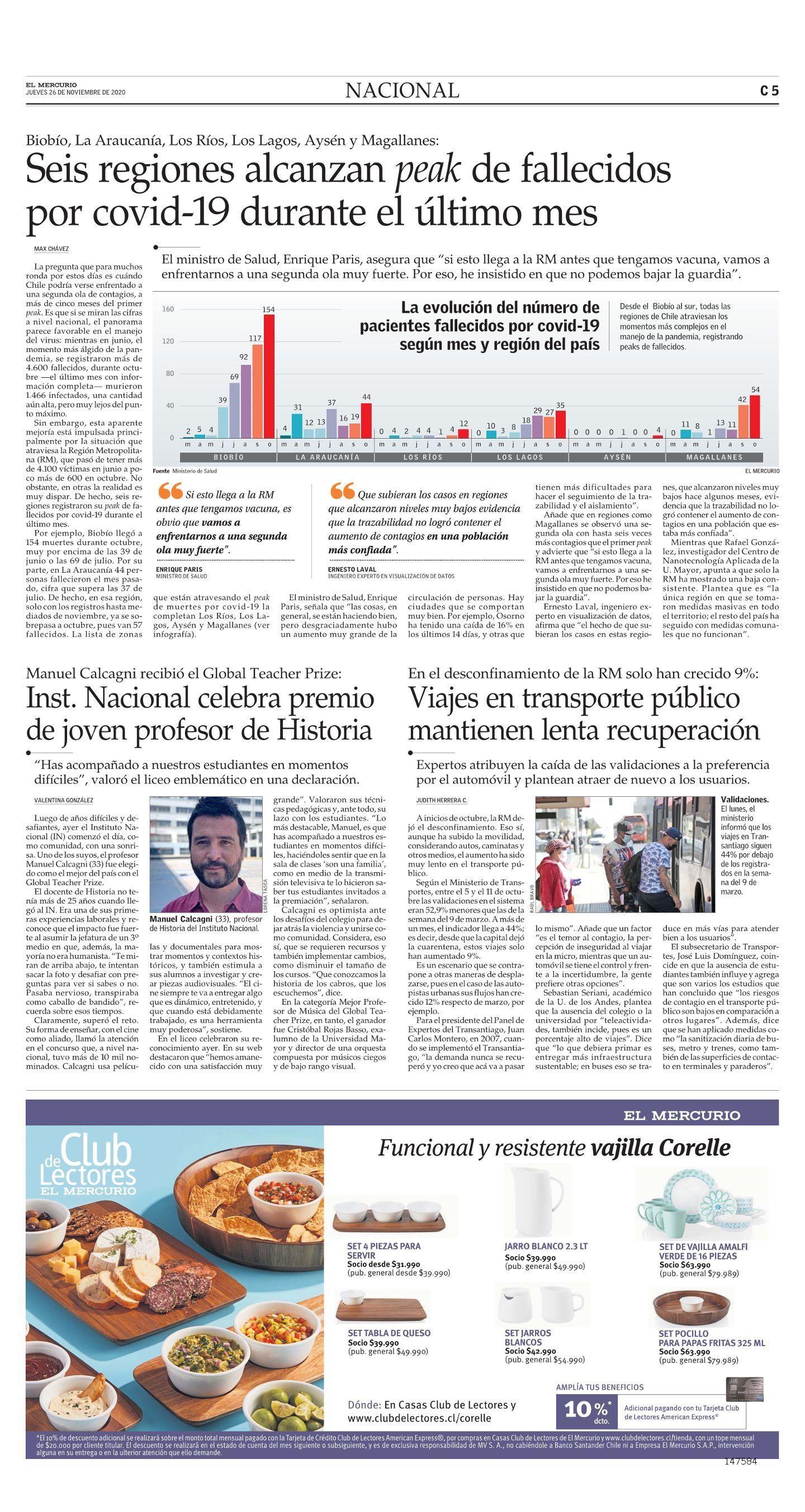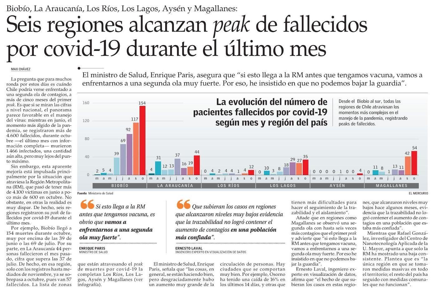 Seis regiones alcanzan peak de fallecidos por covid-19 durante el último mes 26-11-2020 El Mercurio |