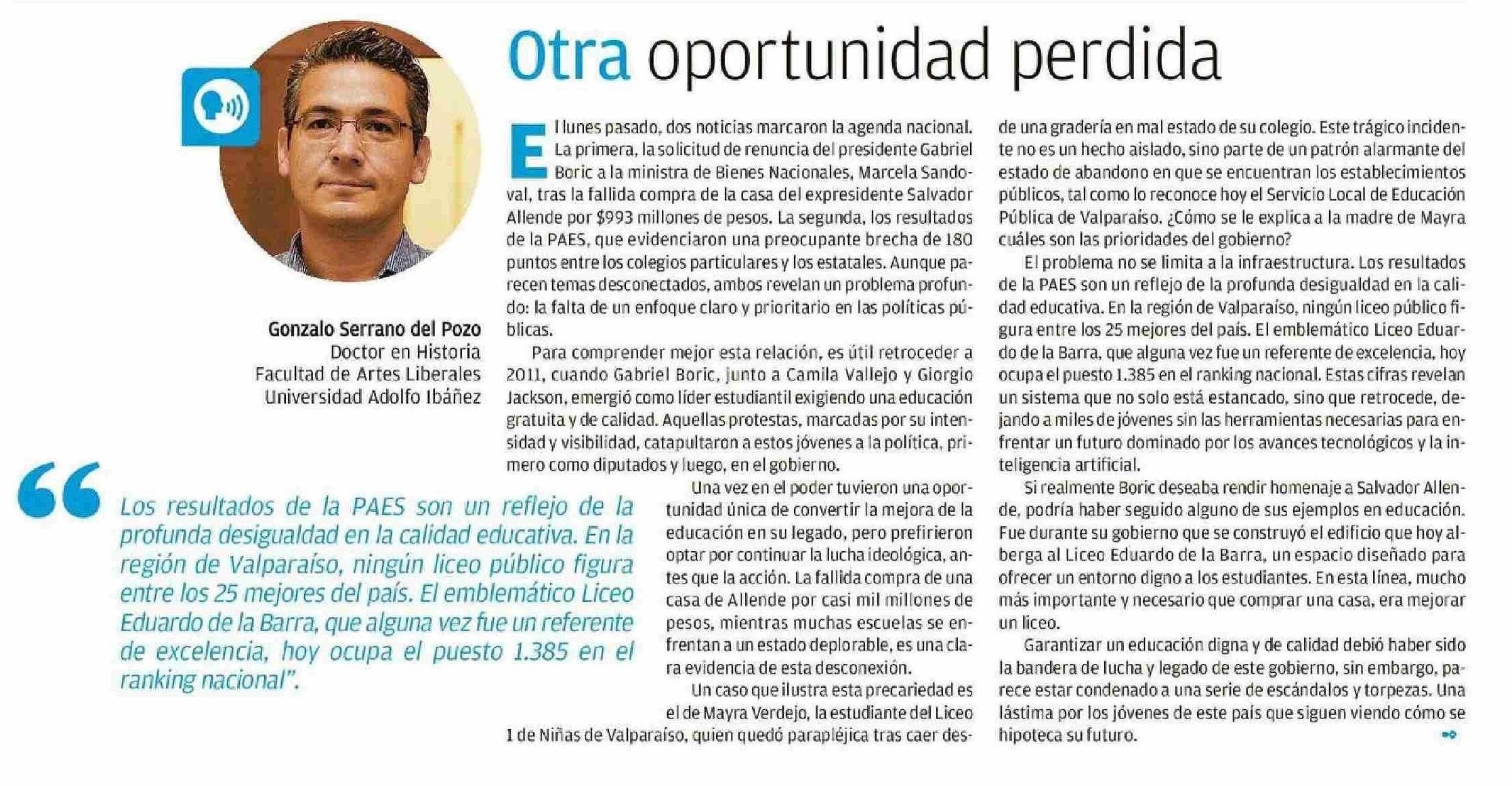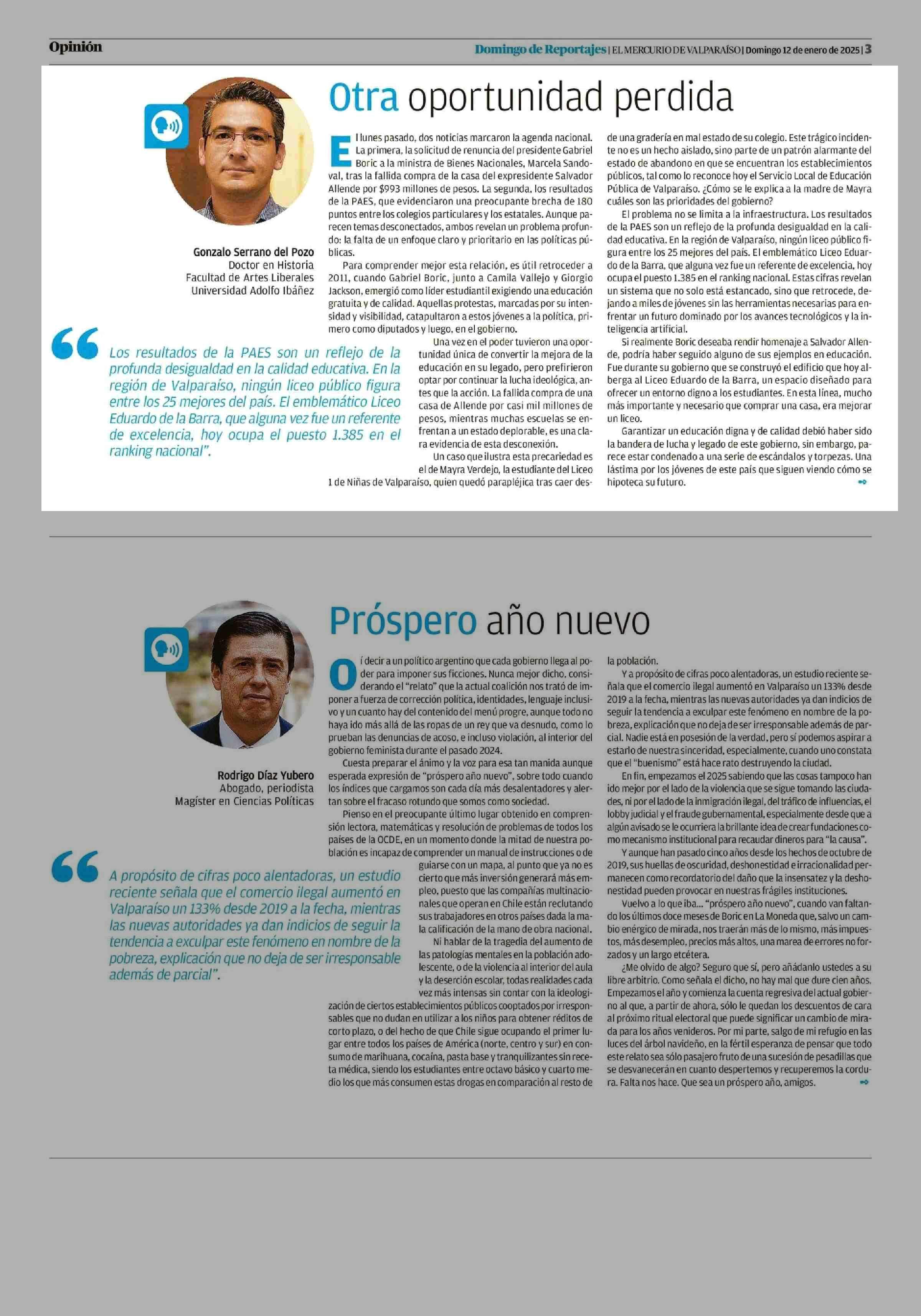 COLUMNAS DE OPINIÓN: Otra oportunidad perdida 12-01-2025 El Mercurio de Valparaíso |