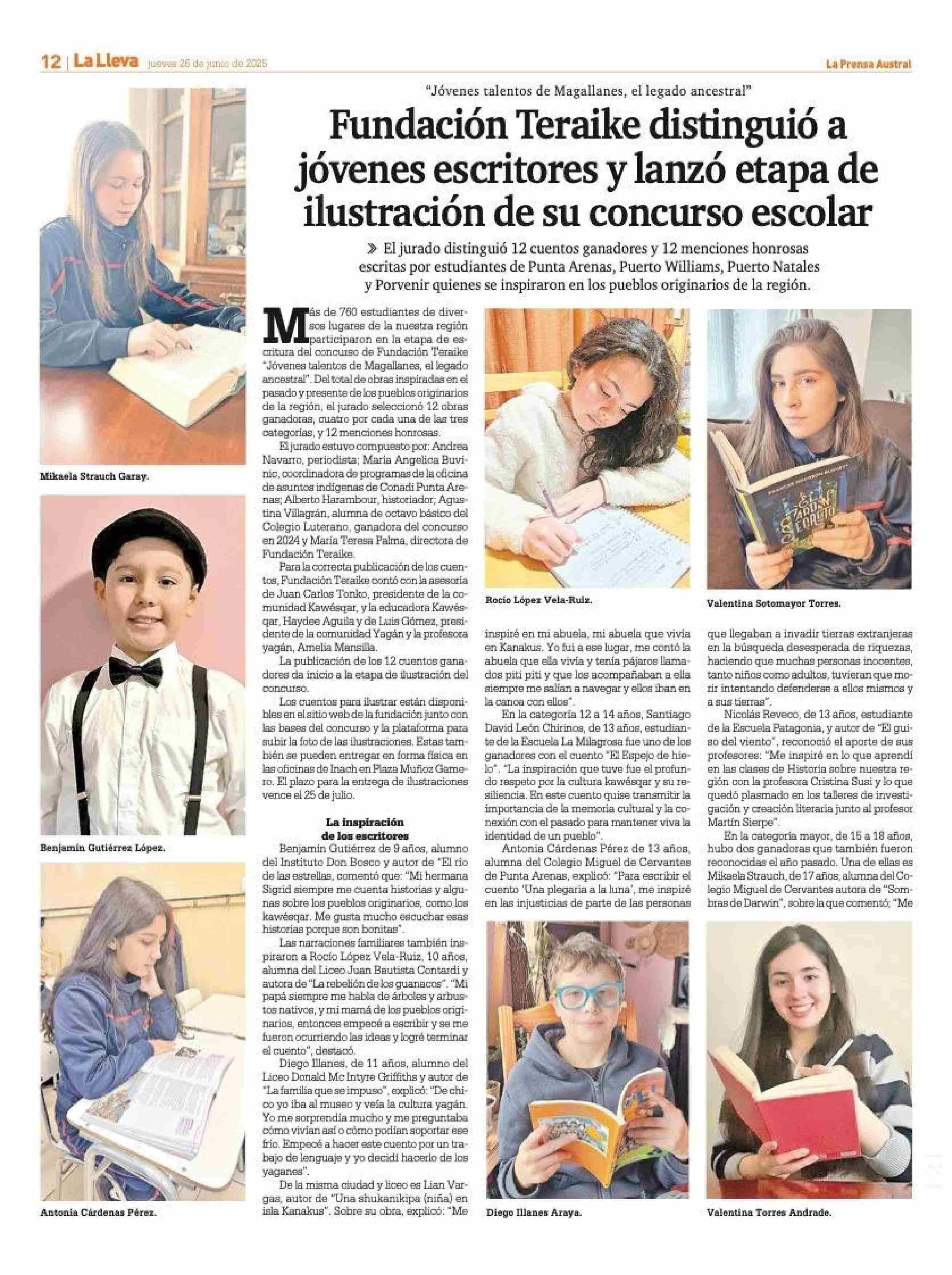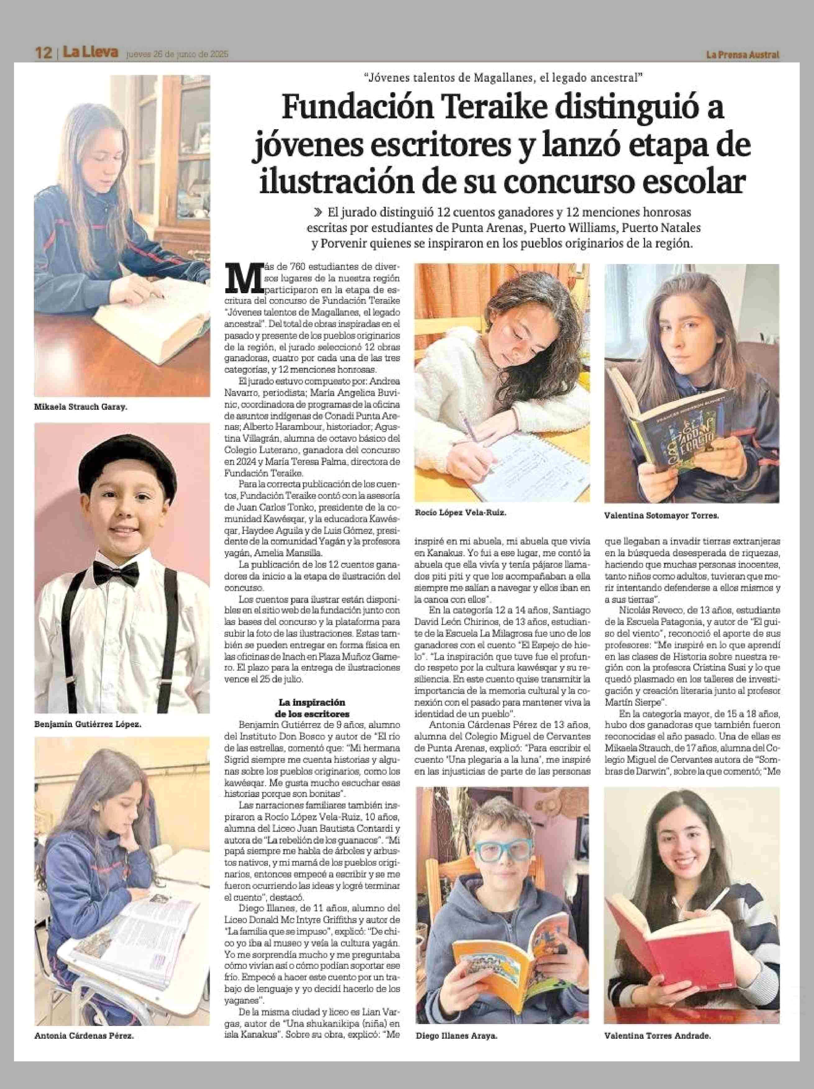 Fundación Teraike distinguió a jóvenes escritores y lanzó etapa de ilustración de su concurso escolar 26-06-2025 La Prensa Austral |