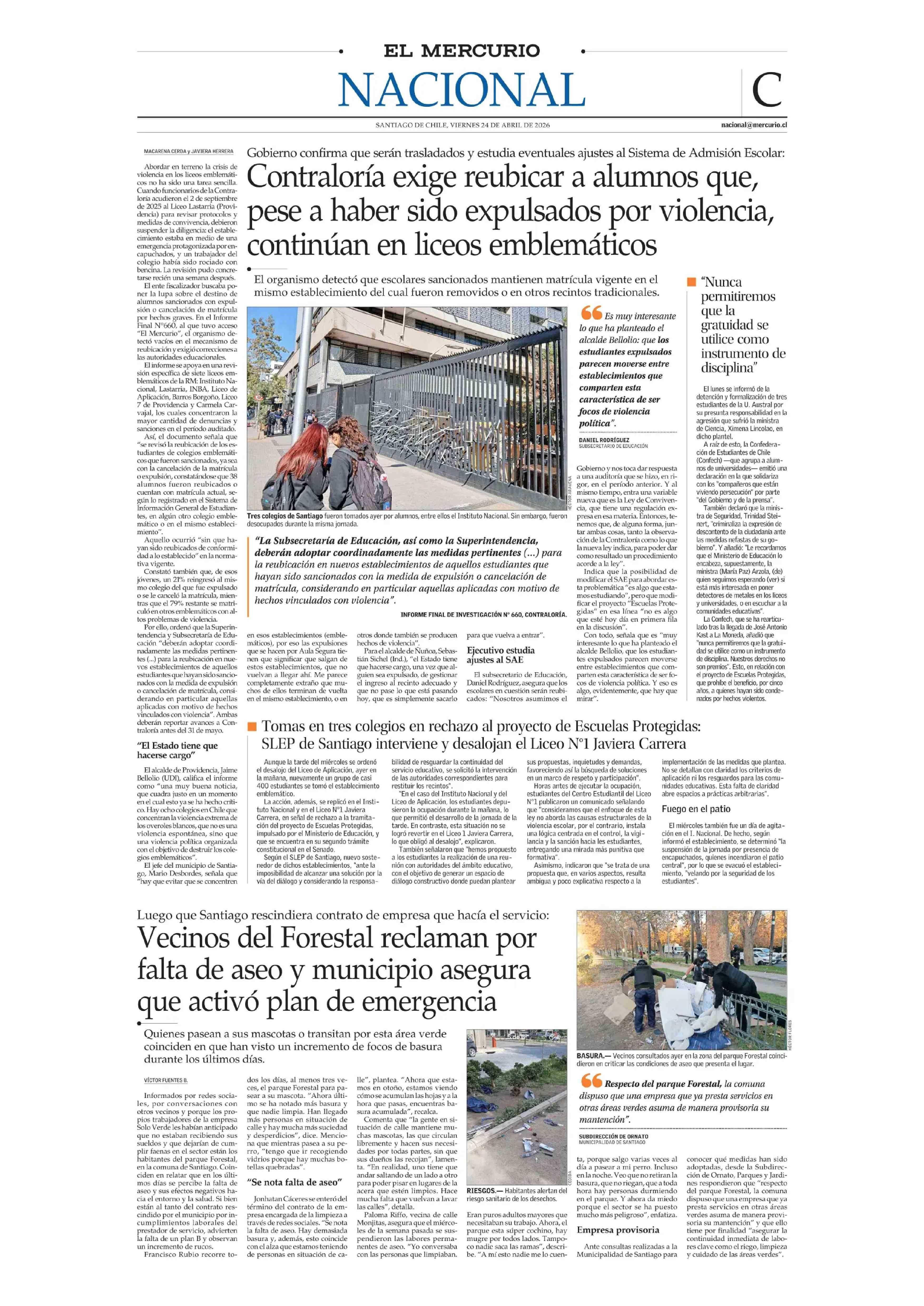 Contraloría exige reubicar a alumnos que, pese a haber sido expulsados por violencia, continúan en liceos emblemáticos 24-04-2026 El Mercurio |