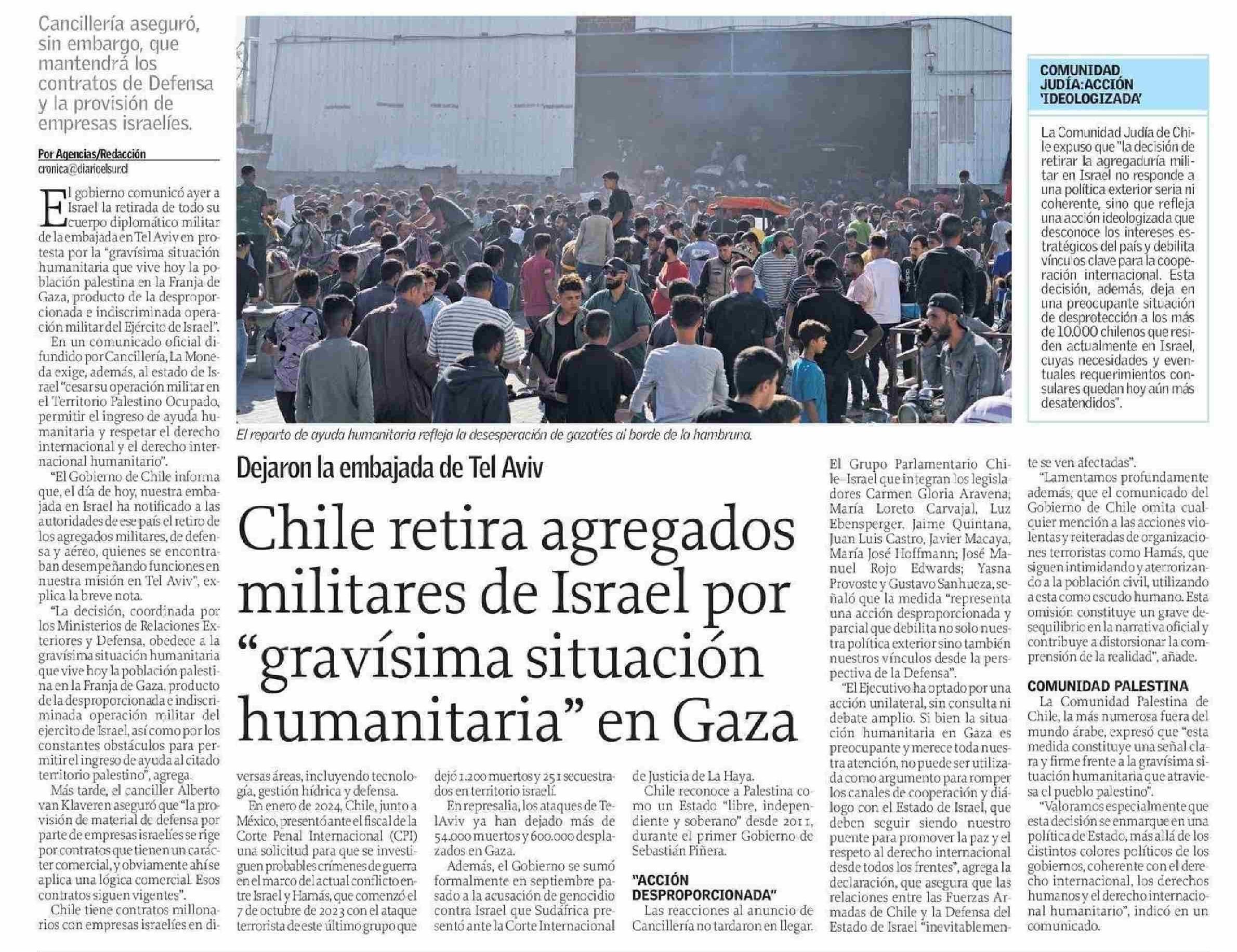 Chile retira agregados militares de Israel por “gravísima situación humanitaria” en Gaza 29-05-2025 El Sur |