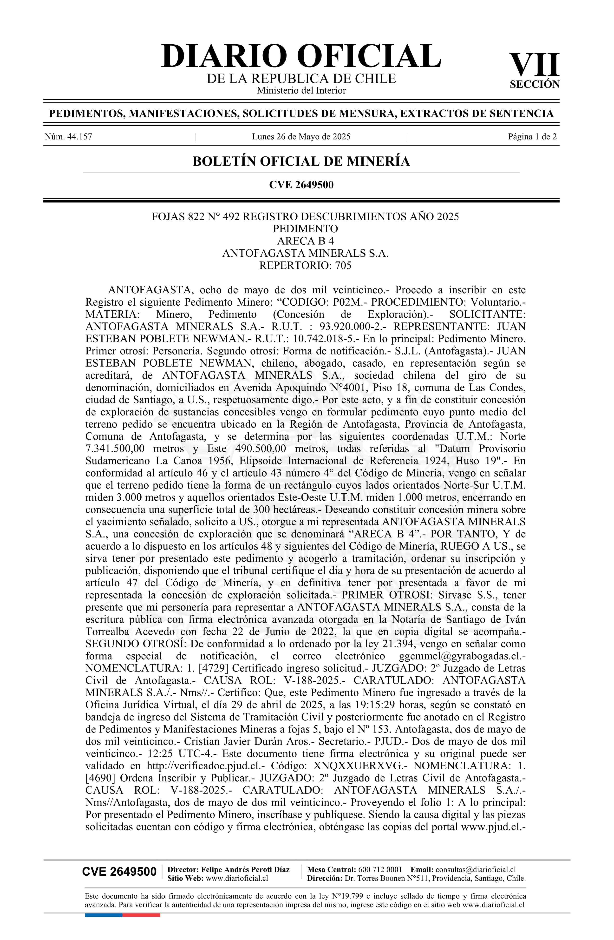 Título: ARECA B 4 / Antofagasta Minerals S.A.