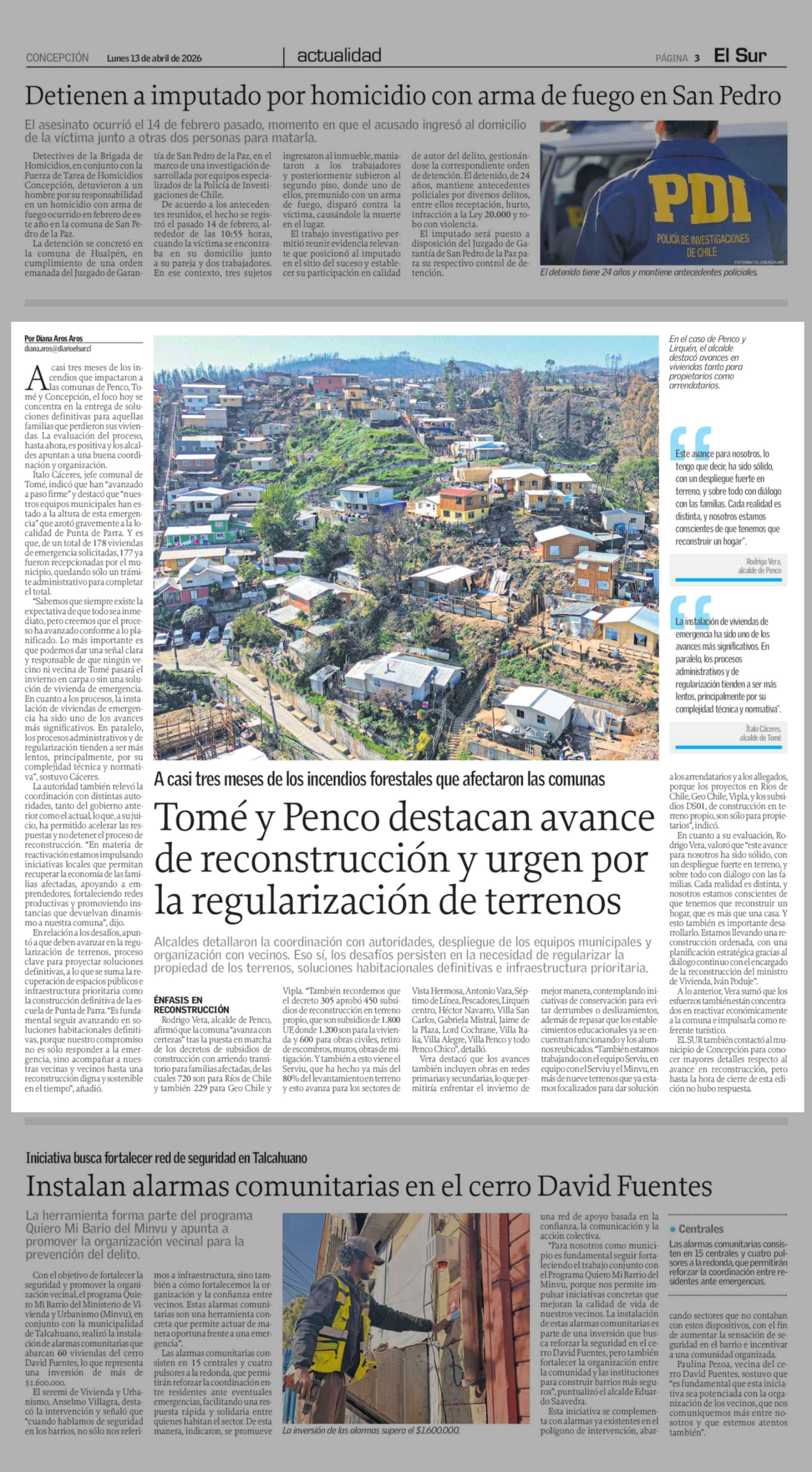 Tomé y Penco destacan avance de reconstrucción y urgen por la regularización de terrenos 13-04-2026 El Sur |