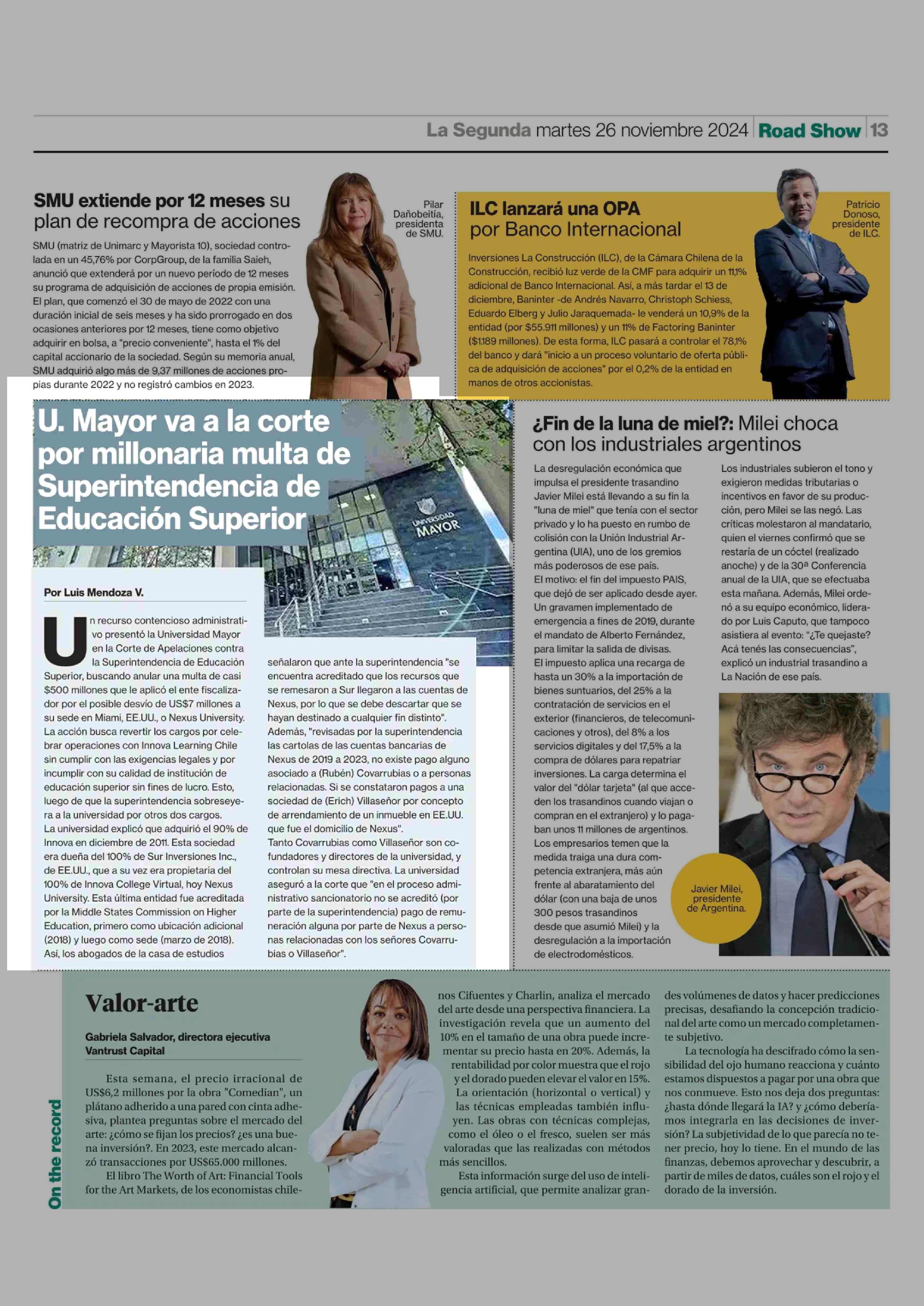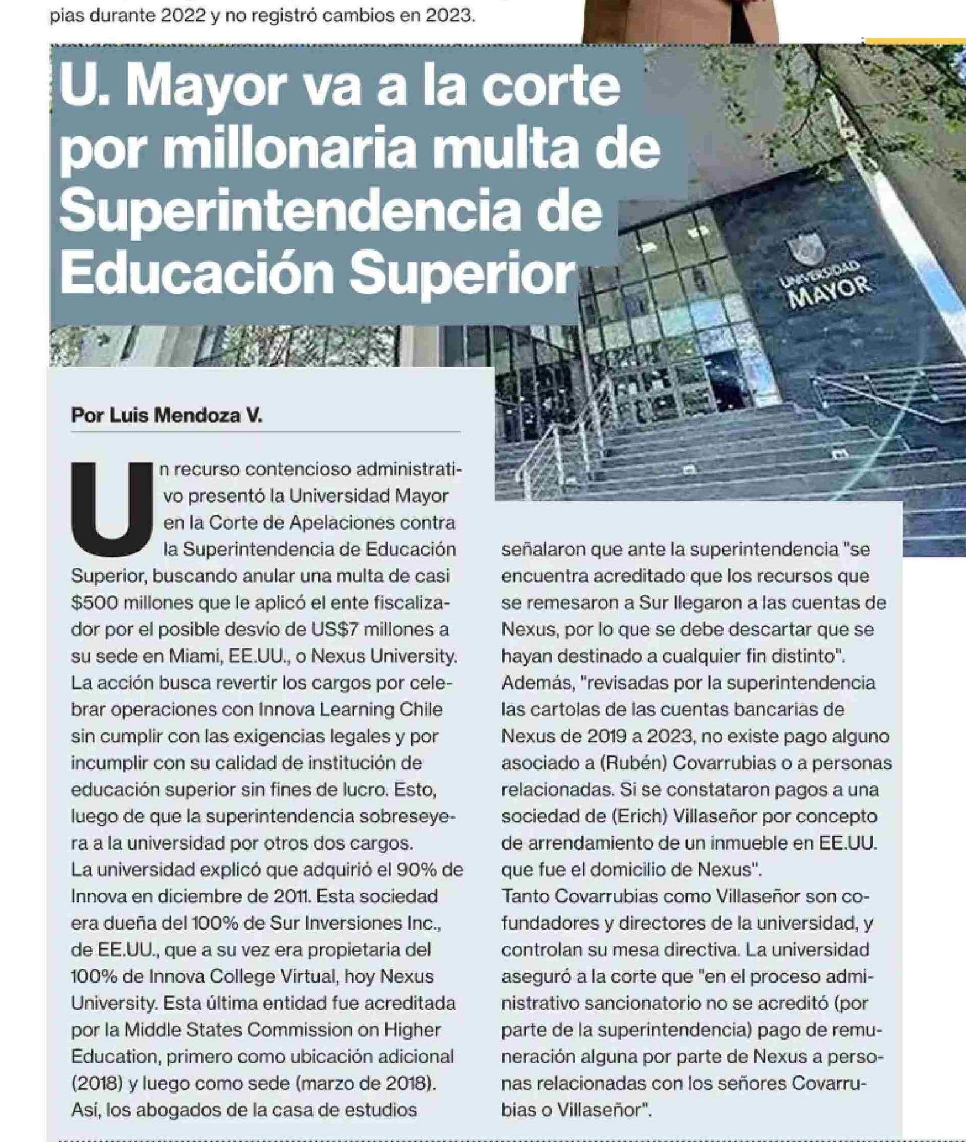 U. Mayor va a la corte por millonaria multa de Superintendencia de Educación Superior 26-11-2024 La Segunda |