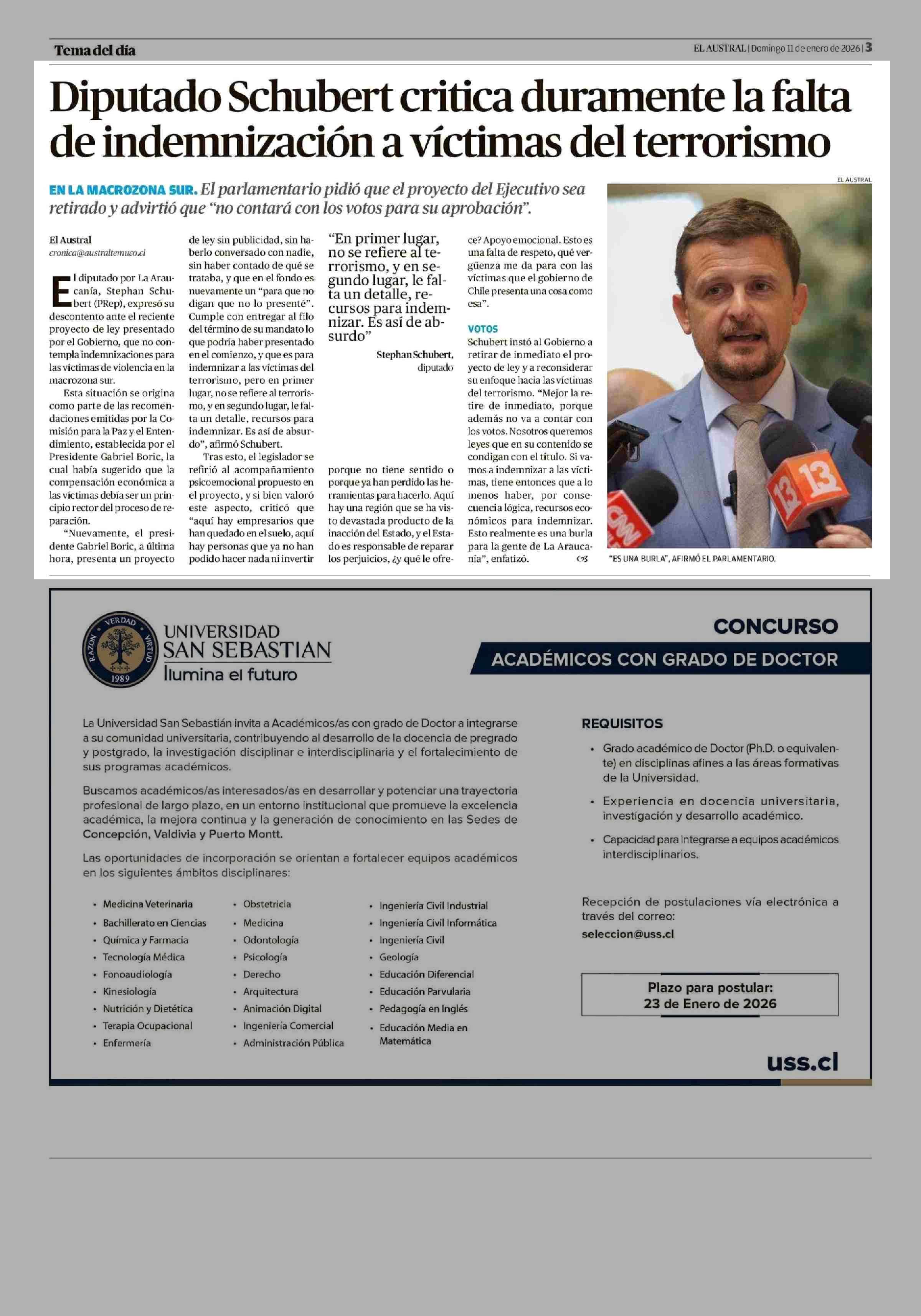 Diputado Schubert critica duramente la falta de indemnización a víctimas del terrorismo 11-01-2026 El Austral de la Araucanía |
