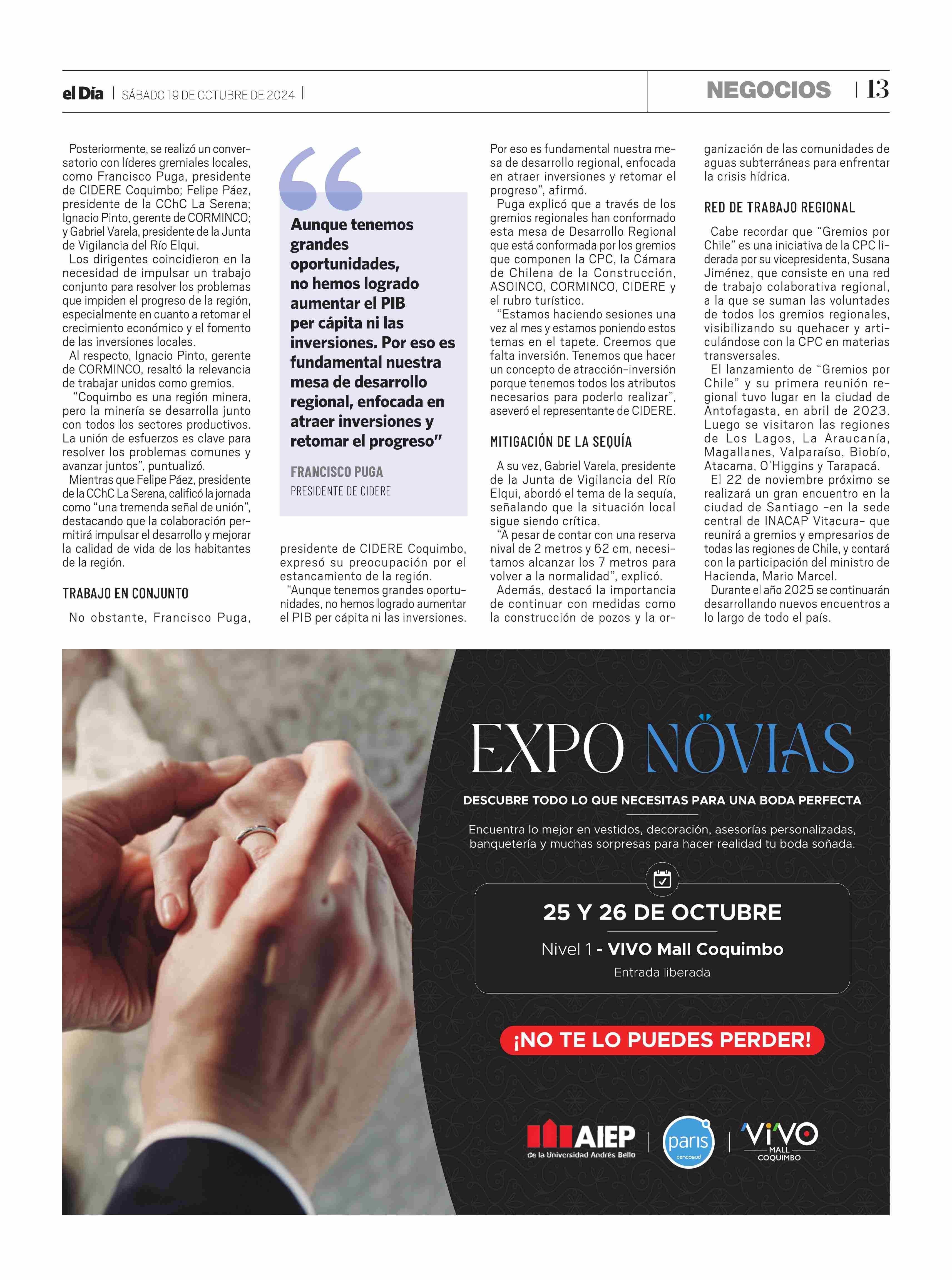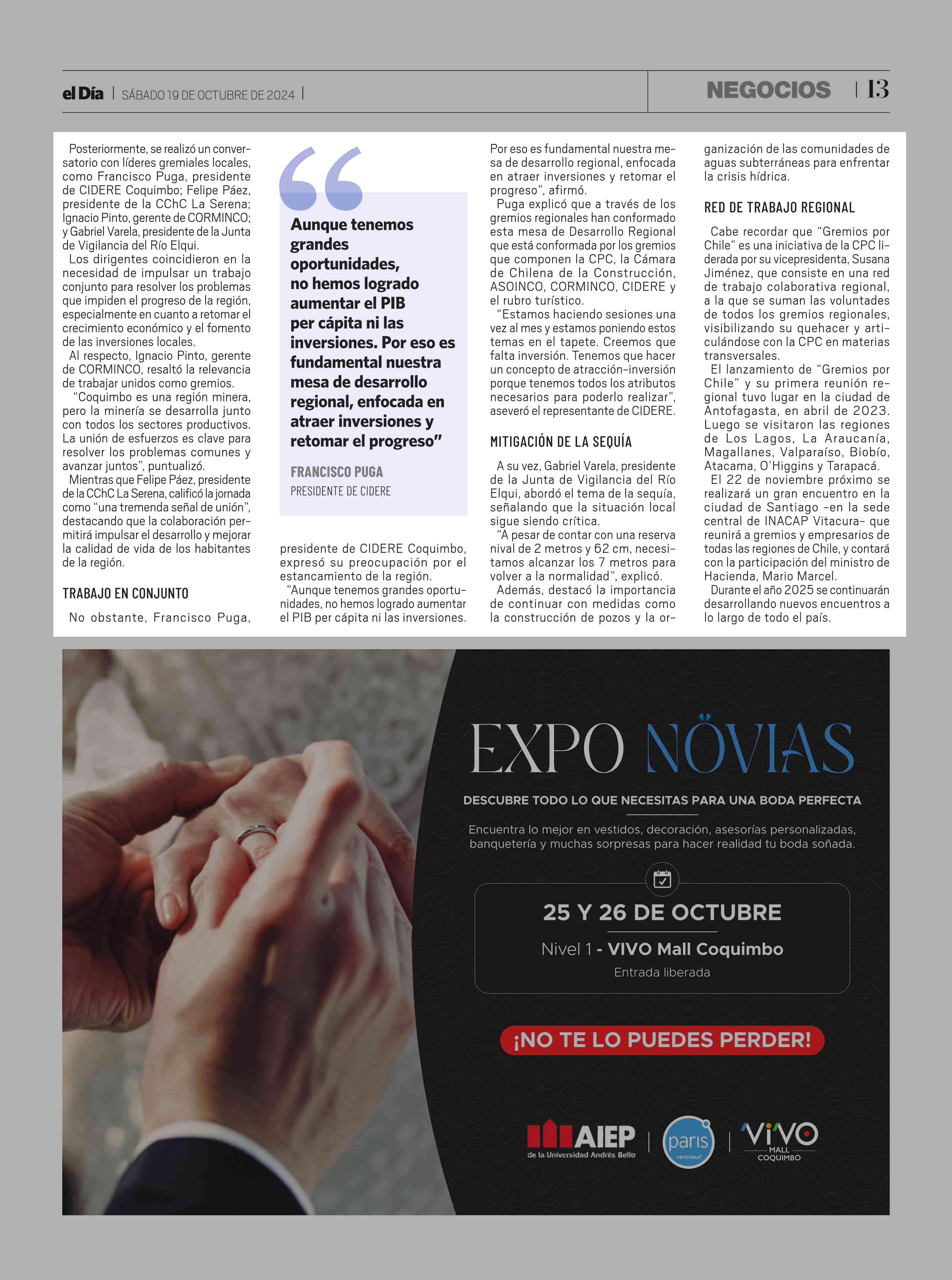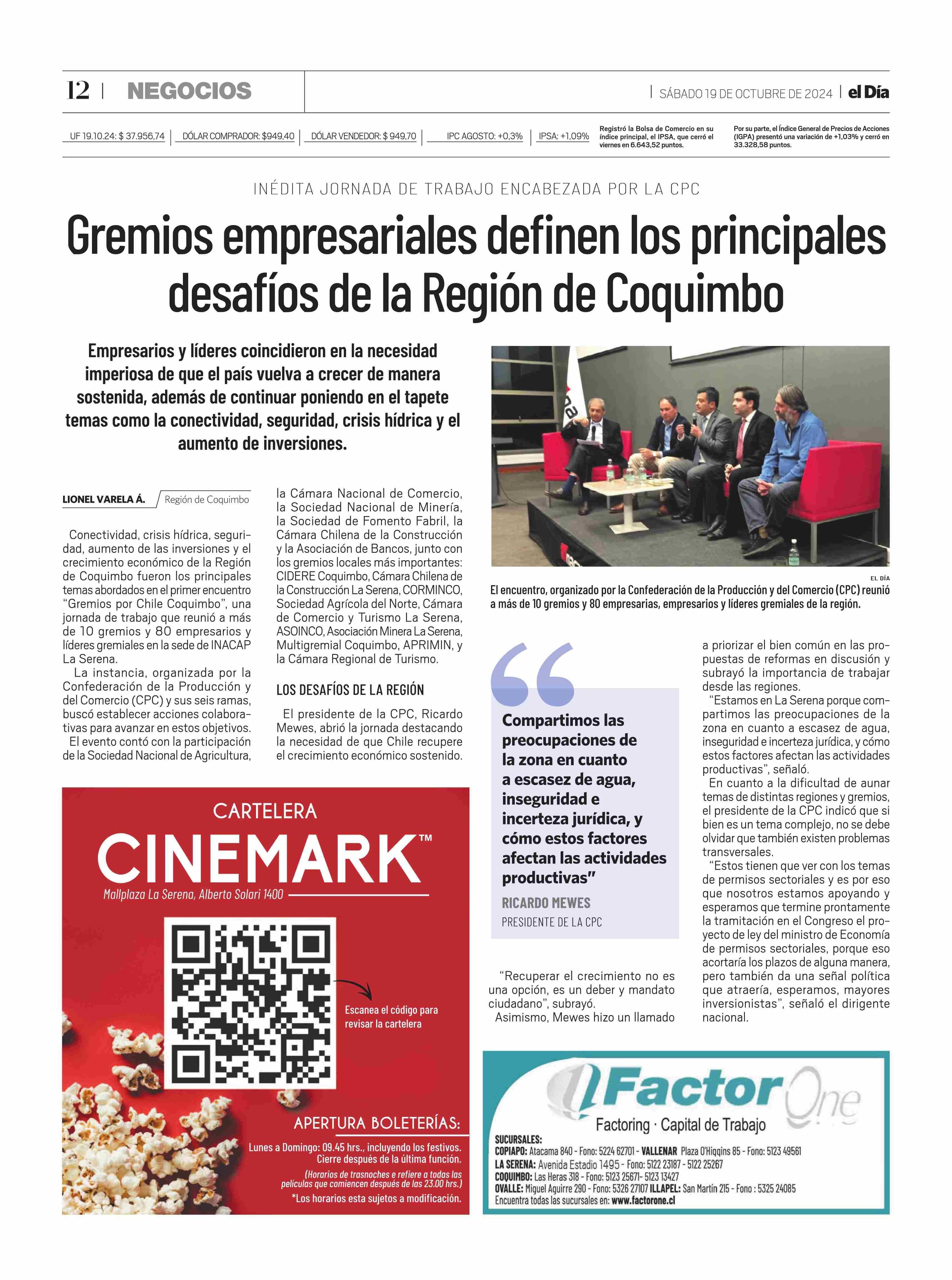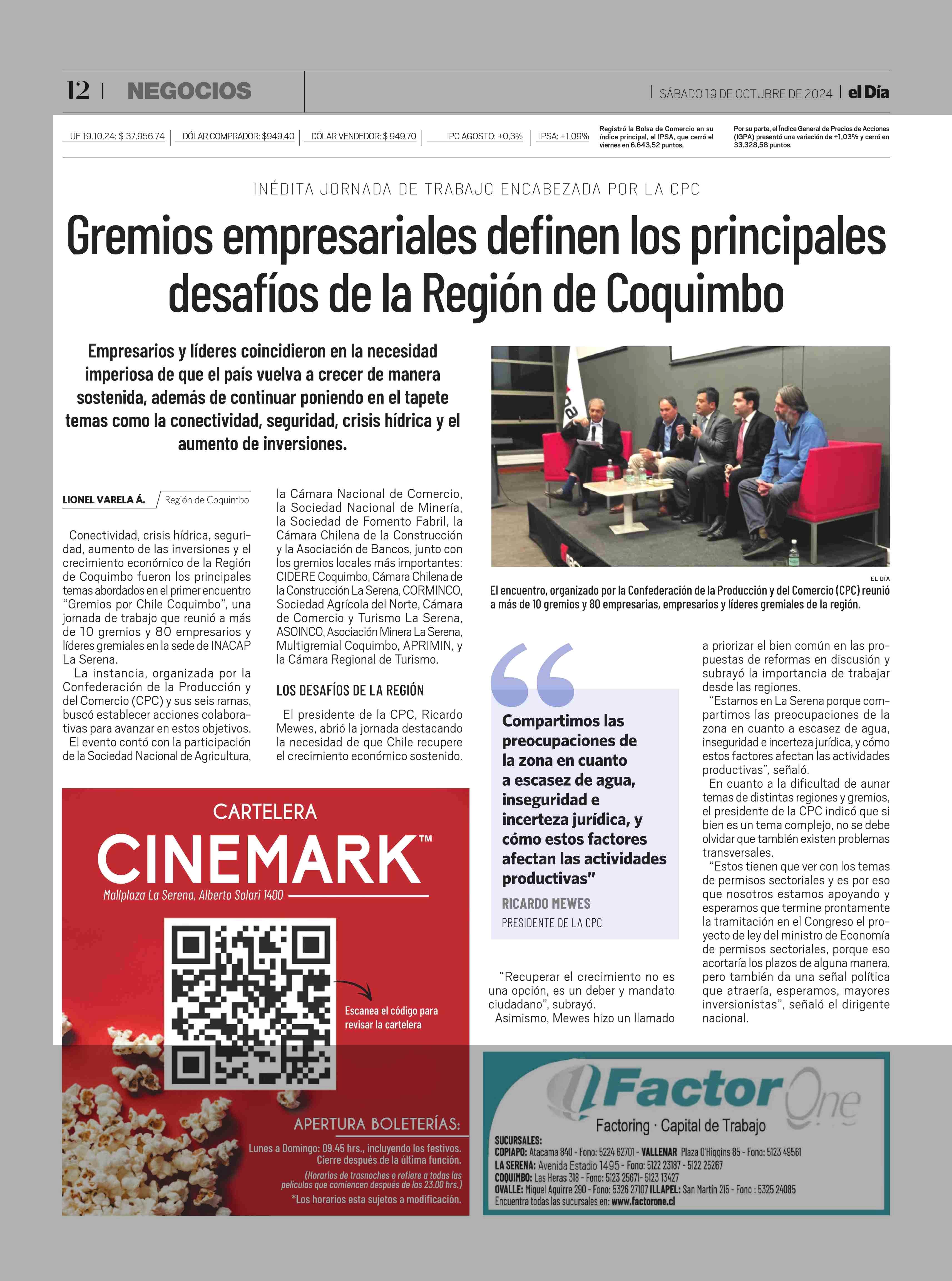 Gremios empresariales definen los principales desafíos de la Región de Coquimbo 19-10-2024 El Día |
