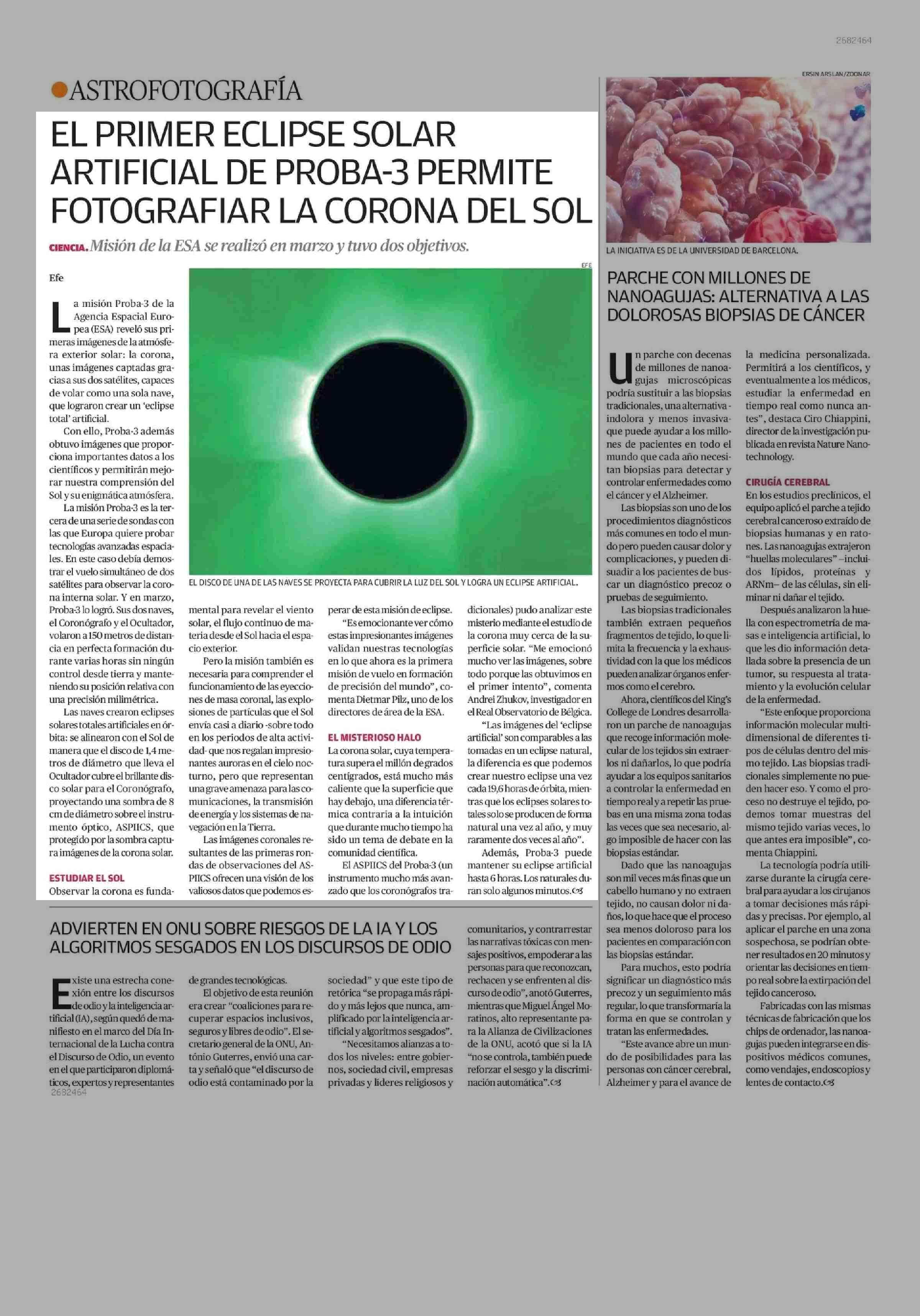 EL PRIMER ECLIPSE SOLAR ARTIFICIAL DE PROBA-3 PERMITE FOTOGRAFIAR LA CORONA DEL SOL 17-06-2025 El Mercurio de Antofagasta |