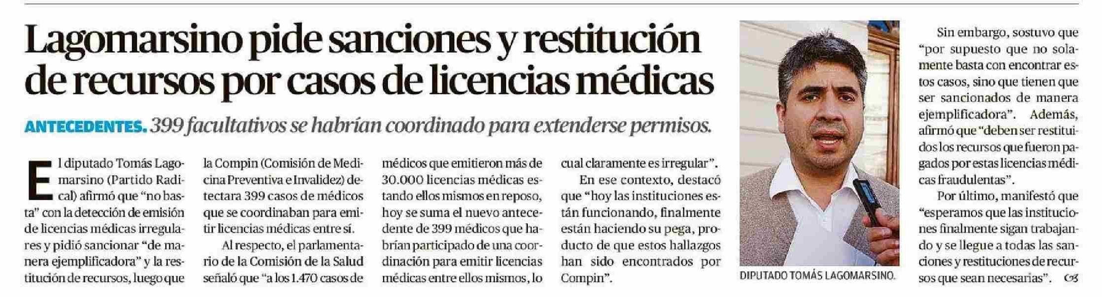 | Título: | Lagomarsino pide sanciones y restitución de recursos por casos de licencias médicas |
