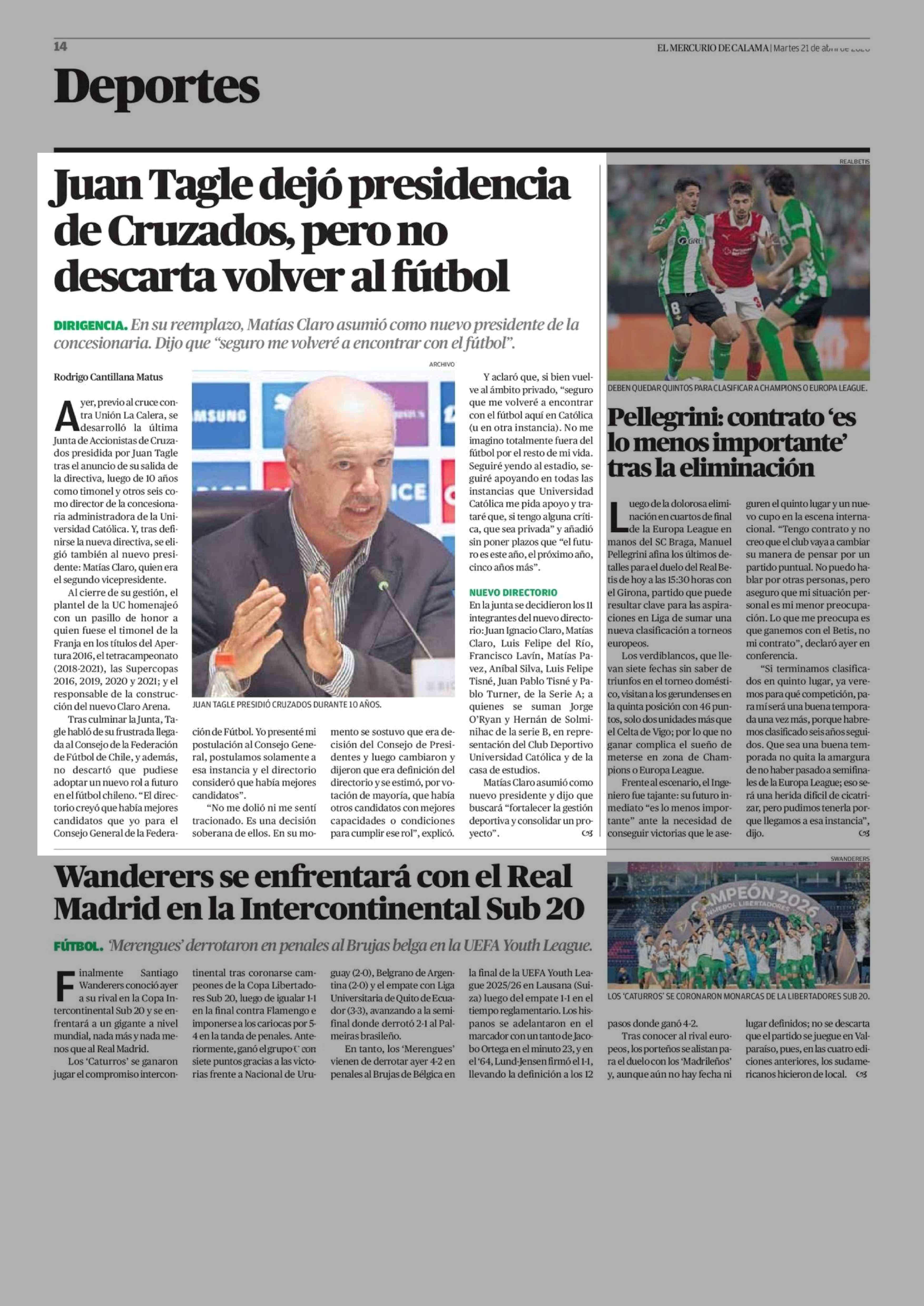 Juan Tagle dejó presidencia de Cruzados, pero no descarta volver al fútbol 21-04-2026 El Mercurio de Calama |