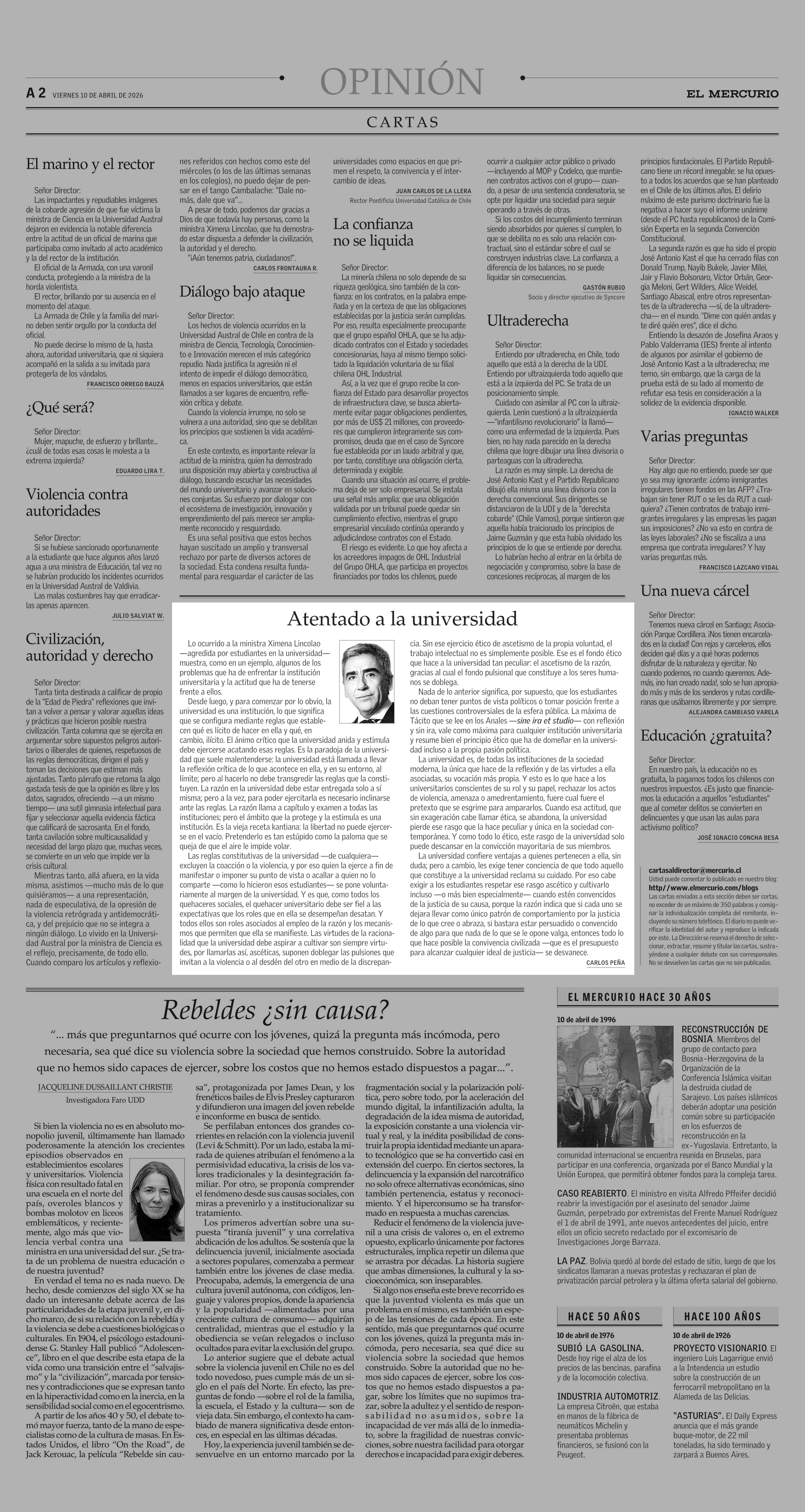 Columnas de Opinión: Atentado a la universidad 10-04-2026 El Mercurio |