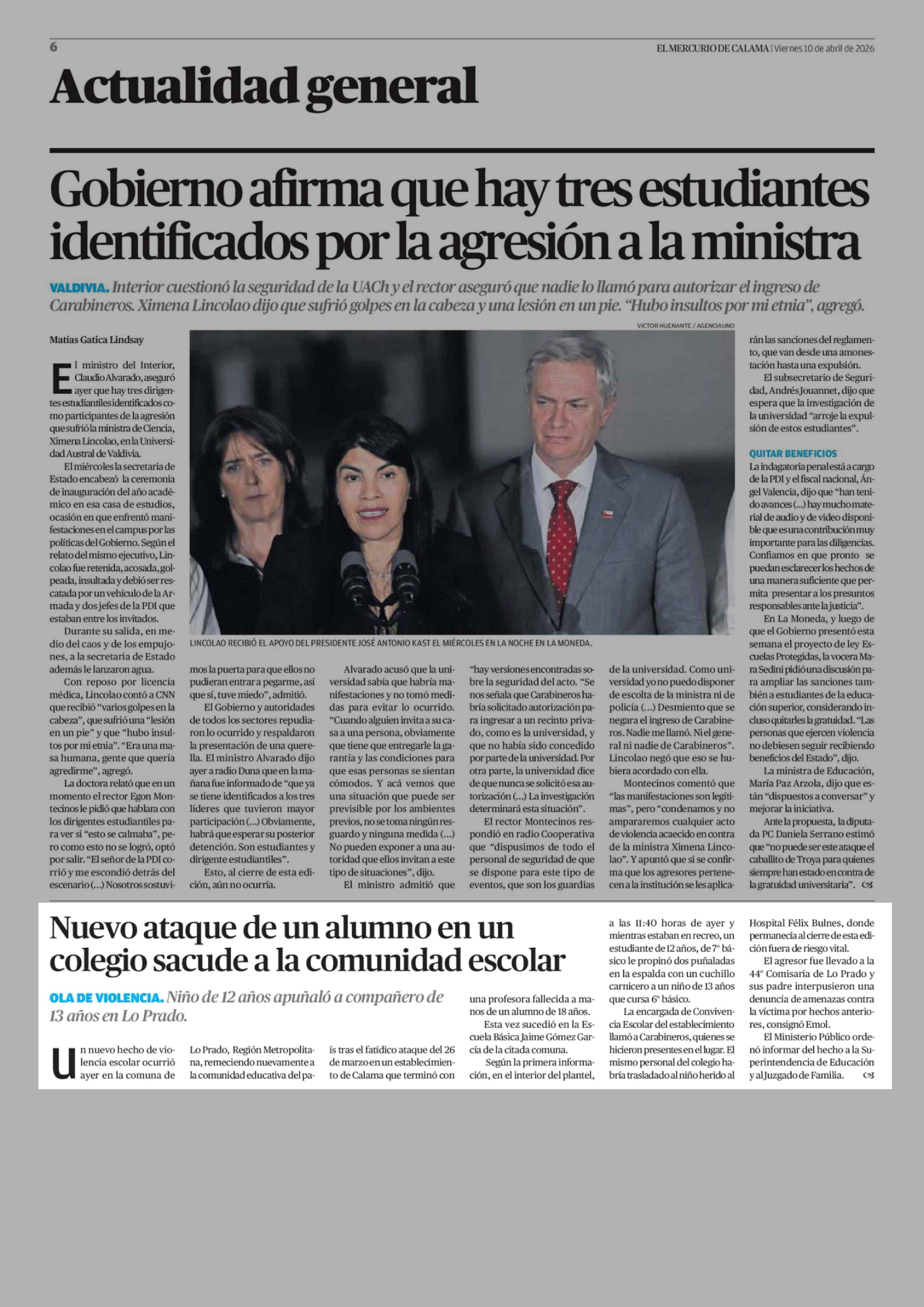 Nuevo ataque de un alumno en un colegio sacude a la comunidad escolar 10-04-2026 El Mercurio de Calama |