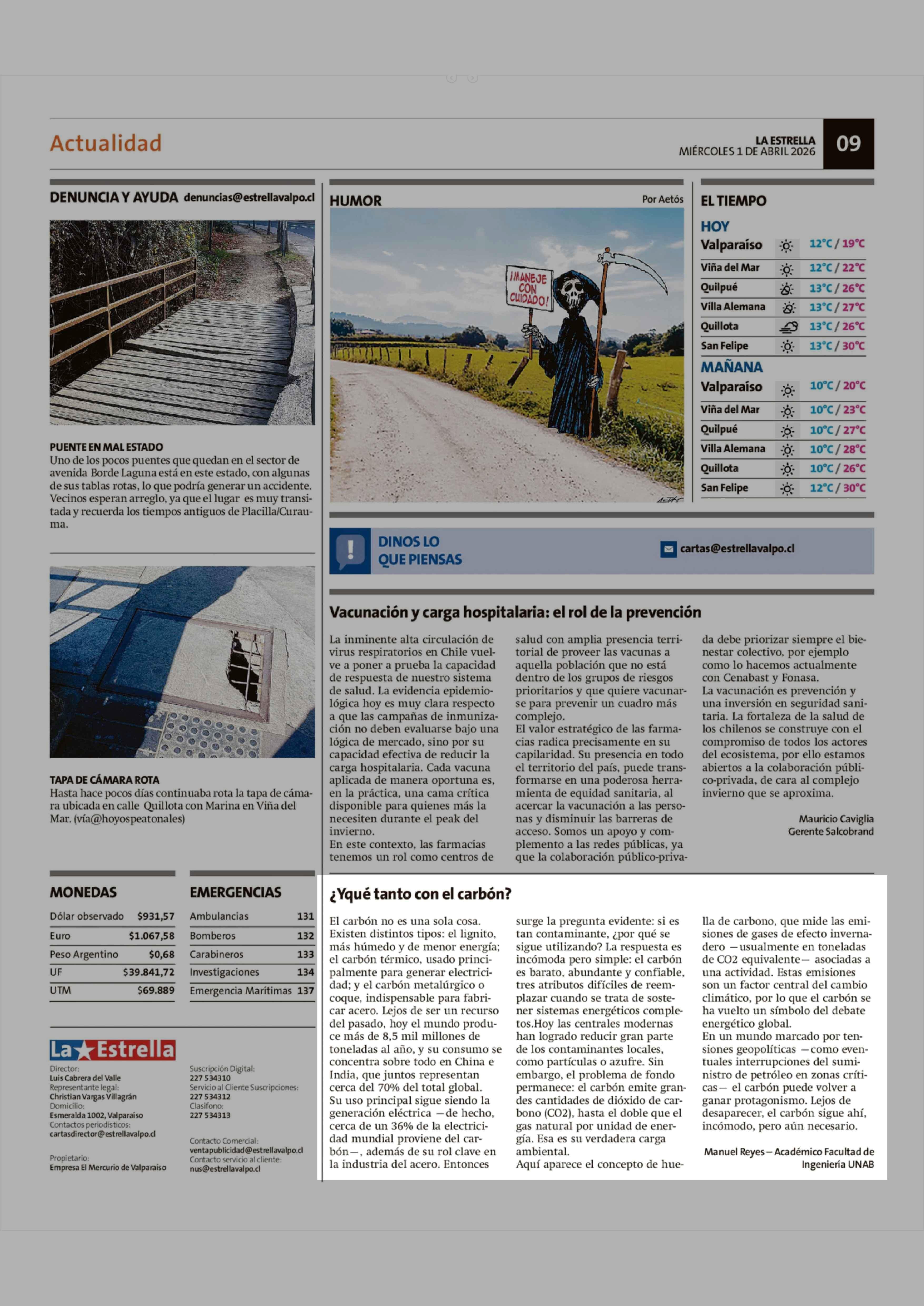 Columnas de Opinión: ¿Yqué tanto con el carbón? 01-04-2026 La Estrella de Valparaíso |