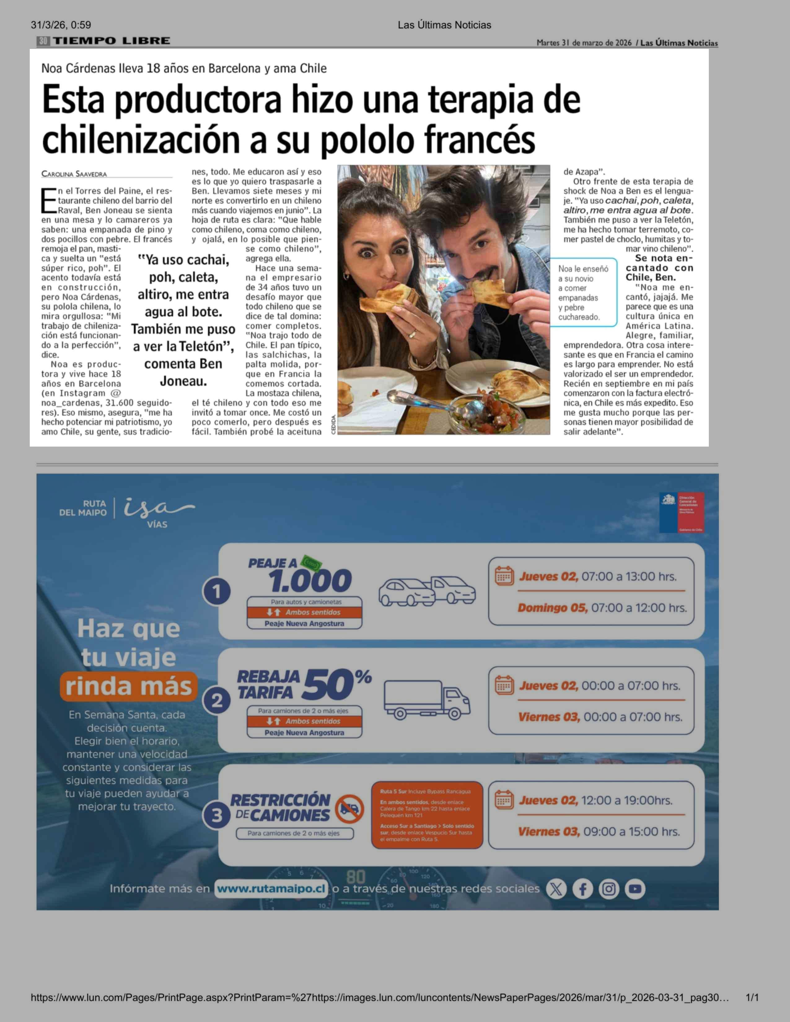 Esta productora hizo una terapia de chilenización a su pololo francés 31-03-2026 Las Últimas Noticias |