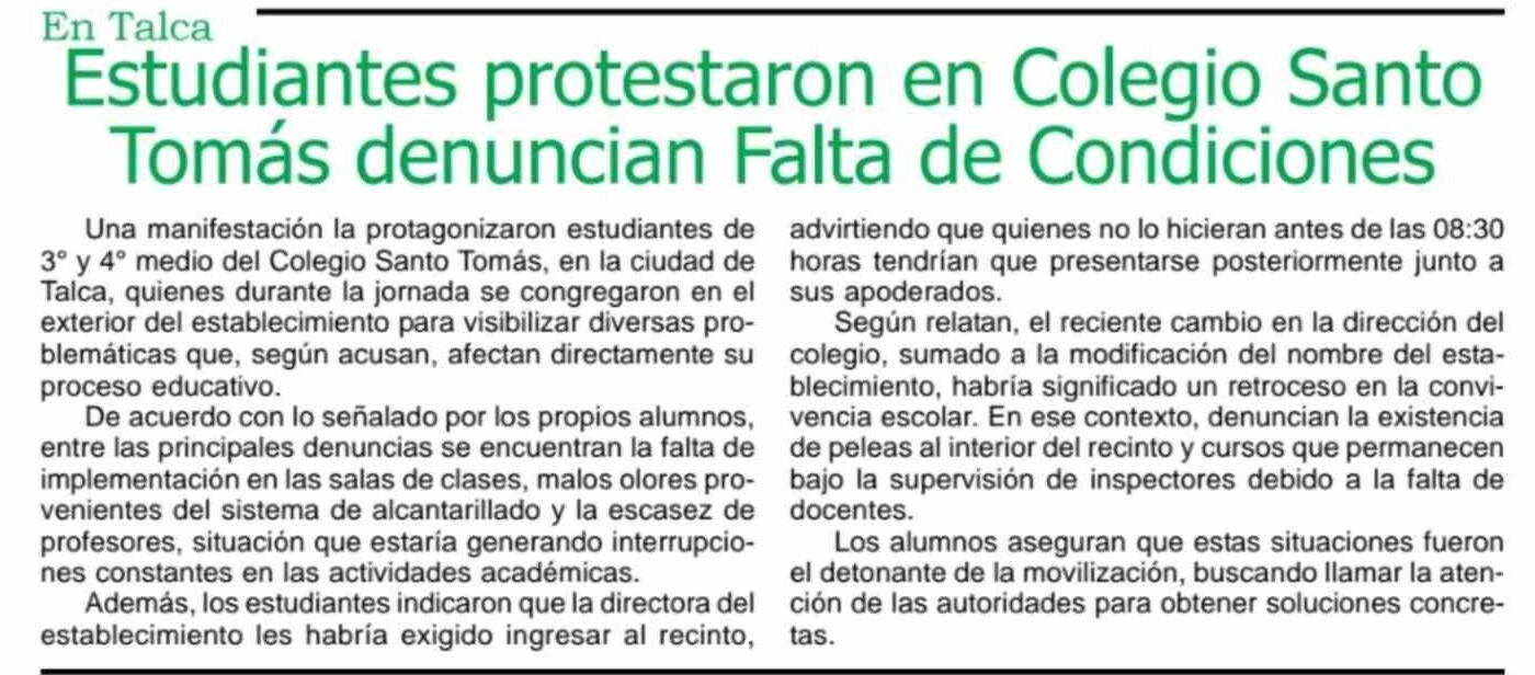 Estudiantes protestaron en Colegio Santo Tomás denuncian Falta de Condiciones 01-04-2026 Maule Hoy |