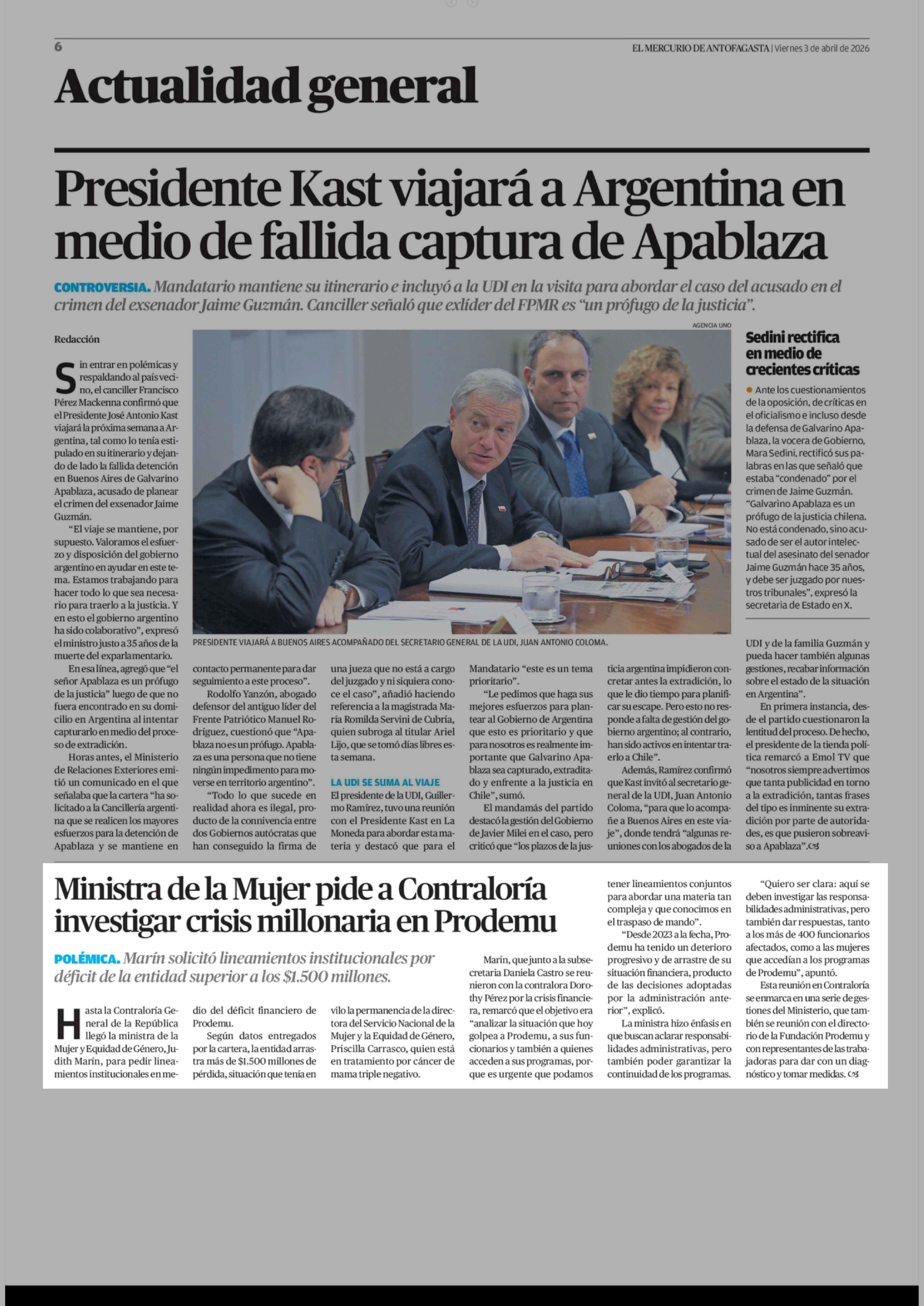 Ministra de la Mujer pide a Contraloría investigar crisis millonaria en Prodemu 03-04-2026 El Mercurio de Antofagasta |