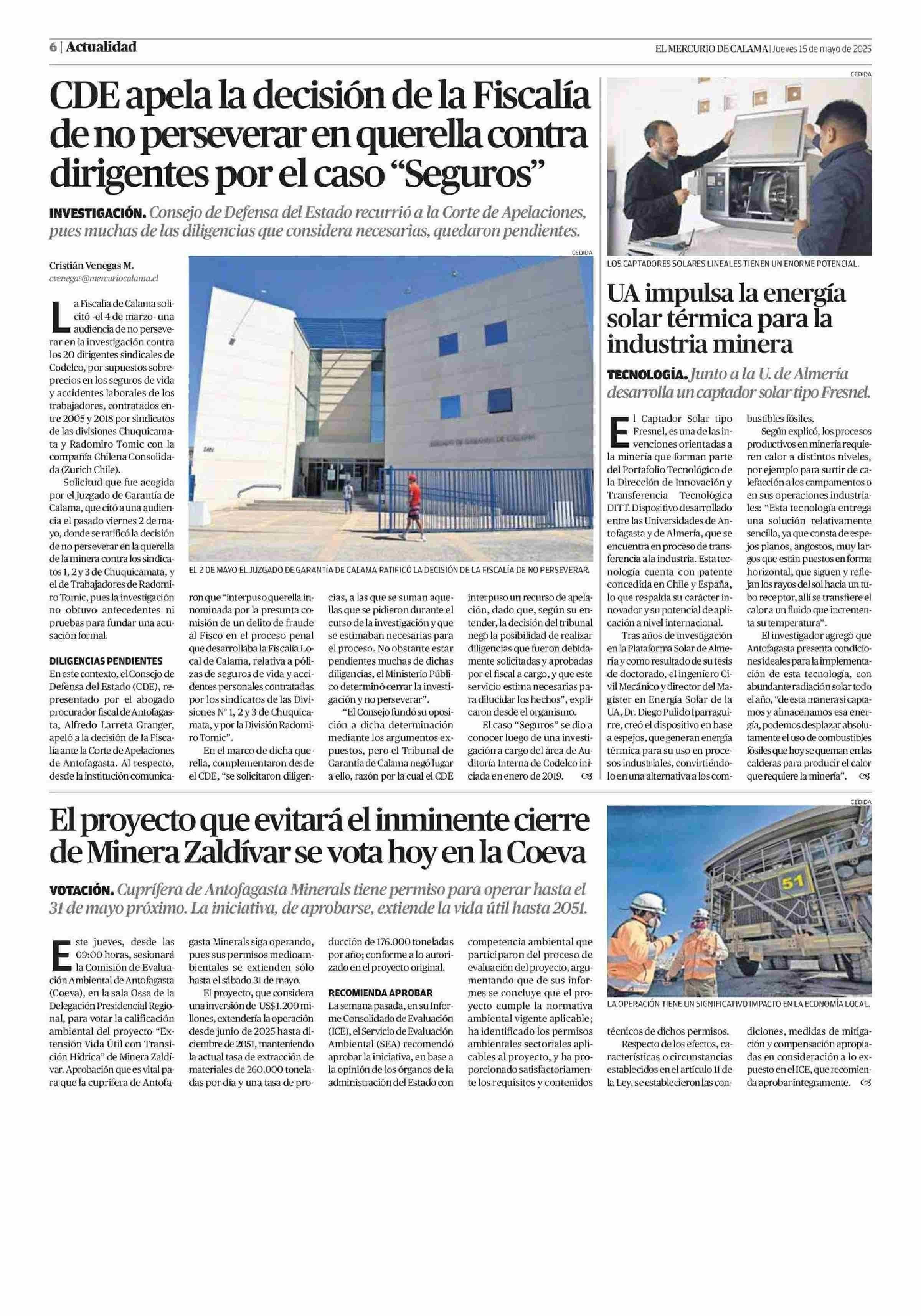 UA impulsa la energía solar térmica para industria minera 15-05-2025 El Mercurio de Calama |