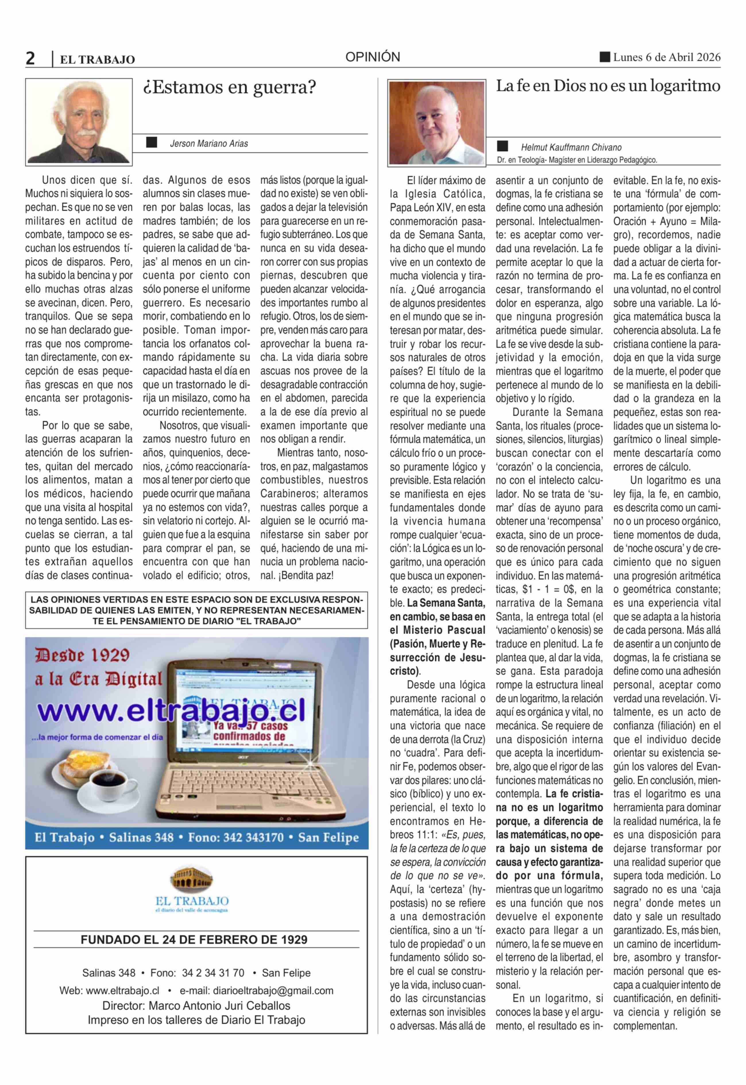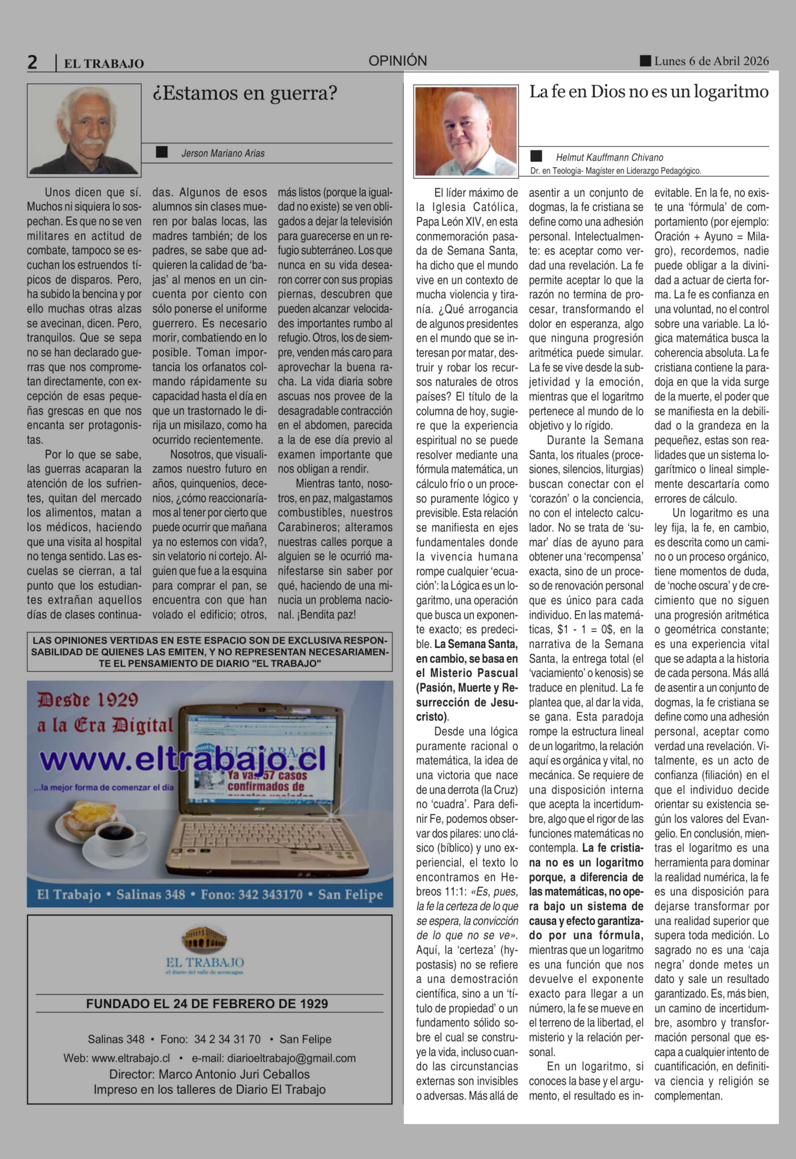 Columnas de Opinión: La fe en Dios no es un logaritmo 06-04-2026 El Trabajo |