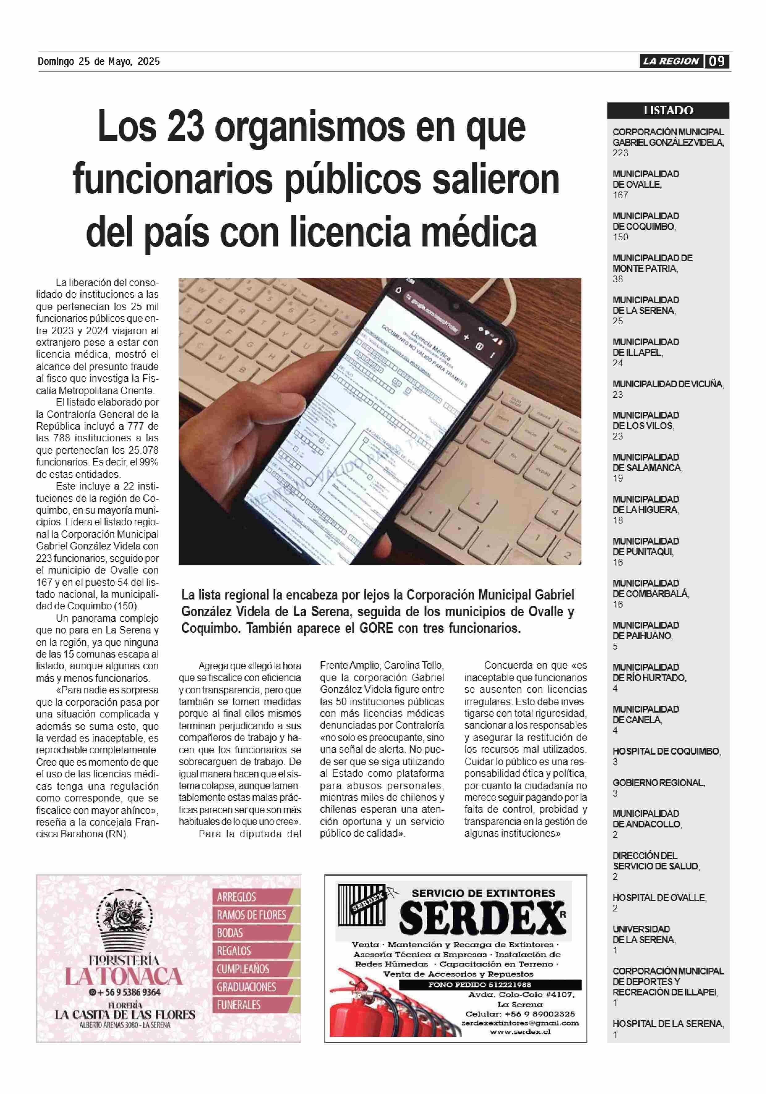 Los 23 organismos en que funcionarios públicos salieron del país con licencia médica 25-05-2025 Diario la Región |
