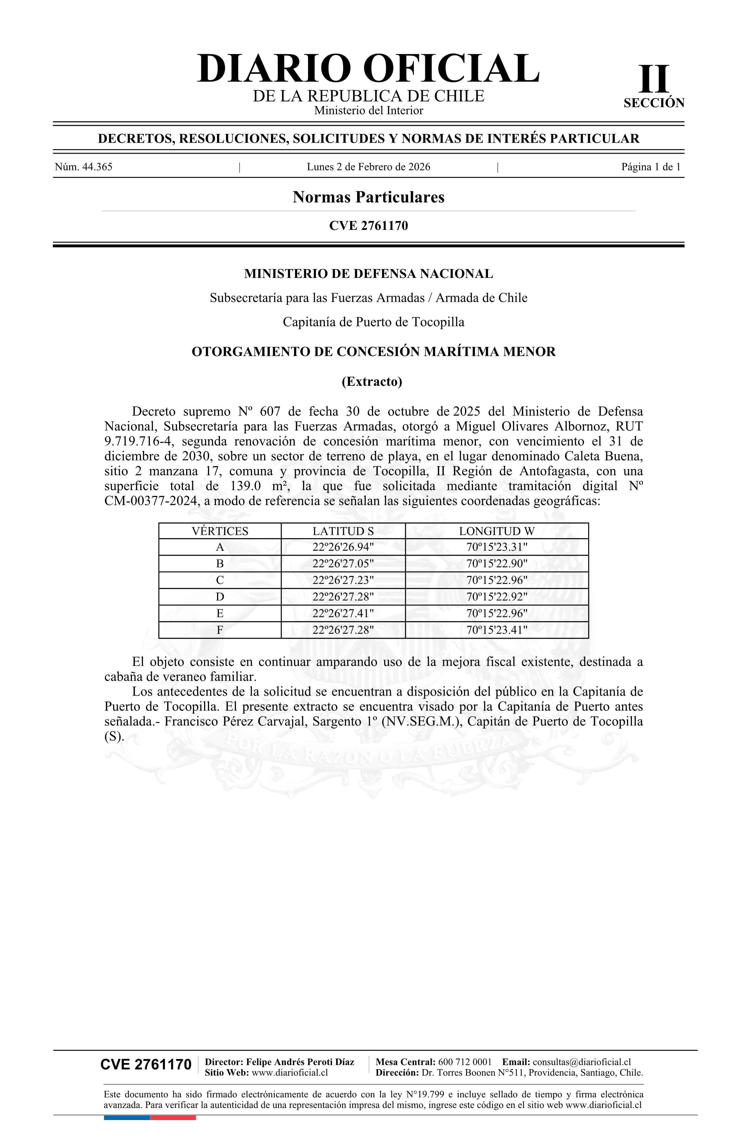 Extracto de decreto número 607, de 2025.- Otorgamiento de concesión marítima menor 02-02-2026 Diario Oficial Edición Electrónica |