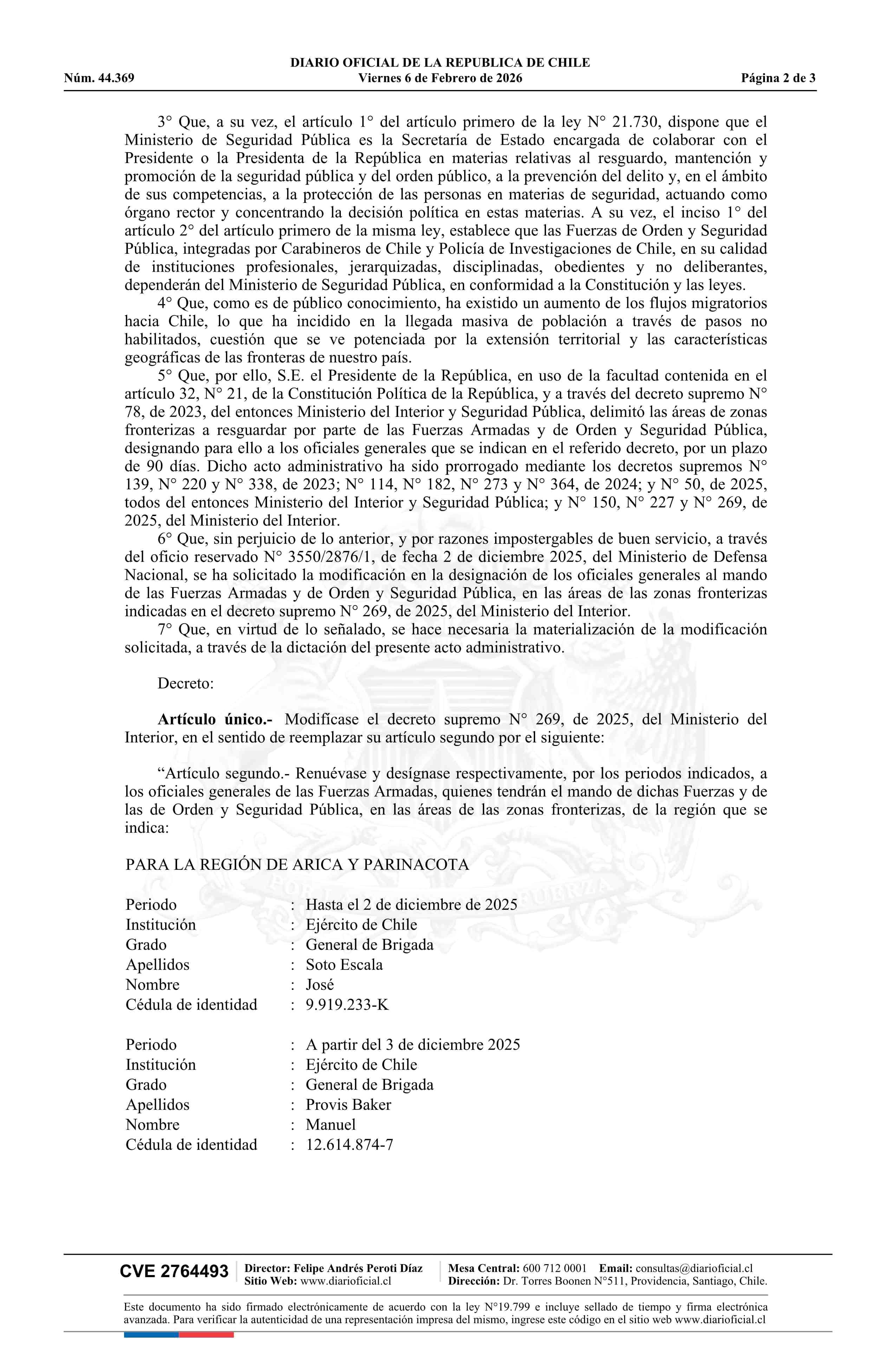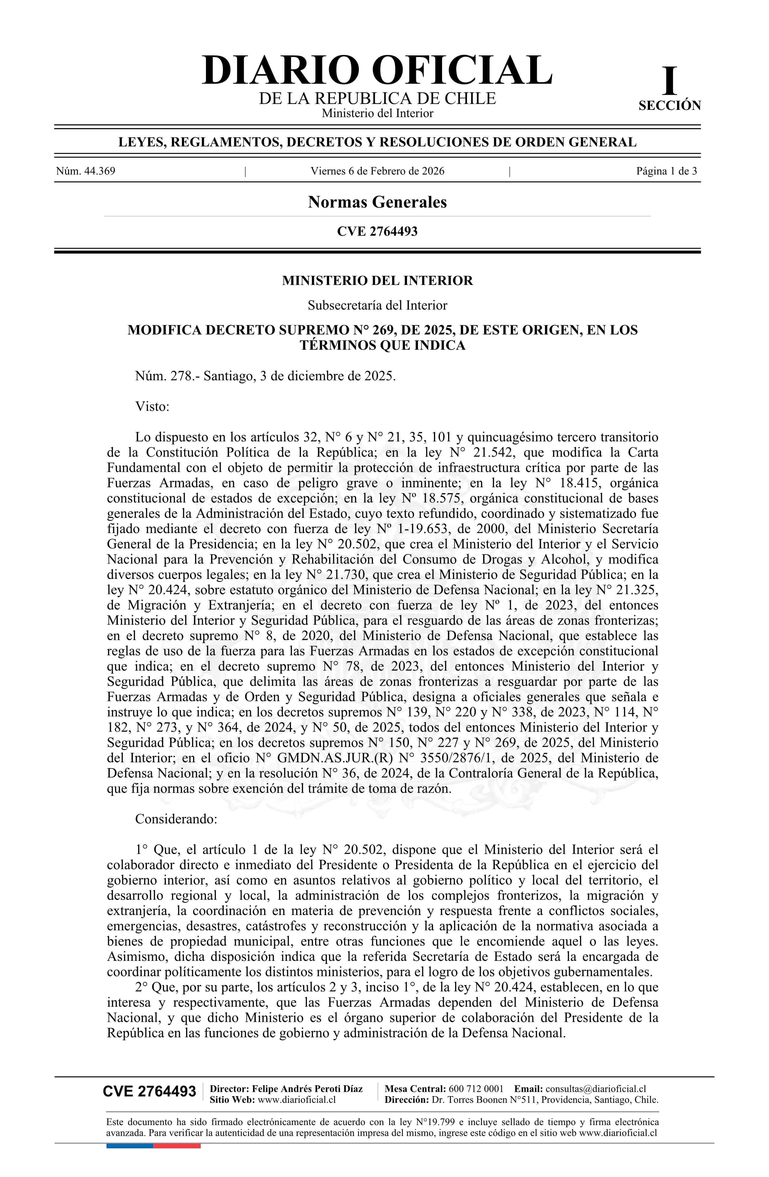 Decreto número 278, de 2025.- Modifica decreto N° 269, de 2025, en los términos que indica 06-02-2026 Diario Oficial Edición Electrónica |