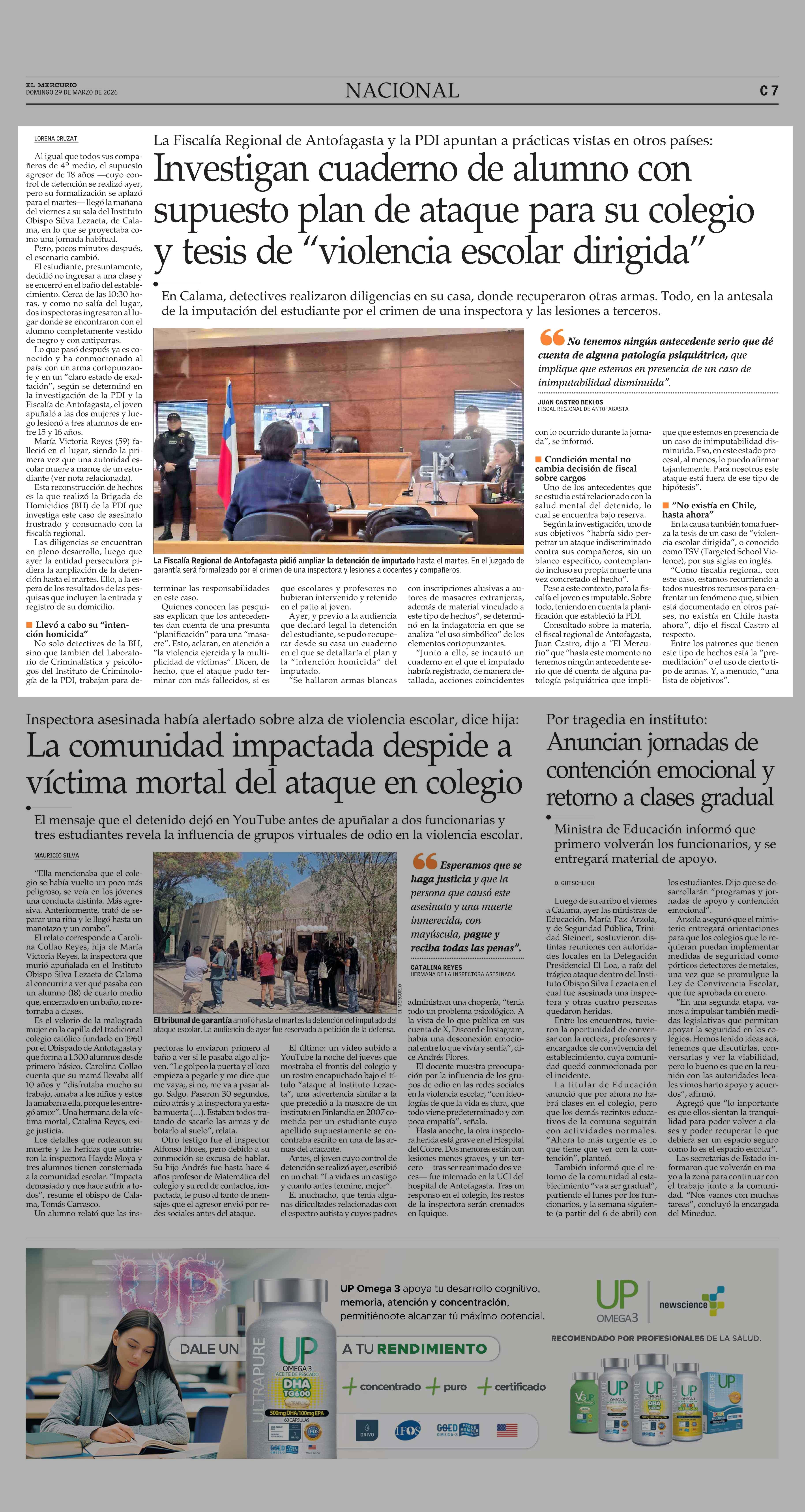 Investigan cuaderno de alumno con supuesto plan de ataque para su colegio y tesis de “violencia escolar dirigida” 29-03-2026 El Mercurio |
