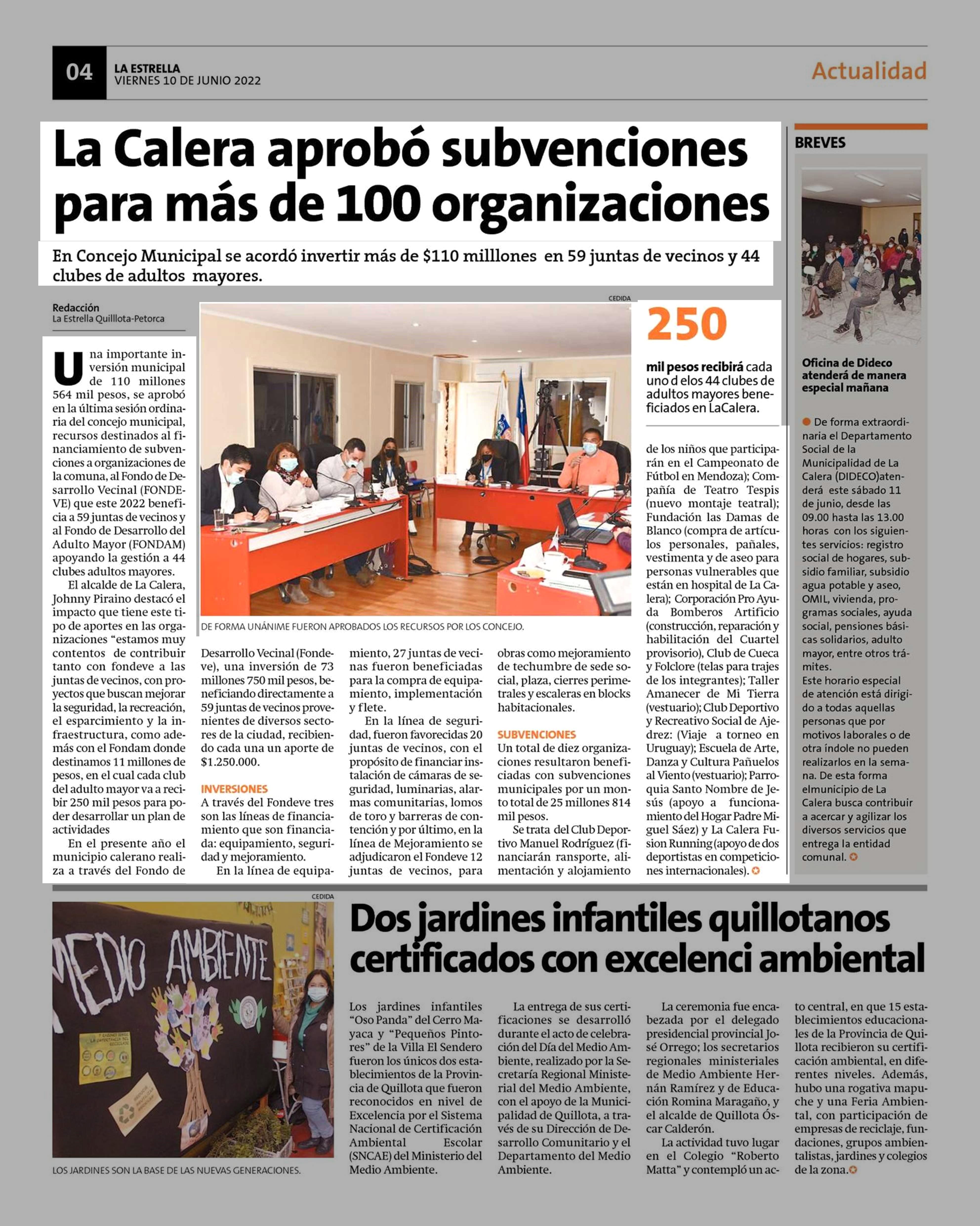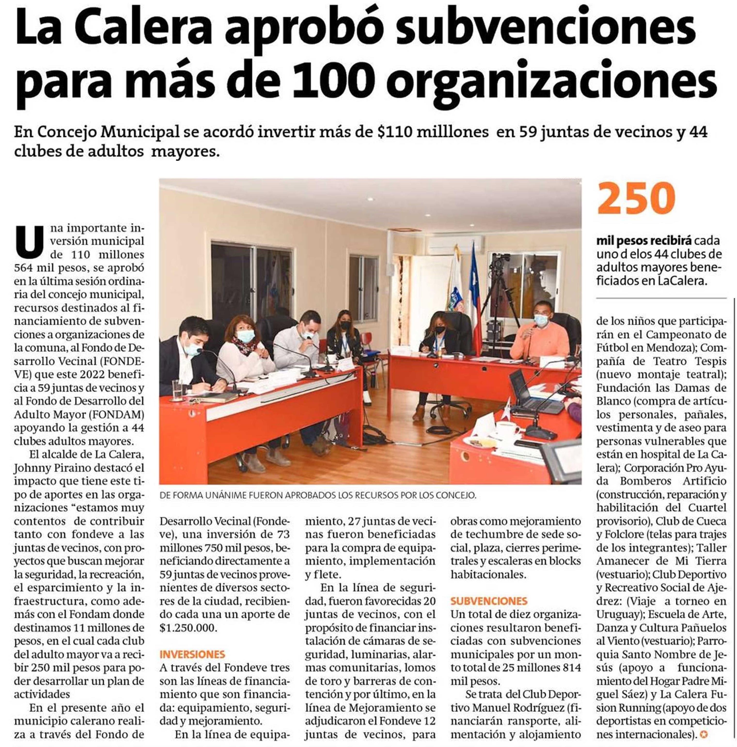 La Calera aprobó subvenciones para más de 100 organizaciones 10-06-2022 La Estrella de Quillota |