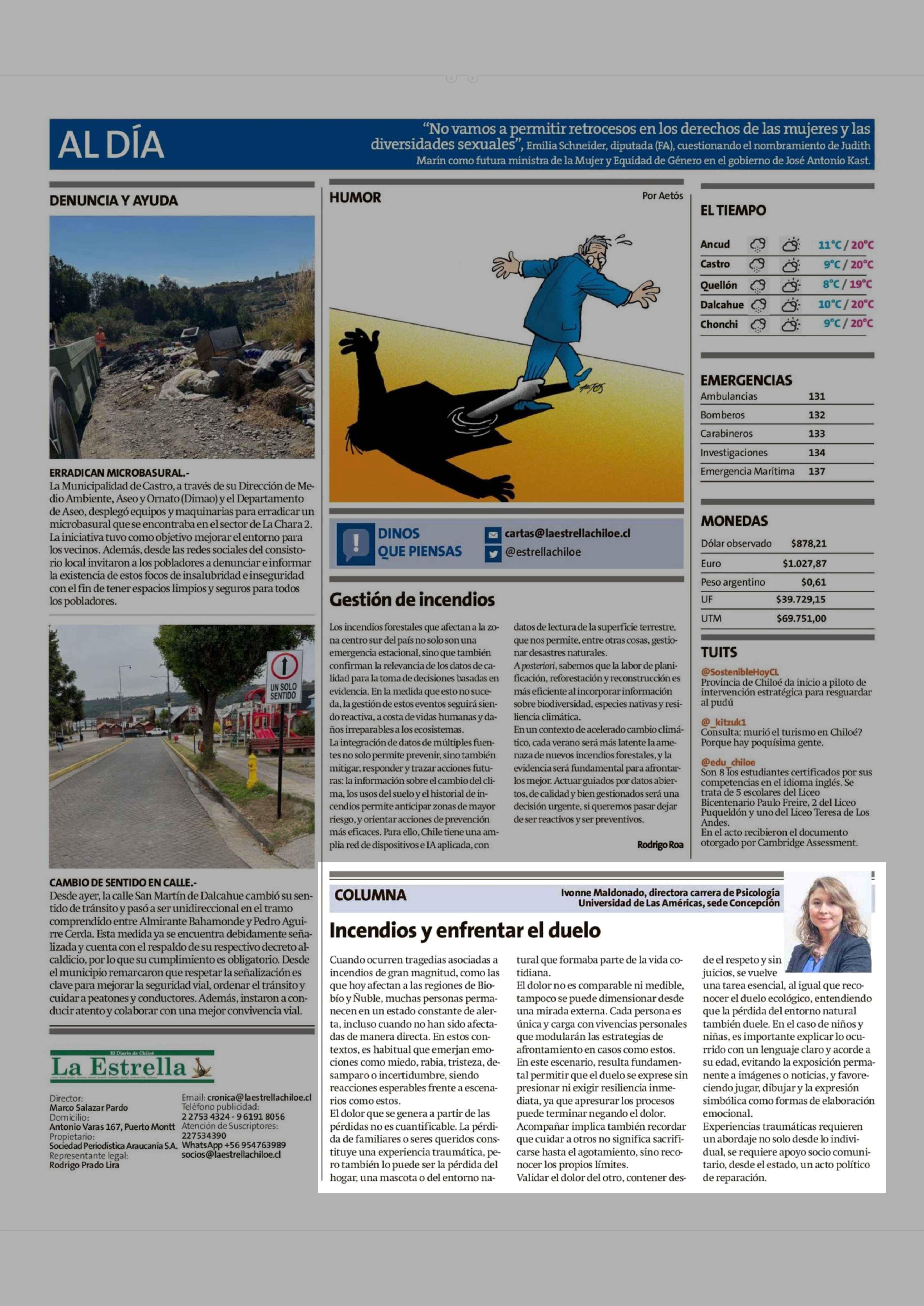Columnas de Opinión: Incendios y enfrentar el duelo 22-01-2026 La Estrella de Chiloé |