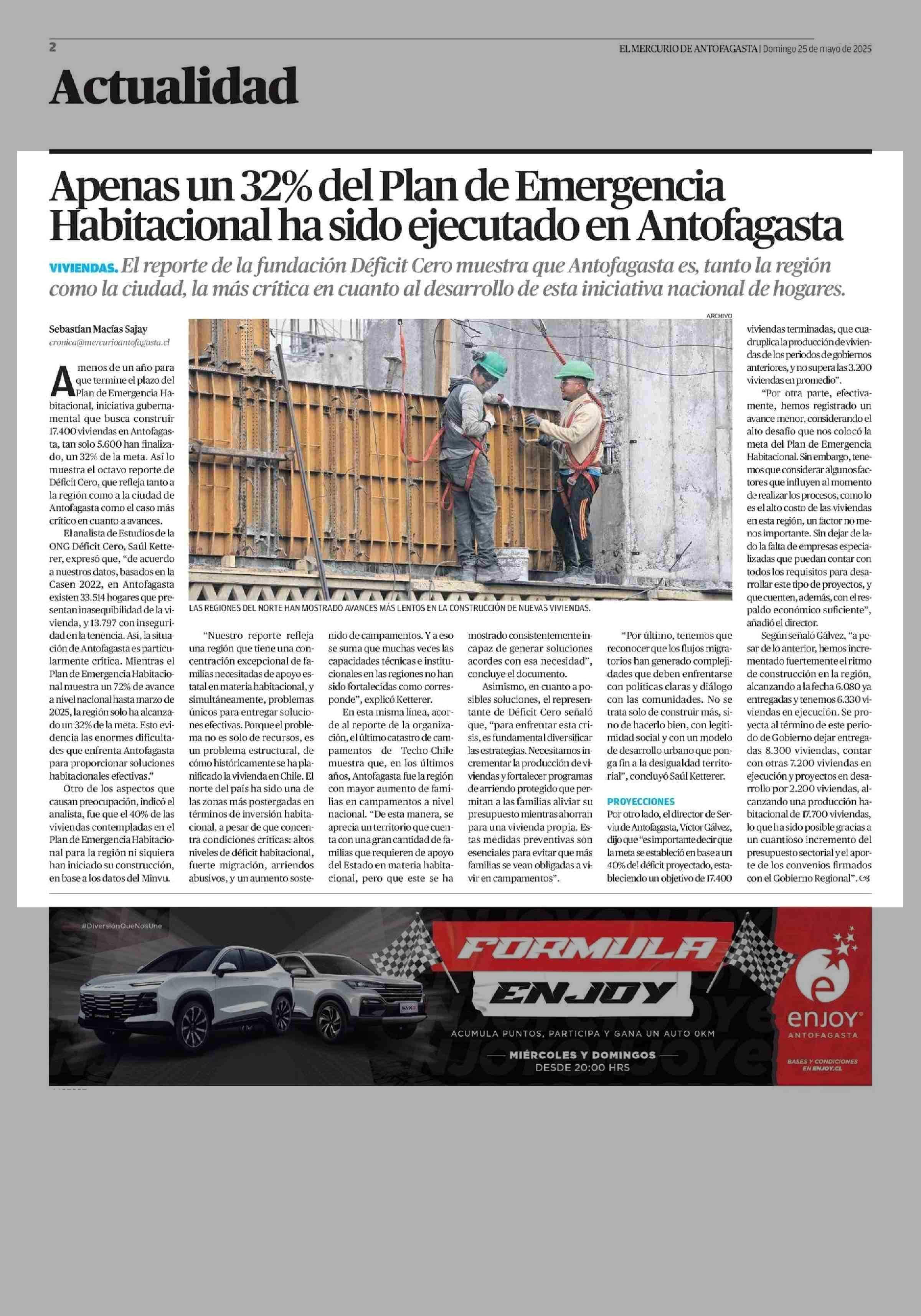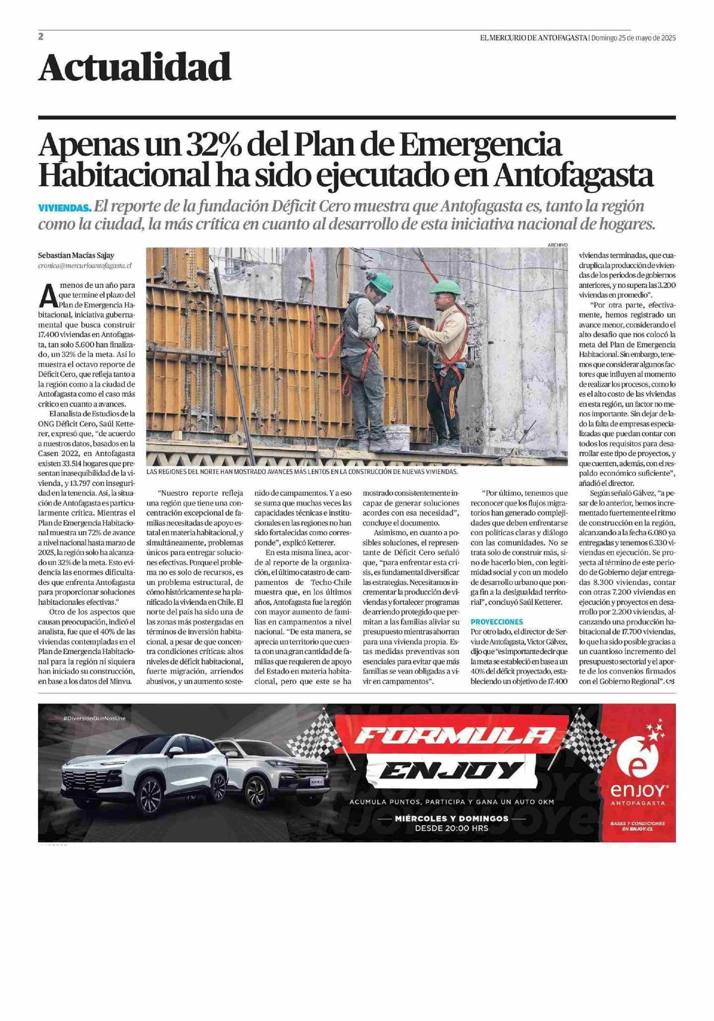 Apenas un 32% del Plan de Emergencia Habitacional ha sido ejecutado en Antofagasta 25-05-2025 El Mercurio de Antofagasta |
