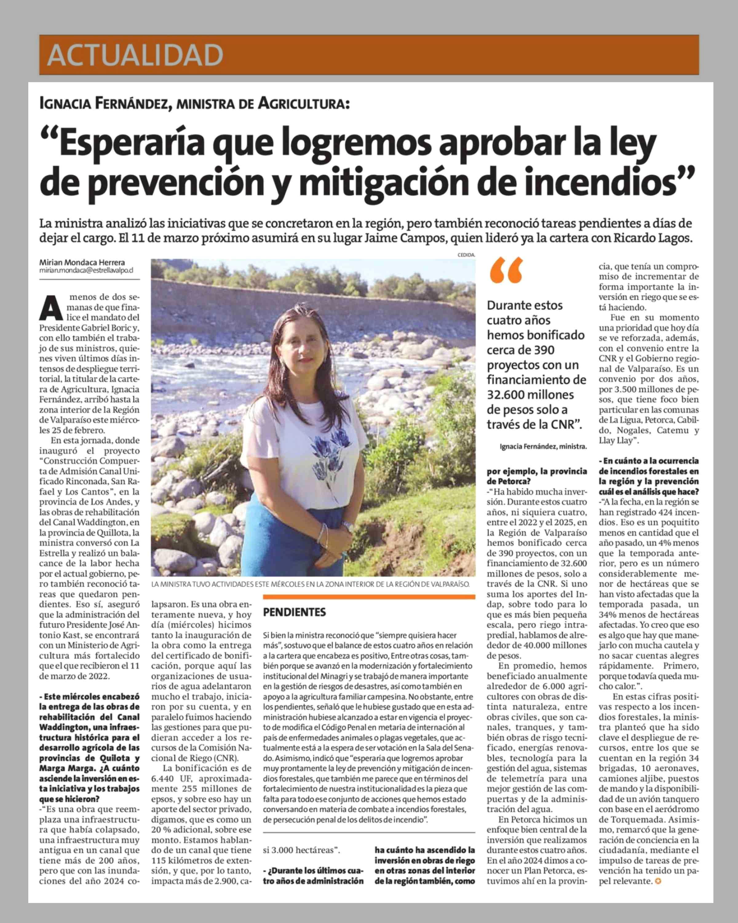 "Esperaría que logremos aprobar la ley de prevención y mitigación de incendios" 27-02-2026 La Estrella de Quillota |