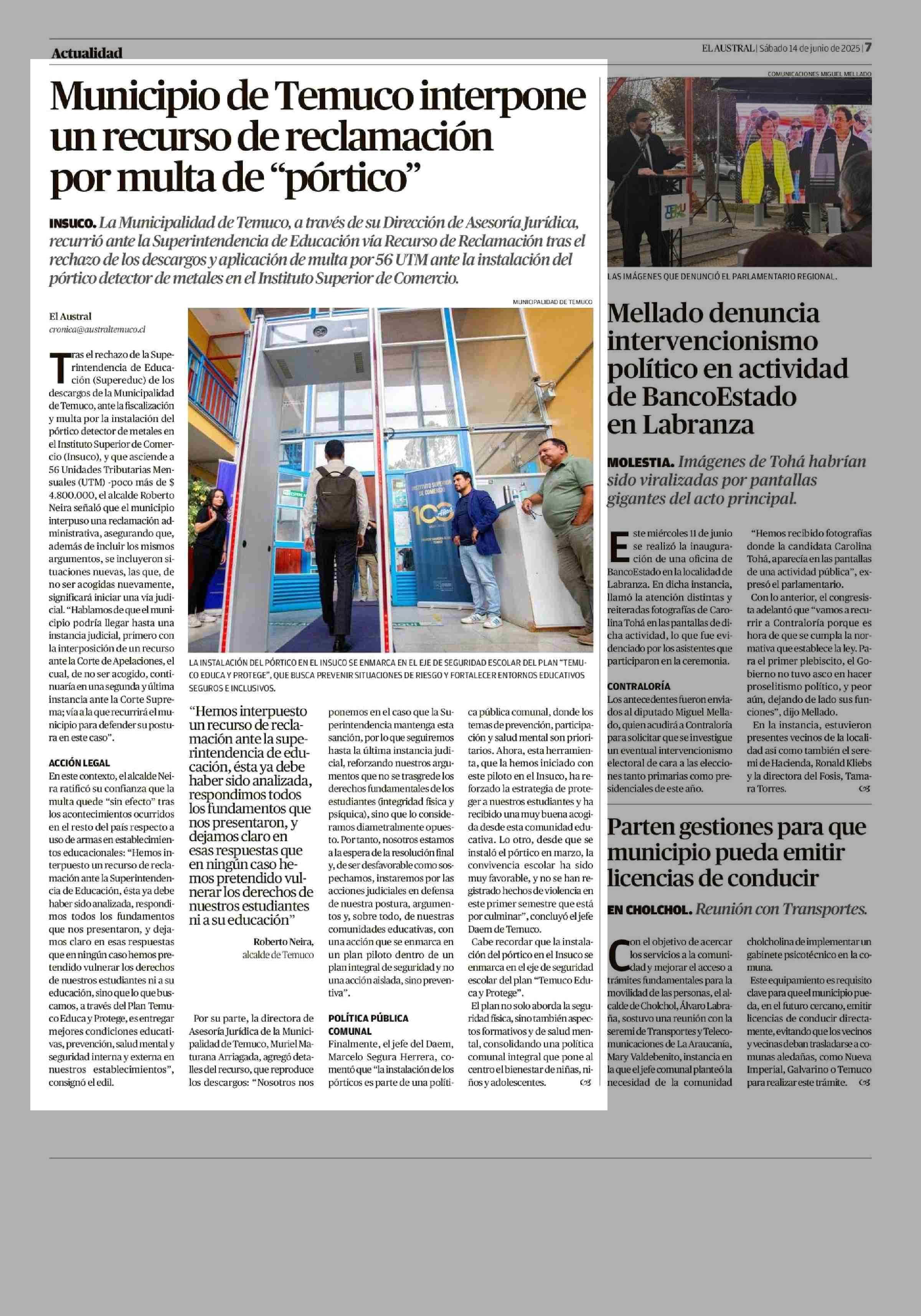 Municipio de Temuco interpone por multa de "pórtico" un recurso de reclamación 14-06-2025 El Austral de la Araucanía |