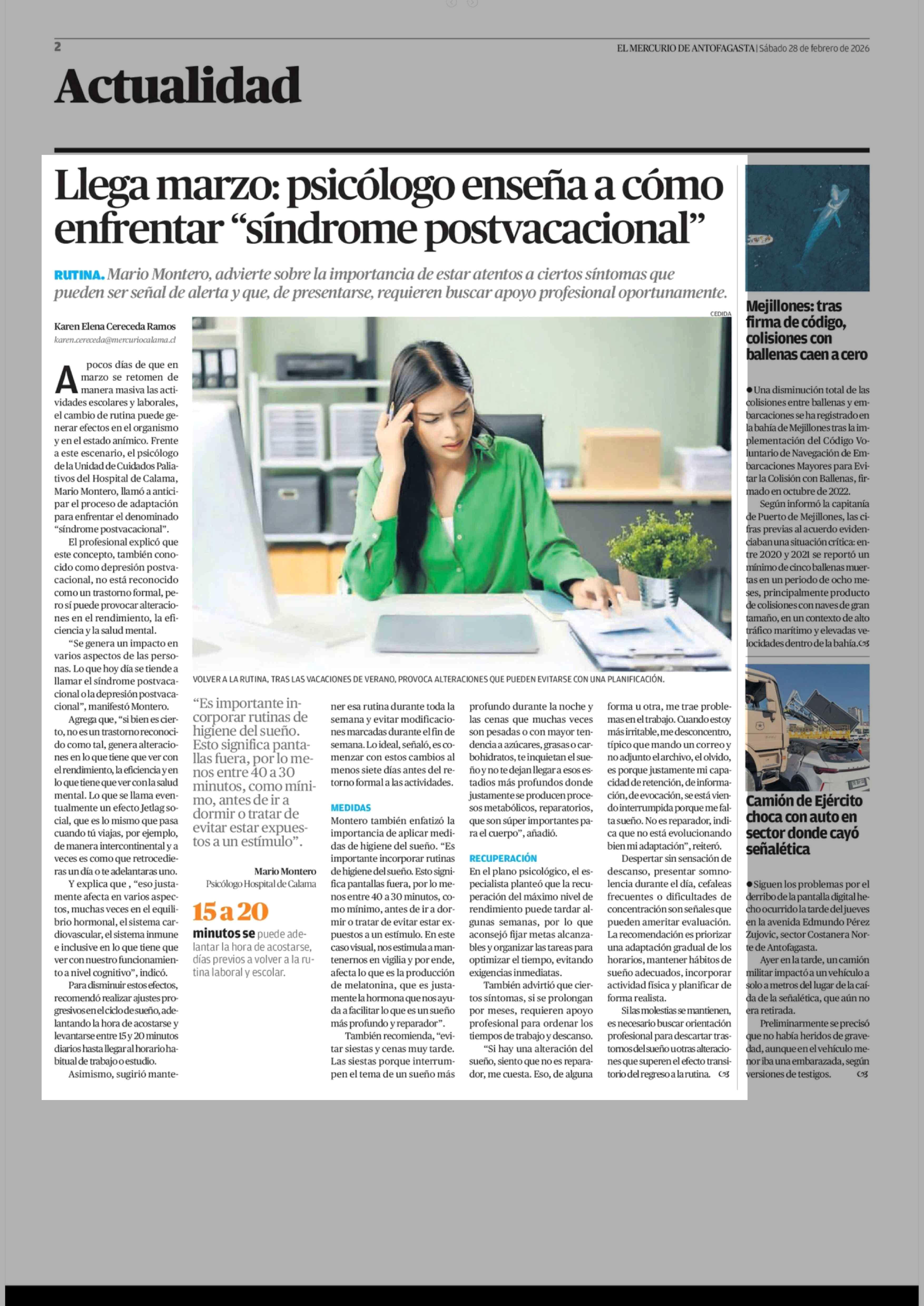 Llega marzo: psicólogo enseña a cómo enfrentar "síndrome postvacacional" 28-02-2026 El Mercurio de Antofagasta |