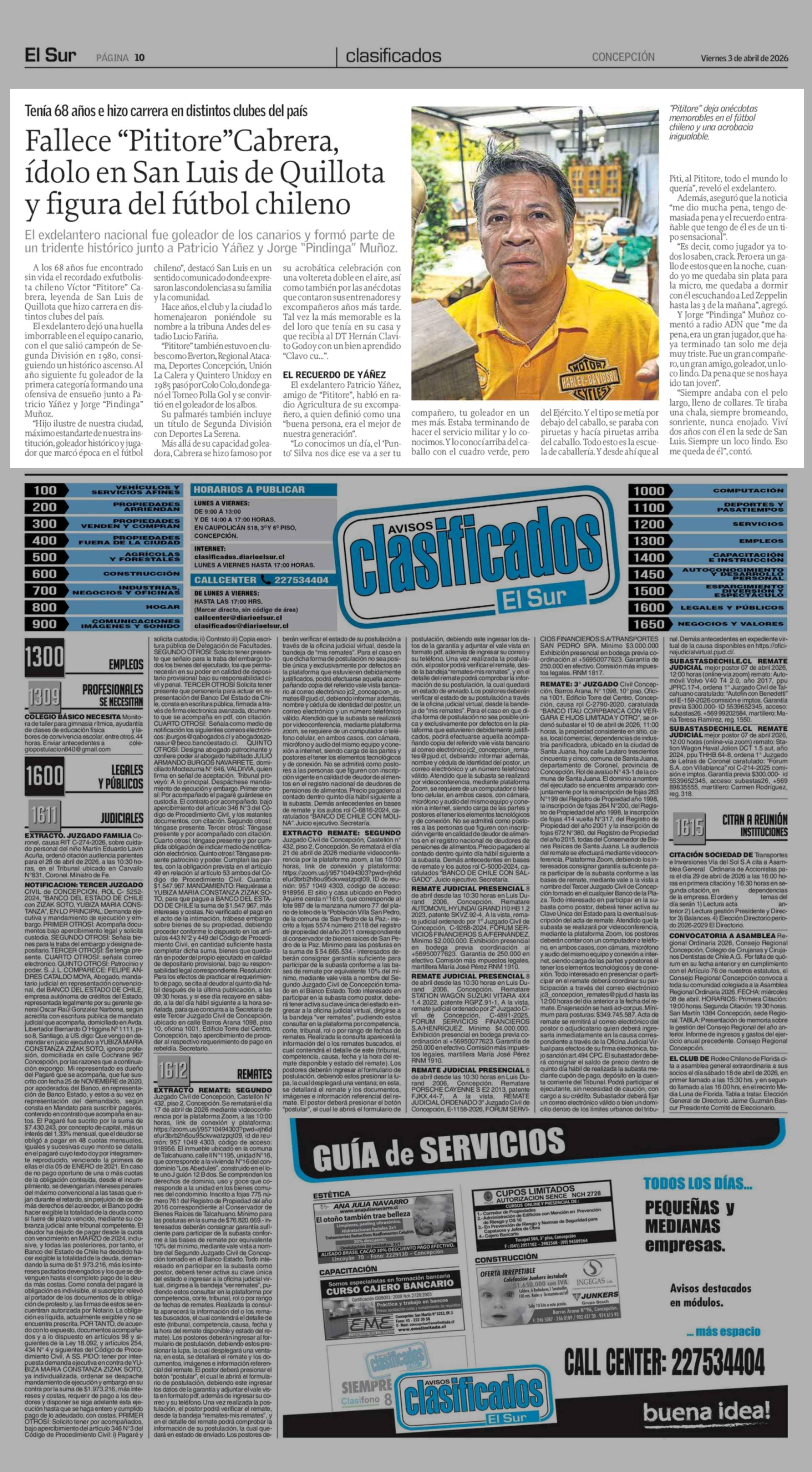 Fallece "Pititore"Cabrera, ídolo en San Luis de Quillota y figura del fútbol chileno 03-04-2026 El Sur |