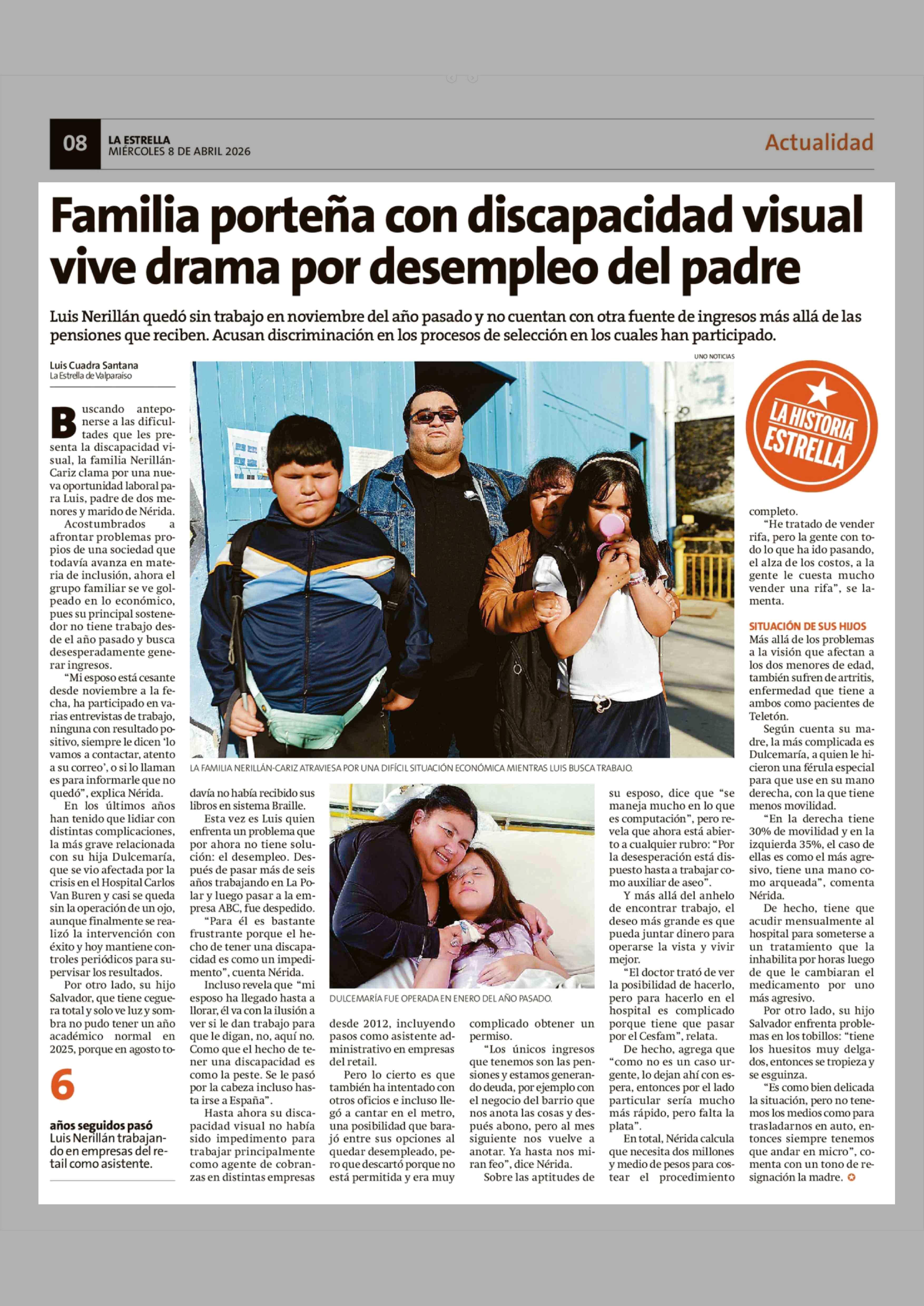 Familia porteña con discapacidad visual vive drama por desempleo del padre 08-04-2026 La Estrella de Valparaíso |