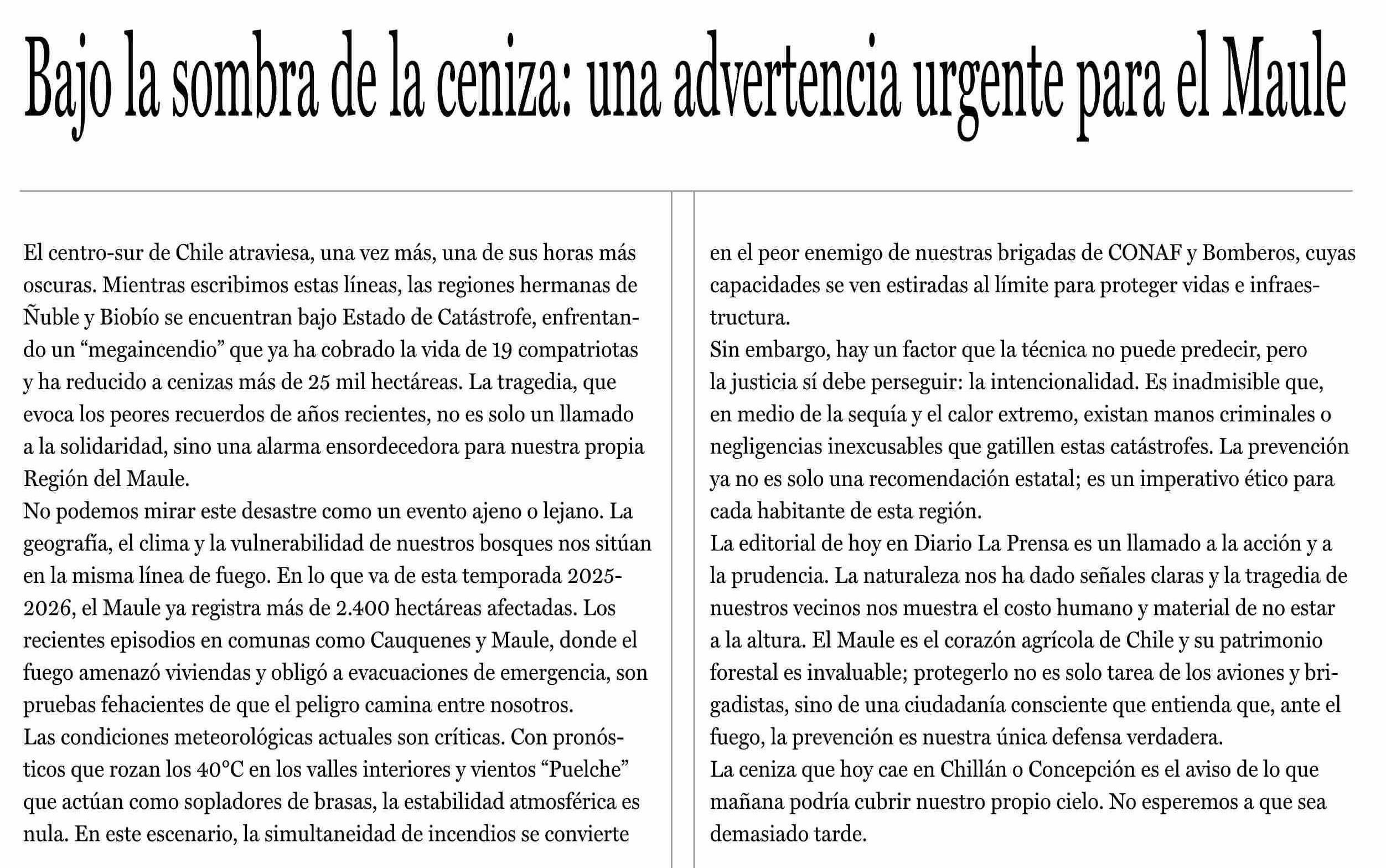 Editorial: Bajo la sombra de la ceniza: una advertencia urgente para el Maule 20-01-2026 La Prensa de Curicó |