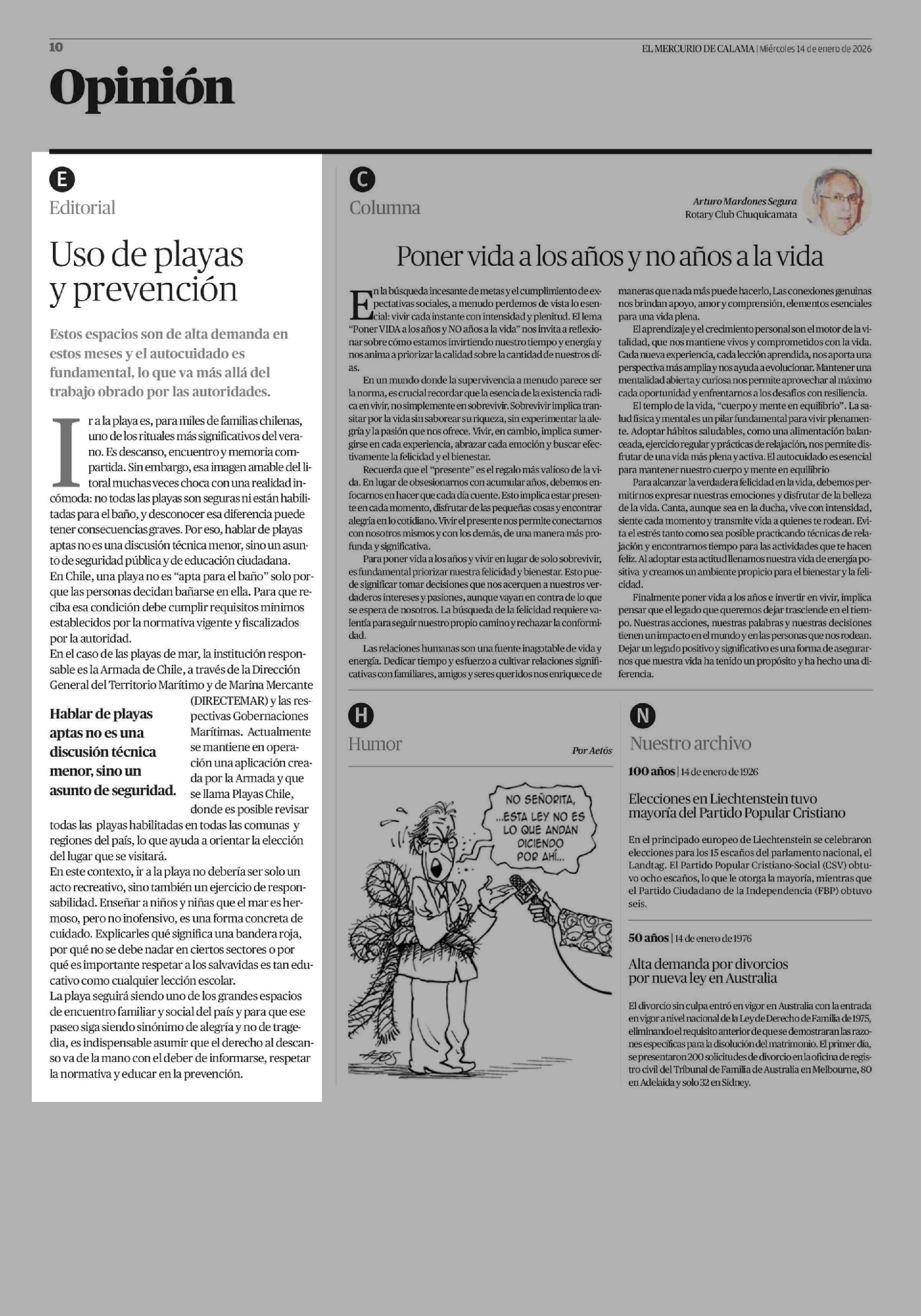 Editorial: Uso de playas y prevención 14-01-2026 El Mercurio de Calama |