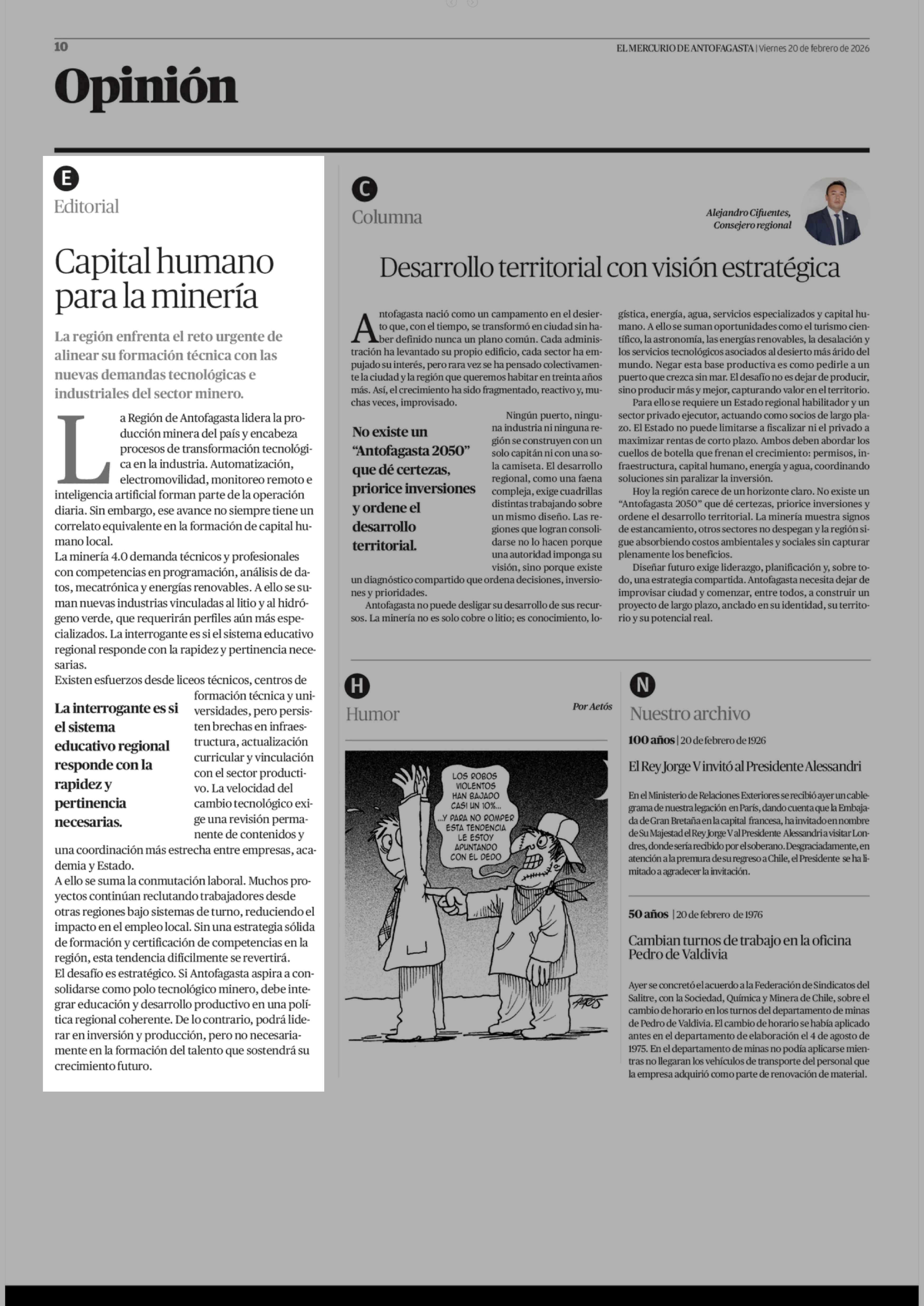 Editorial: Capital humano para la minería 20-02-2026 El Mercurio de Antofagasta |
