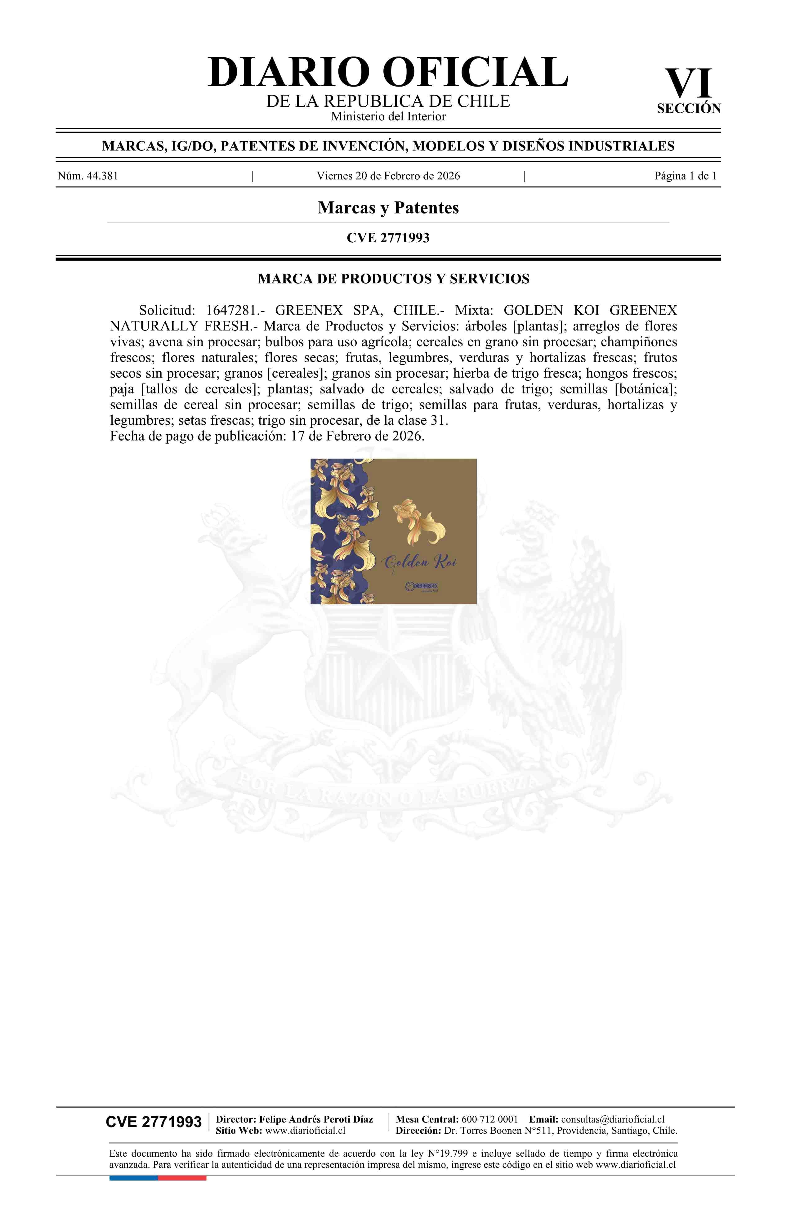 Solicitud número 1647281.- GOLDEN KOI GREENEX NATURALLY FRESH 20-02-2026 Diario Oficial Edición Electrónica |