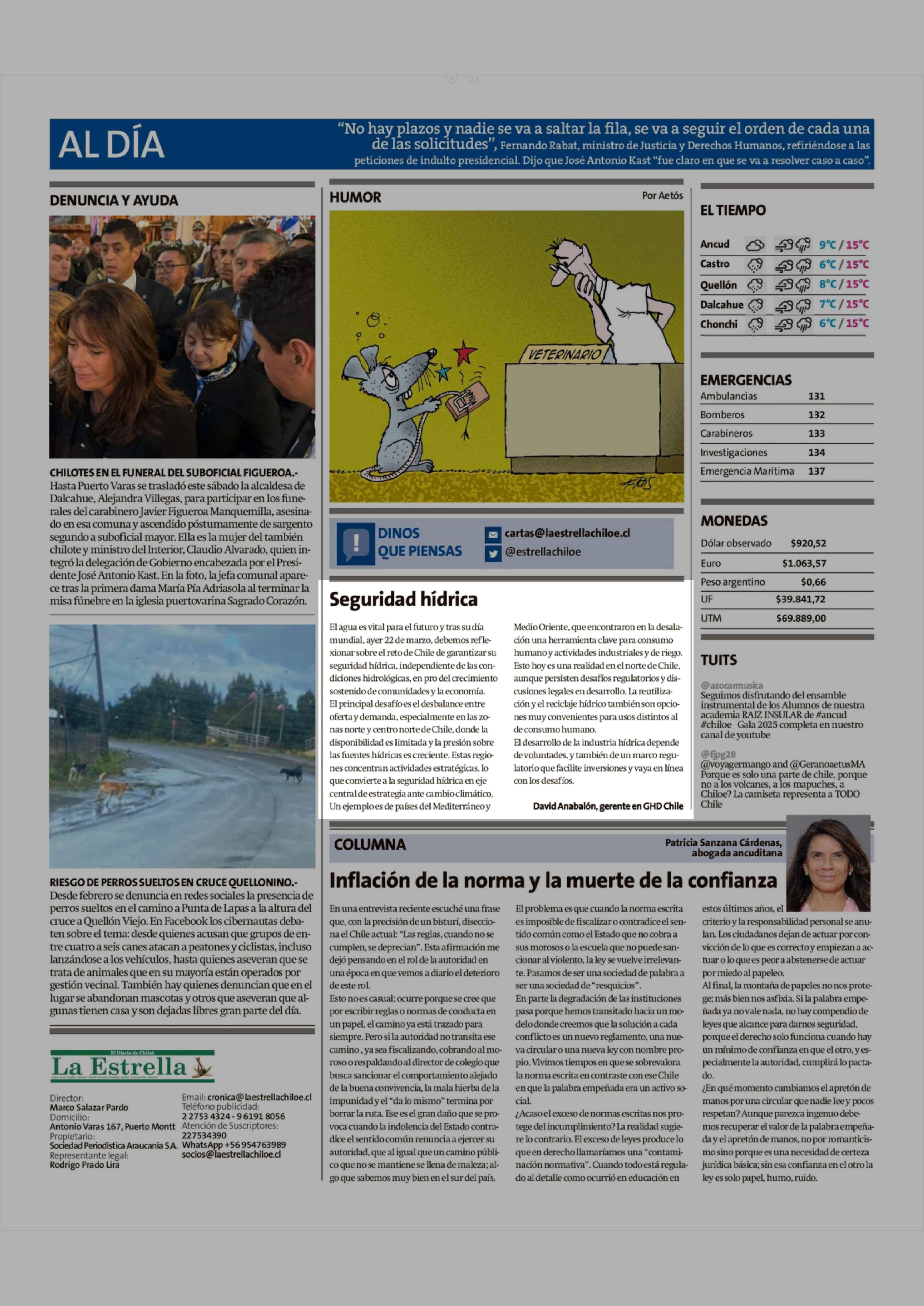 Cartas: Seguridad hídrica 23-03-2026 La Estrella de Chiloé |