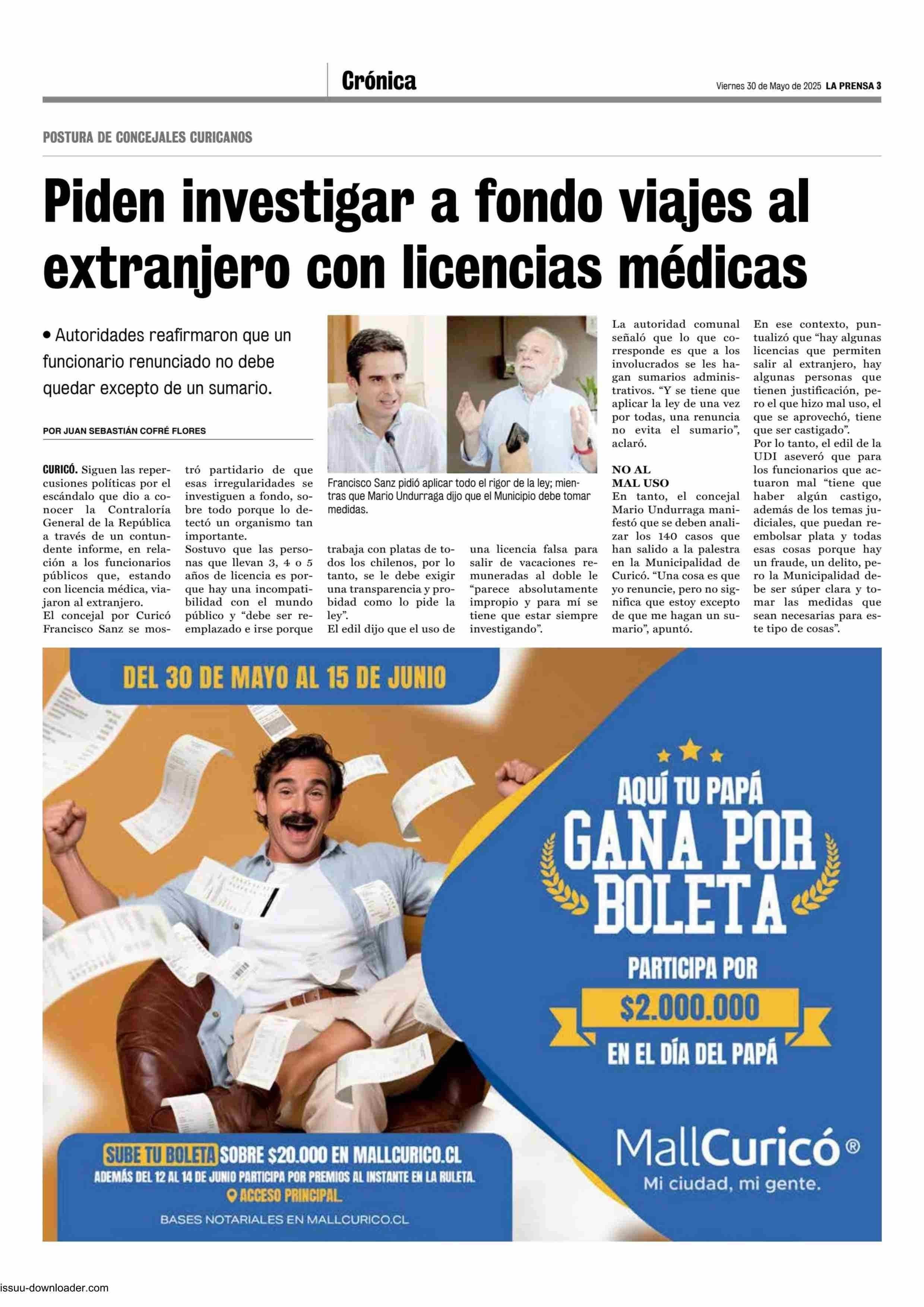 Piden investigar a fondo viajes al extranjero con licencias médicas 30-05-2025 La Prensa de Curicó |