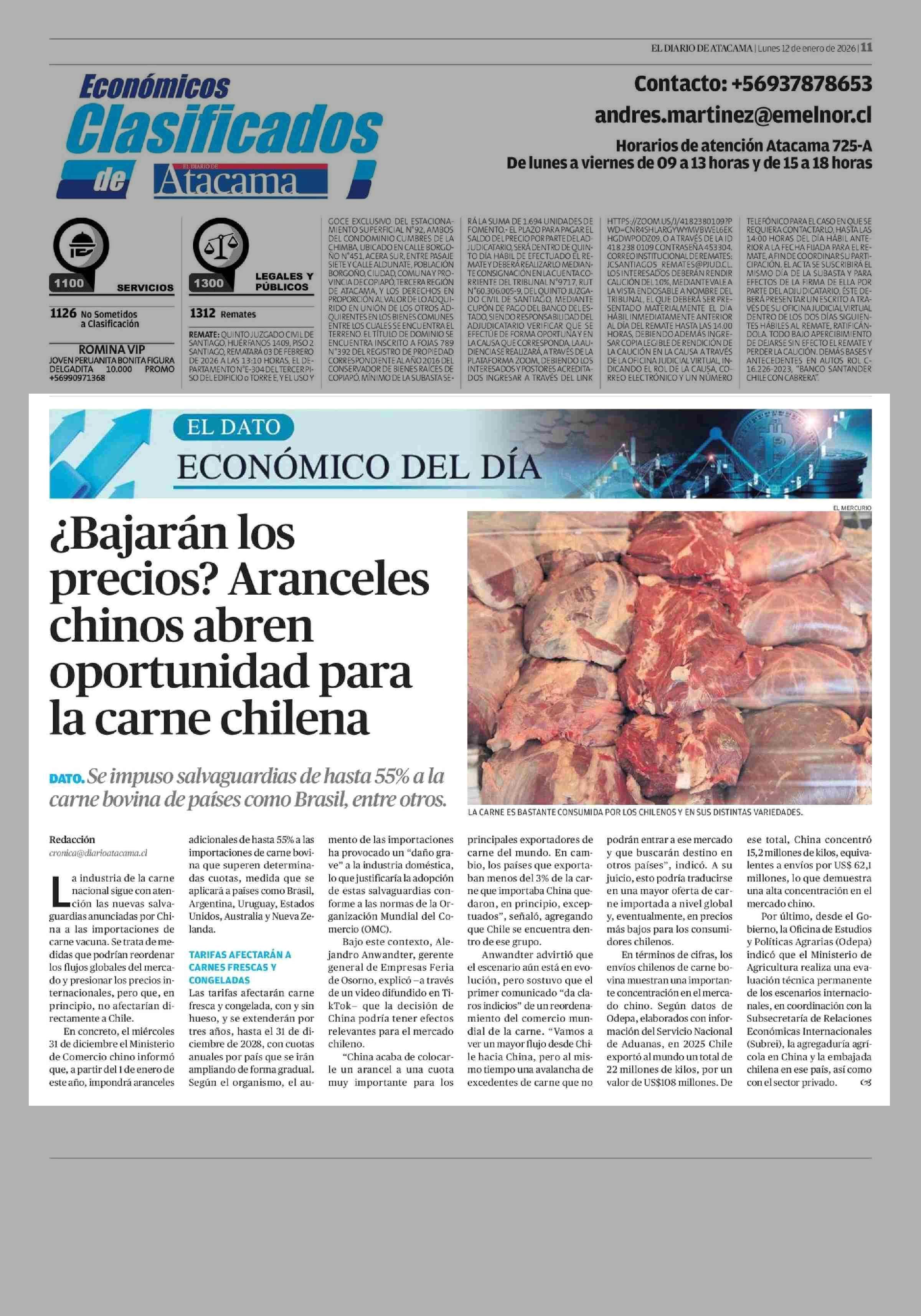 ¿Bajarán los precios? Aranceles chinos abren oportunidad para la carne chilena 12-01-2026 El Diario de Atacama |